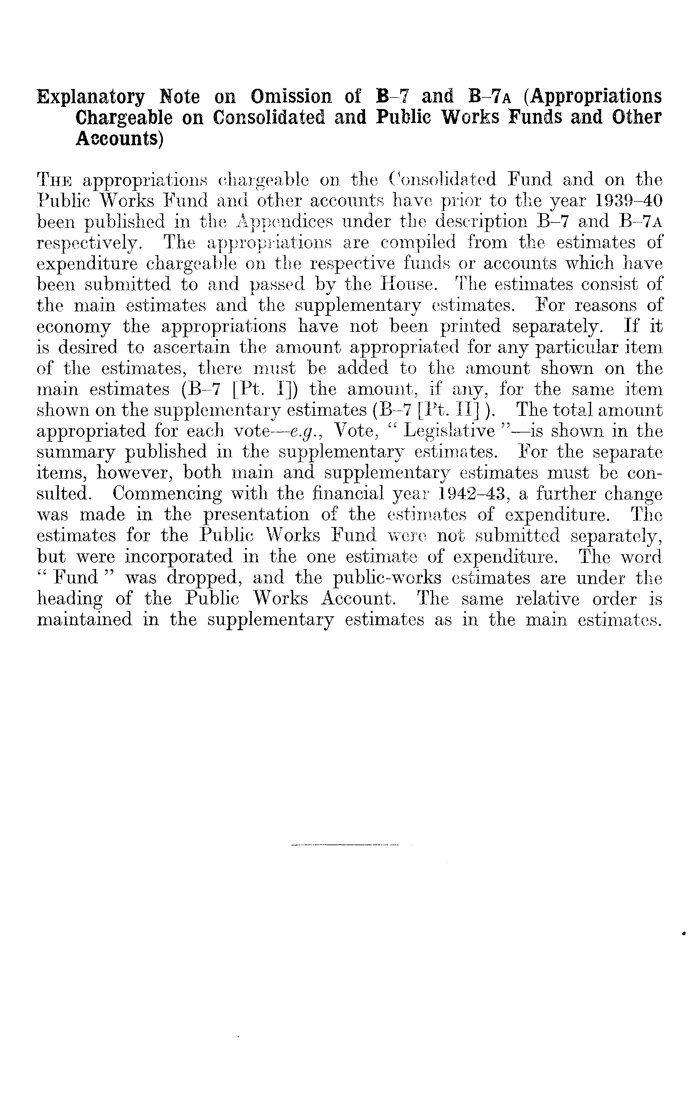 Explanatory Mote on Omission of B-7 and B-7a (Appropriations Chargeable on Consolidated and Public Works Funds and Other Accounts) The appropriations chargeable on the Consolidated Fund and on the Public Works Fund and other accounts have prior to the year 1939-40 been published in the Appendices under the description B-7 and B-7a respectively. The appropriations are compiled from the estimates of expenditure chargeable on the respective funds or accounts which have been submitted to and passed by the House. The estimates consist of the main estimates and the supplementary estimates. For reasons of economy the appropriations have not been printed separately. If it is desired to ascertain the amount appropriated for any particular item of the estimates, there must be added to the amount shown on the main estimates (B-7 [Pt. I]) the amount, if any, for the same item shown on the supplementary estimates (B-7 [Pt. II]). The total amount appropriated for each vote — e.g., Vote, " Legislative "•—is shown in the summary published in the supplementary estimates. For the separate items, however, both main and supplementary estimates must be consulted. Commencing with the financial year 1942—43, a further change was made in the presentation of the estimates of expenditure. The estimates for the Public Works Fund were not submitted separately, but were incorporated in the one estimate of expenditure. The word " Fund " was dropped, and the public-works estimates are under the heading of the Public Works Account. The same relative order is maintained in the supplementary estimates as in the main estimates.