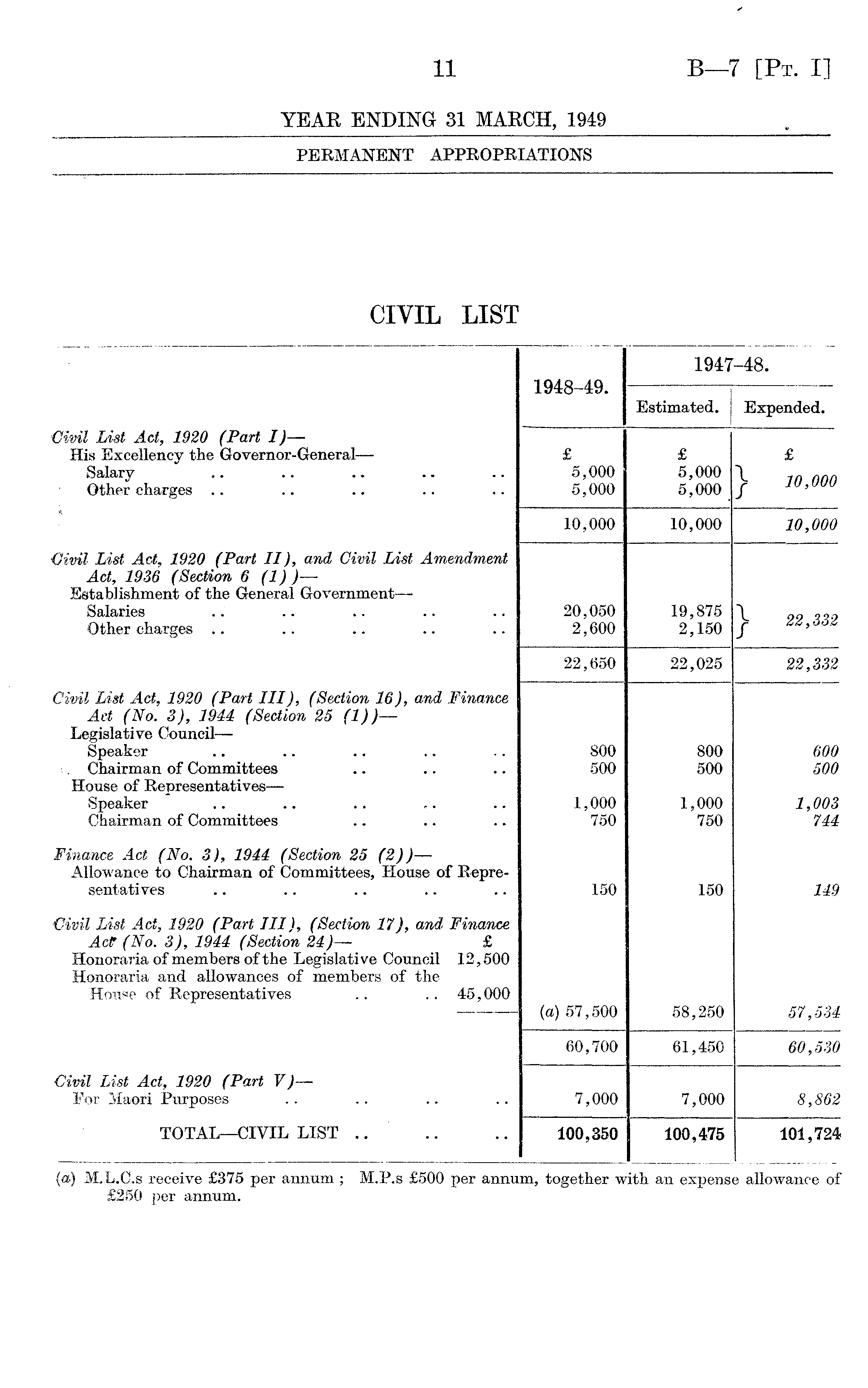 CIVIL LIST 1948-49. 1947-48. Estimated. Expended. Civil List Act, 1920 (Part I) — His Excellency the Governor-General— Salary Other charges .. £ 5,000 5,000 £ 5,000 5,000 £ y w,ooo - 10,000 10,000 10,000 •Civil List Act, 1920 (Part II), and Civil List Amendment Act, 1936 (Section 6 (1) )— Establishment of the General Government — Salaries Other charges 20,050 2,600 19,875 2,150 j. 22,332 22,650 22,025 22,332 Civil List Act, 1920 (Part III), (Section 16), and Finance Act (No. 3), 1944 (Section 25 (1)) — Legislative Council— Speaker i. Chairman of Committees House of Representatives— Speaker Chairman of Committees 800 500 1,000 750 800 500 1,000 750 600 500 1,003 744 Finance Act (No. 3), 1944 (Section 25 (2)) — Allowance to Chairman of Committees, House of Representatives 150 150 149 Civil List Act, 1920 (Part III), (Section 17), and Finance AcP (No. 3), 1944 (Section 24) — £ Honoraria of members of the Legislative Council 12,500 Honoraria and allowances of members of the House of Representatives .. .. 45,000 (a) 57,500 58,250 57,534 60,700 61,450 60,530 Civil List Act, 1920 (Part V) — For Maori Purposes 7,000 7,000 8,862 TOTAL—CIVIL LIST 100,350 100,475 101,724 (a) M.L.C.s receive £375 per annum ; M.P.s £500 per annum, together with an expense allowance of £250 per annum,