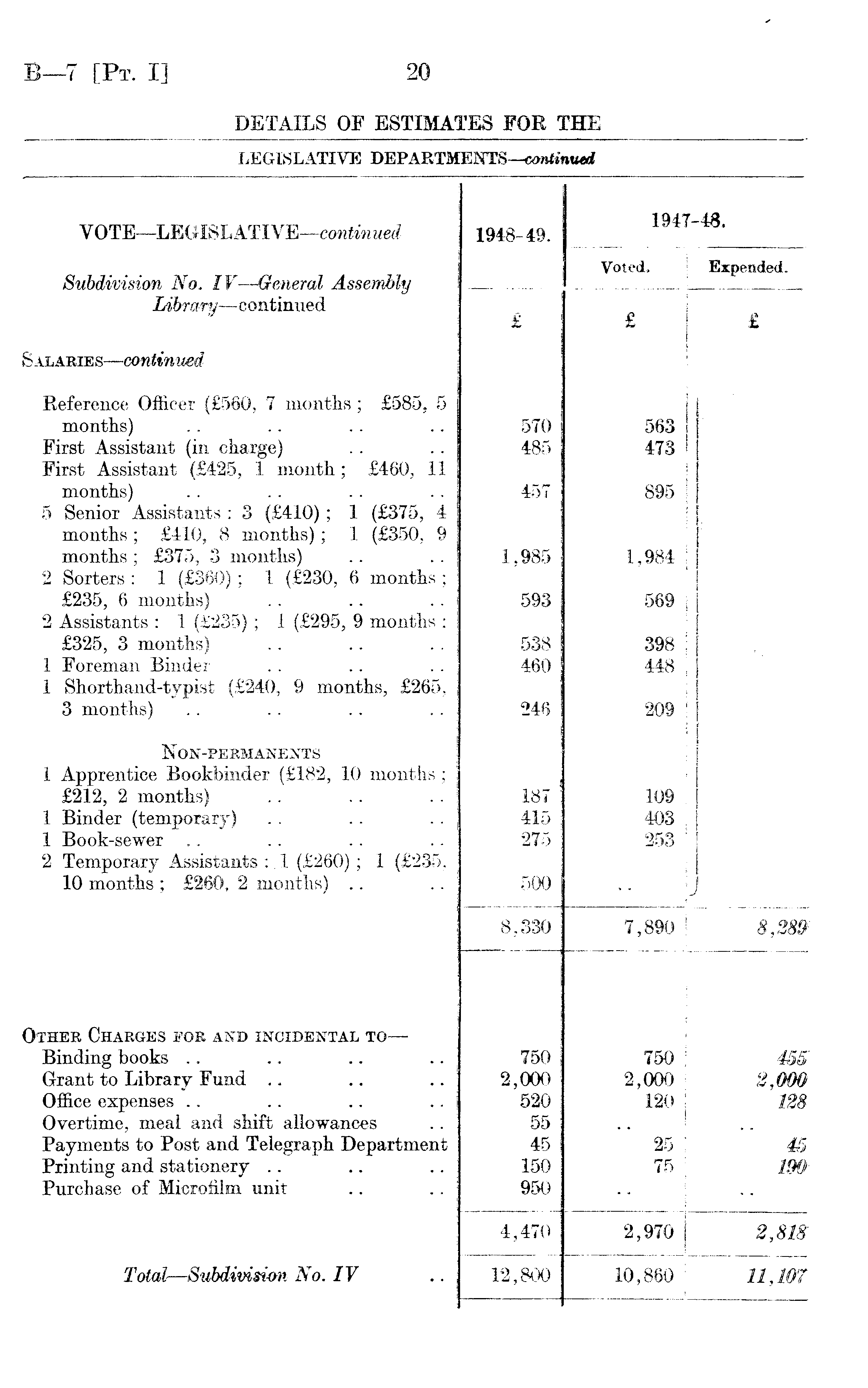 VOTE —LEGISLATIVE—continued 1948-49. 1947-48, Subdivision No. IV—General Assembly Library—continued Voted. Expended. £ £ £ Salaries—continued Reference Officer (£560, 7 months ; £585, 5 months) First Assistant (in charge) First Assistant (£425, 1 month; £460, 11 months) 5 Senior Assistants : 3 (£410); 1 (£375, 4 months ; £410, 8 months); 1 (£350, 9 months ; £375, 3 months) 2 Sorters : 1 (£360); 1 (£230, 6 months ; £235, 6 months) 2 Assistants : 1 (£235); 1 (£295, 9 months ; £325, 3 months) 1 Foreman Binder 1 Shorthand-typist (£240, 9 months, £265, 3 months) 570 485 457 1,985 593 538 460 246 563 473 895 1,984 569 ; 398 448 209 N ON-PERM ANENTS 1 Apprentice Bookbinder (£182, 10 months ; £212, 2 months) 1 Binder (temporary) 1 Book-sewer .. .. .. 2 Temporary Assistants :. 1 (£260); 1 (£235, 10 months ; £260, 2 months) .. 187 415 275 500 109 403 | 253 1 8,330 7,890 8,289 Other Charges for and incidental to — Binding books .. .. .. Grant to Library Fund Office expenses Overtime, meal and shift allowances Payments to Post and Telegraph Department Printing and stationery Purchase of Microfilm unit 750 2,000 520 55 45 150 950 750 1 2,000 i 120 25 J 75 ! 455' 2,000 128 45 190 4,470 2,970 2,818 Total —Subdivision No. IV 12,800 10,860 | 1 11,107
