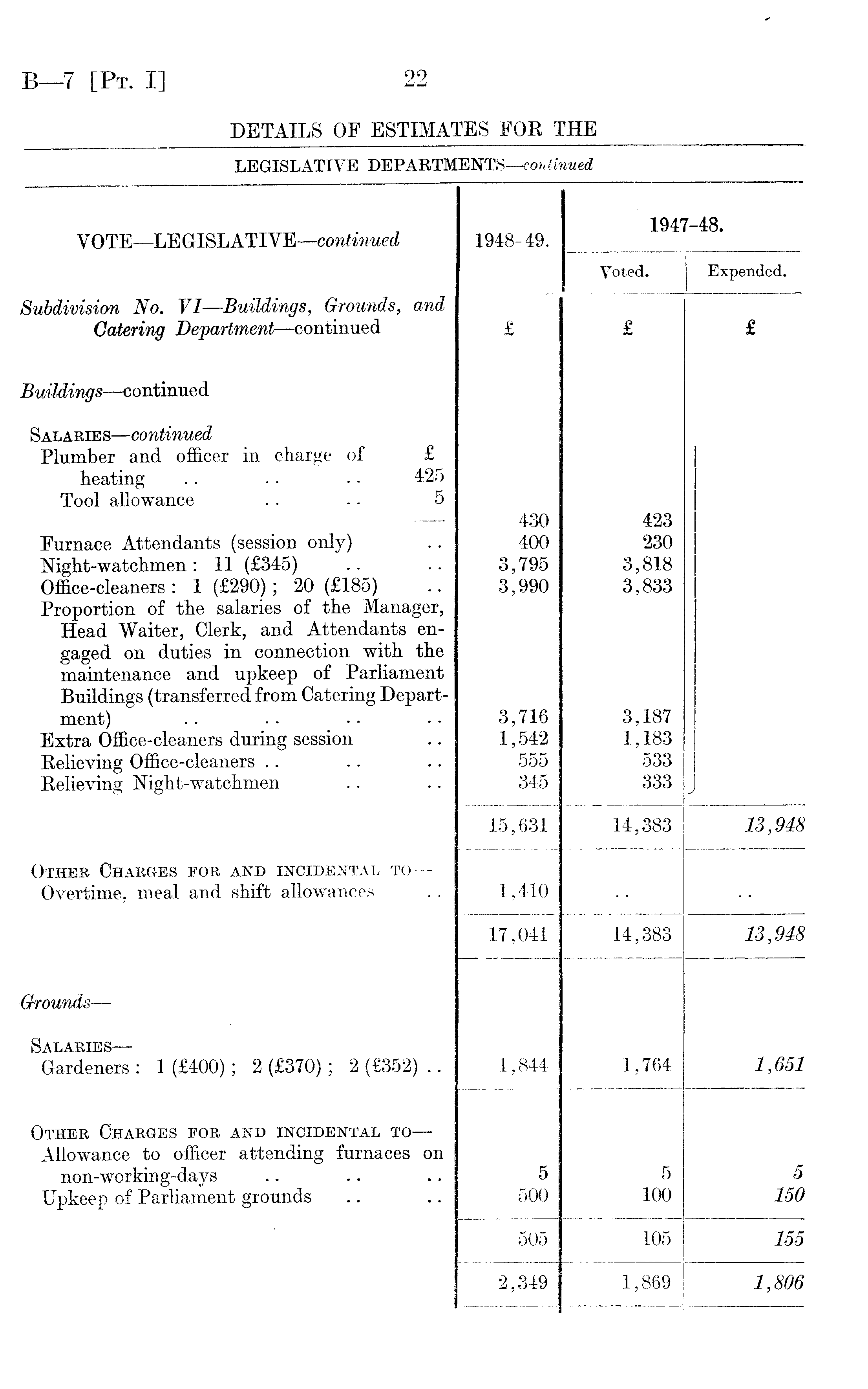 VOTE —LEGISLATIVE —continued 1948-49. 1947-48. Voted. Expended. Subdivision No. VI —Buildings, Grounds, and Catering Department —continued £ £ £ Buildings —continued Salaries —continued Plumber and officer in charge of £ heating .. . - . • 425 Tool allowance .. .. 5 Furnace Attendants (session only) Night-watchmen : 11 (£345) Office-cleaners : 1 (£290); 20 (£185) Proportion of the salaries of the Manager, Head Waiter, Clerk, and Attendants engaged on duties in connection with the maintenance and upkeep of Parliament Buildings (transferred from Catering Department) Extra Office-cleaners during session Relieving Office-cleaners Relieving Night-watchmen 430 400 3,795 3,990 3,716 1,542 555 345 423 230 3,818 3,833 3,187 1,183 533 333 15,631 14,383 13,948 Other Charges for and incidental to — Overtime, meal and shift allowances 1,410 17,041 14,383 13,948 Grounds — Salaries — Gardeners : 1 (£400); 2 (£370); 2 (£352) .. 1,844 1,764 1,651 Other Charges for and incidental to — Allowance to officer attending furnaces on non-working-days Upkeep of Parliament grounds 5 500 5 100 5 150 505 105 155 2,349 1,869 1,806