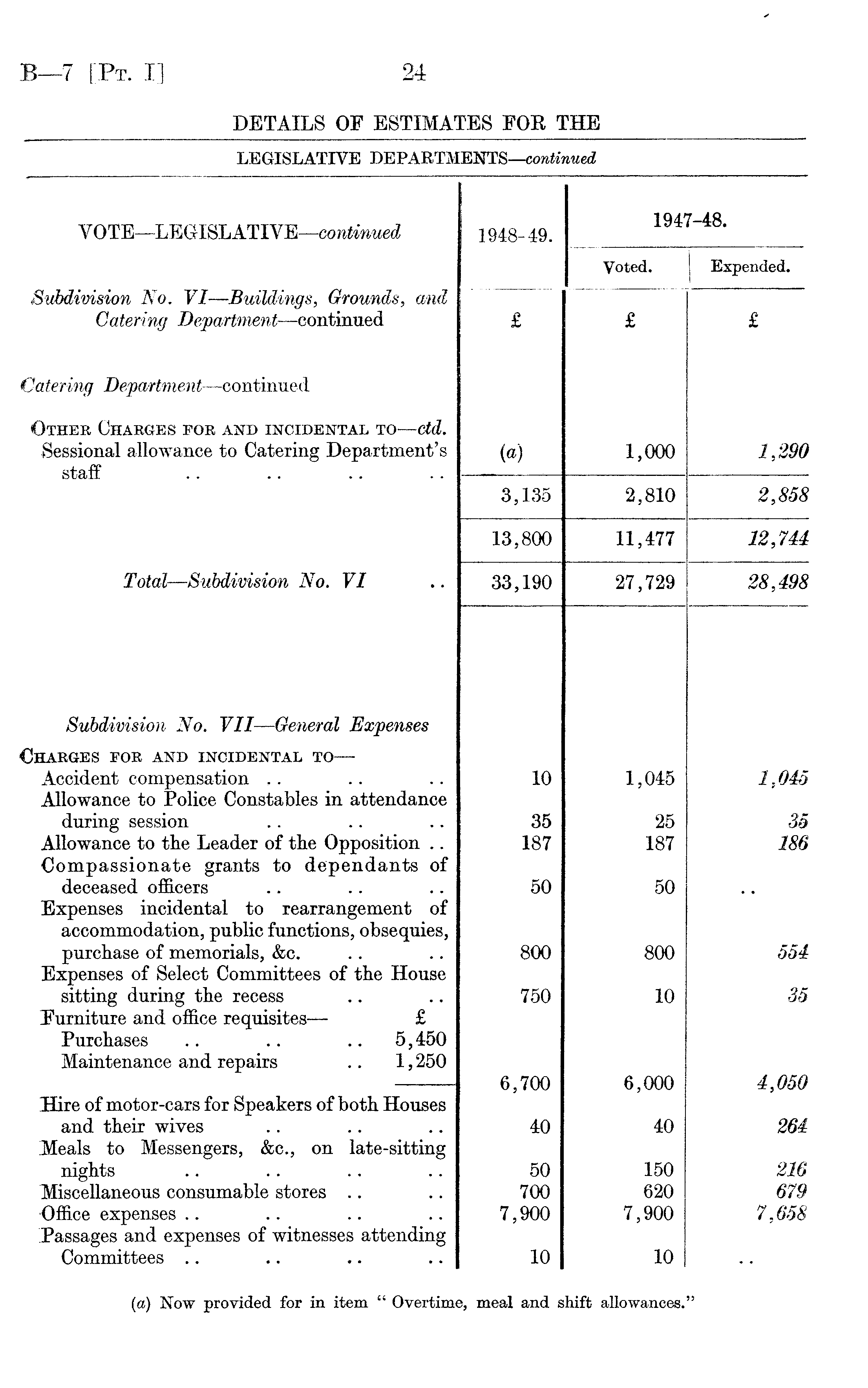 YOTE —LEGISLATIVE—continued 1948-49. 1947-48. Voted. Expended. Subdivision No. VI —Buildings, Grounds, and Catering Department —continued £ £ £ Catering Department—continued Other Charges for and incidental to —ctd. Sessional allowance to Catering Department's staff (a) 1,000 1,290 3,135 2,810 2,858 13,800 11,477 12,744 Total—Subdivision No. VI 33,190 27,729 28,498 Subdivision No. VII —General Expenses Charges for and incidental to — Accident compensation Allowance to Police Constables in attendance during session Allowance to the Leader of the Opposition .. Compassionate grants to dependants of deceased officers Expenses incidental to rearrangement of accommodation, public functions, obsequies, purchase of memorials, &c. Expenses of Select Committees of the House sitting during the recess Eurniture and office requisites— £ Purchases .. .. .. 5,450 Maintenance and repairs .. 1,250 10 35 187 50 800 750 6,700 40 50 700 7,900 10 1,045 25 187 50 800 10 6,000 40 150 620 7,900 10 1,045 35 186 554 35 4,050 264 216 679 7,658 Hire of motor-cars for Speakers of both Houses and their wives Meals to Messengers, &c., on late-sitting nights Miscellaneous consumable stores Office expenses Passages and expenses of witnesses attending Committees (a) Now provided for in item " Overtime, meal and shift allowances. »