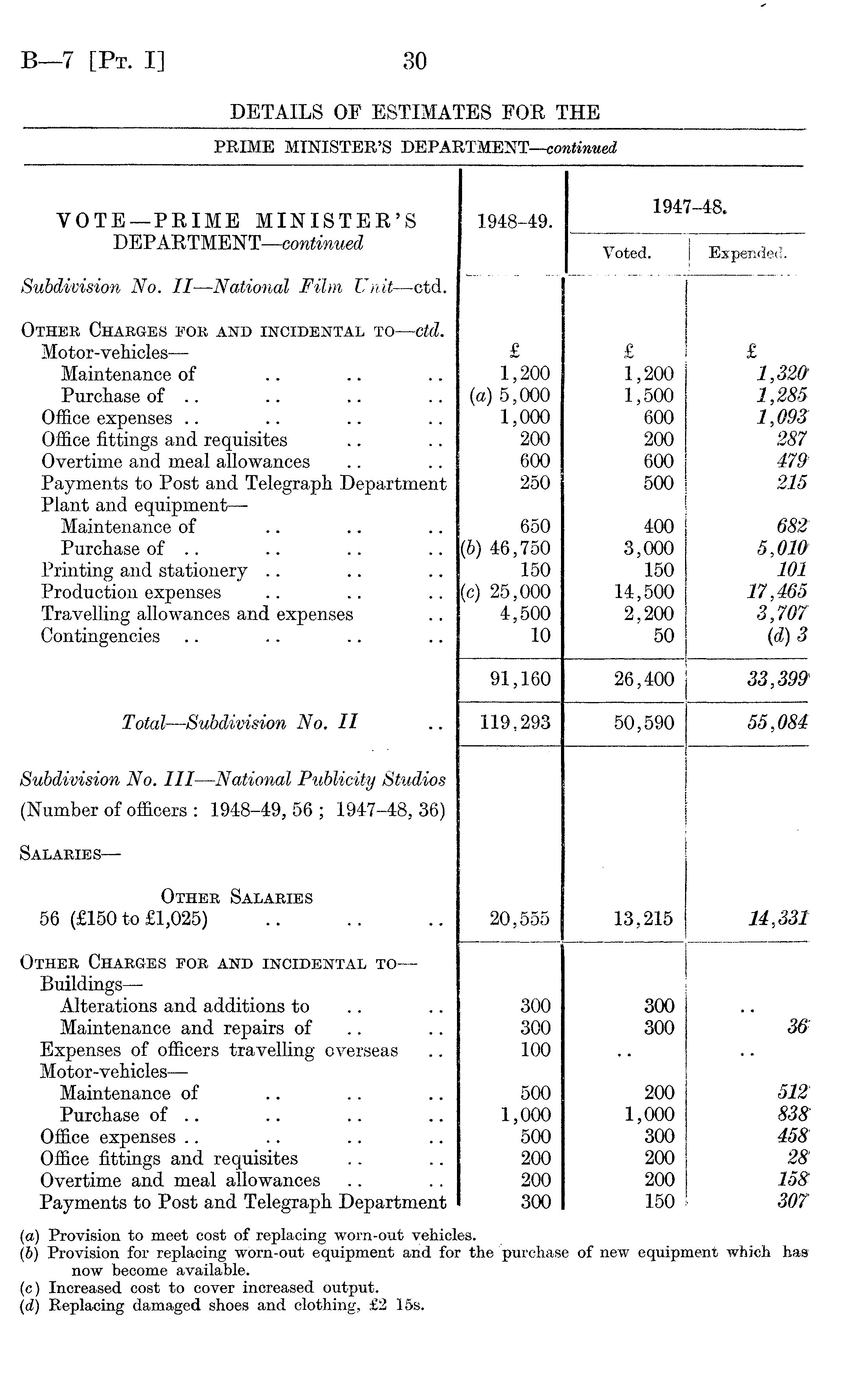 1947-48. VOTE— PEIME MINISTER'S 1948-49. DEPARTMENT— continued Voted. 1 Expended. Subdivision No. II — National Film Unit —ctd. Other Charges for and incidental to— ctd. Motor-vehicles — £ £ £ Maintenance of 1,200 1,200 1,320 Purchase of .. (a) 5,000 1,500 1,285 Office expenses 1,000 600 1,093 Office fittings and requisites 200 200 287 Overtime and meal allowances 600 600 479 Payments to Post and Telegraph Department 250 500 215 Plant and equipment — Maintenance of 650 400 682 Purchase of .. (6) 46,750 3,000 5,010 Printing and stationery 150 150 101 Production expenses (c) 25,000 14,500 17,465 Travelling allowances and expenses 4,500 2,200 3,707 Contingencies 10 50 id) 3 91,160 26,400 33,399 Total — Subdivision No. II 119,293 50,590 55,084 Subdivision No. Ill—National Publicity Studios (Number of officers: 1948-49,56; 1947-48,36) Salaries — Other Salaries 56 (£150 to £1,025) 20,555 13,215 14,331 Other Charges eor and incidental to — Buildings— Alterations and additions to 300 300 . . Maintenance and repairs of 300 300 36 Expenses of officers travelling overseas 100 Motor-vehicles — Maintenance of 500 200 512 Purchase of .. 1,000 1,000 838 Office expenses 500 300 458 Office fittings and requisites 200 200 28 Overtime and meal allowances 200 200 158 Payments to Post and Telegraph Department 300 150 307