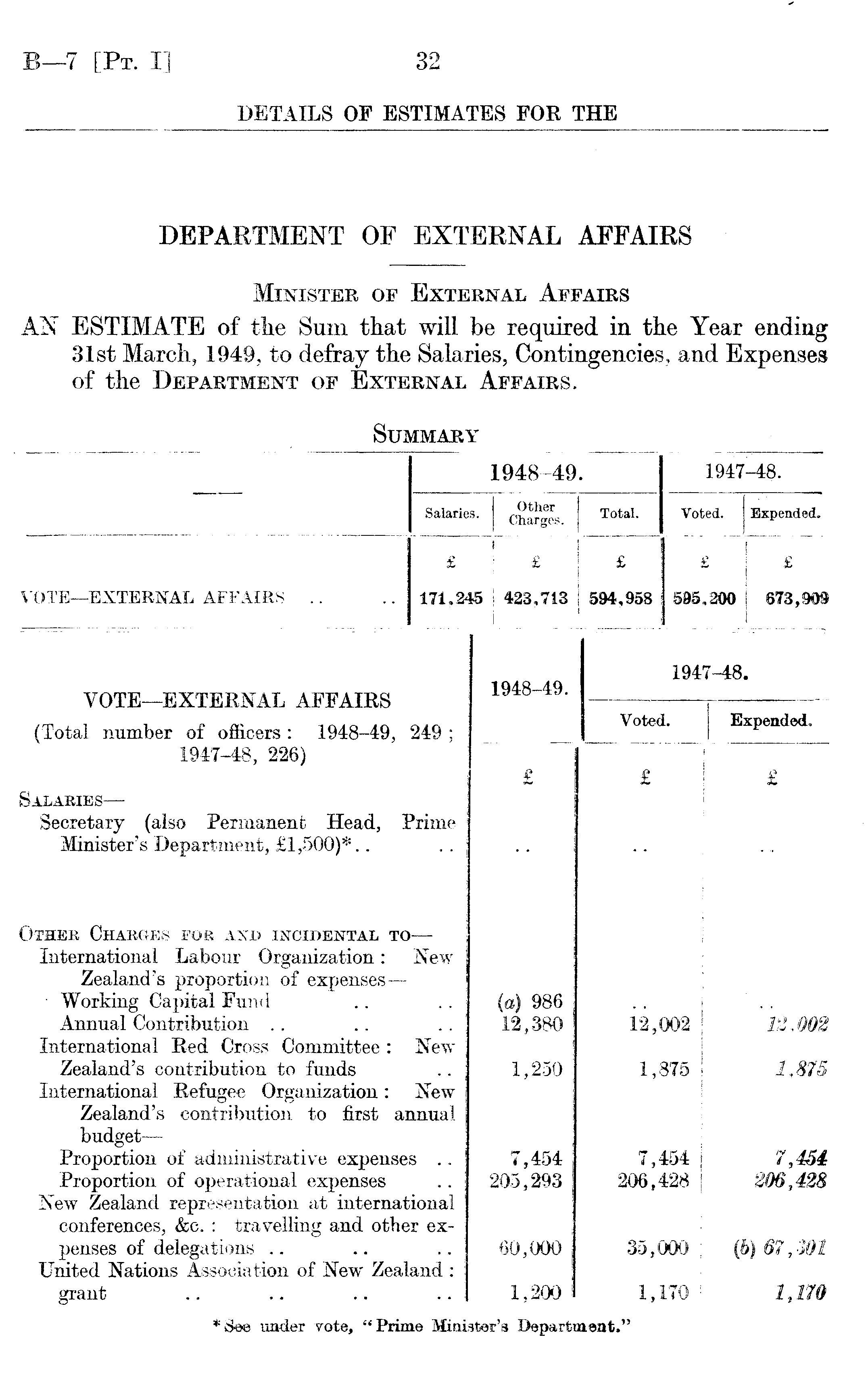 1948-49 . 1947-48., Salaries. Other Charges. Total. Voted. J Expended. £ j £ £ £ | i £ VOTE —EXTERNAL AFFAIRS 171,245 i 423,713 1 594,958 595,200 673,909 1 VOTE—EXTERNAL AFFAIRS (Total number of officers : 1948-49, 1948-49. 1947-48, 249 ; Voted. Expended. 1947-48, 226) Salaries — Secretary (also Permanent Head, Prime Minister's Department, £1,500)*.. £ £ £ Other Charges for and incidental to — International Labour Organization: New Zealand's proportion of expenses— Working Capital Fund Annual Contribution International Red Cross Committee : New Zealand's contribution to funds International Refugee Organization: New Zealand's contribution to first annual budget— Proportion of administrative expenses .. Proportion of operational expenses New Zealand representation at international conferences, &c. : travelling and other expenses of delegations United Nations Association of New Zealand : grant (a) 986 12,380 1,250 7,454 205,293 60,000 1,200 12,002 1,875 ! 7,454 | 206,428 | 35,000 | 1,170 1 12,002 1,875 7,454 206,428 (ib) 67,301 1,170 * See under vote, "Prime Minister's Department."