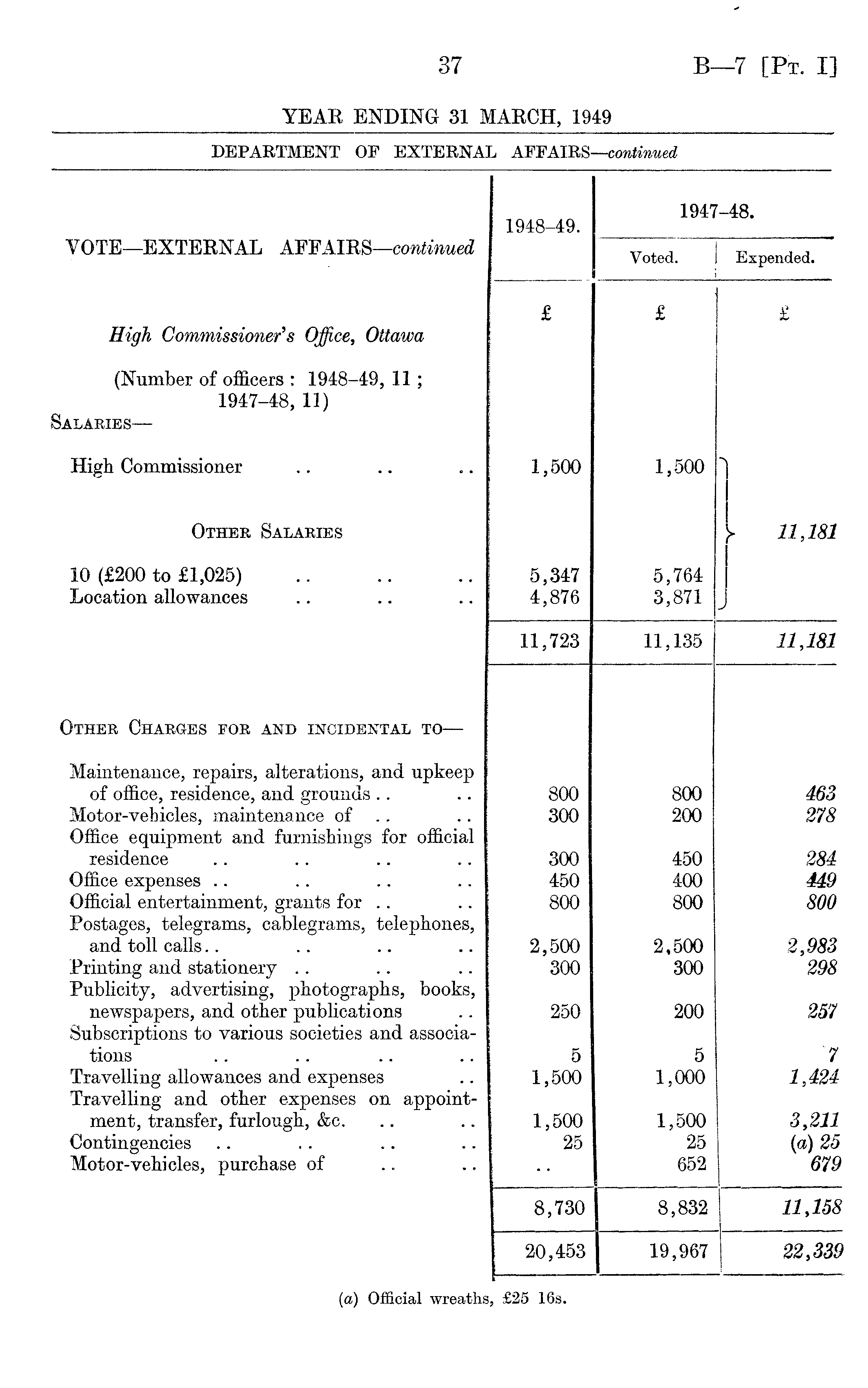1948-49. 1947-48. VOTE—EXTERNAL AFFAIRS—continued Voted. Expended. High Commissioner's Office, Ottawa £ £ £ (Number of officers : 1948-49, 11; 1947-48, 11) Salaries— High Commissioner 1,500 1,500 - Other Salaries y n,i8i 10 (£200 to £1,025) Location allowances 5,347 4,876 5,764 3,871 11,723 11,135 11,181 Other Charges for and incidental to — Maintenance, repairs, alterations, and upkeep of office, residence, and grounds Motor-vebicles, maintenance of .. Office equipment and furnishings for official residence Office expenses Official entertainment, grants for .. Postages, telegrams, cablegrams, telephones, and toll calls Printing and stationery Publicity, advertising, photographs, books, newspapers, and other publications Subscriptions to various societies and associations Travelling allowances and expenses Travelling and other expenses on appointment, transfer, furlough, &c. Contingencies Motor-vehicles, purchase of 800 300 300 450 800 2,500 300 250 5 1,500 1,500 25 800 200 450 400 800 2,500 300 200 5 1,000 1,500 25 652 463 278 284 449 800 2,983 298 257 7 1,424 3,211 (a) 25 679 8,730 8,832 11,158 20,453 19,967 22,339 (a) Official wreaths, £25 16s.
