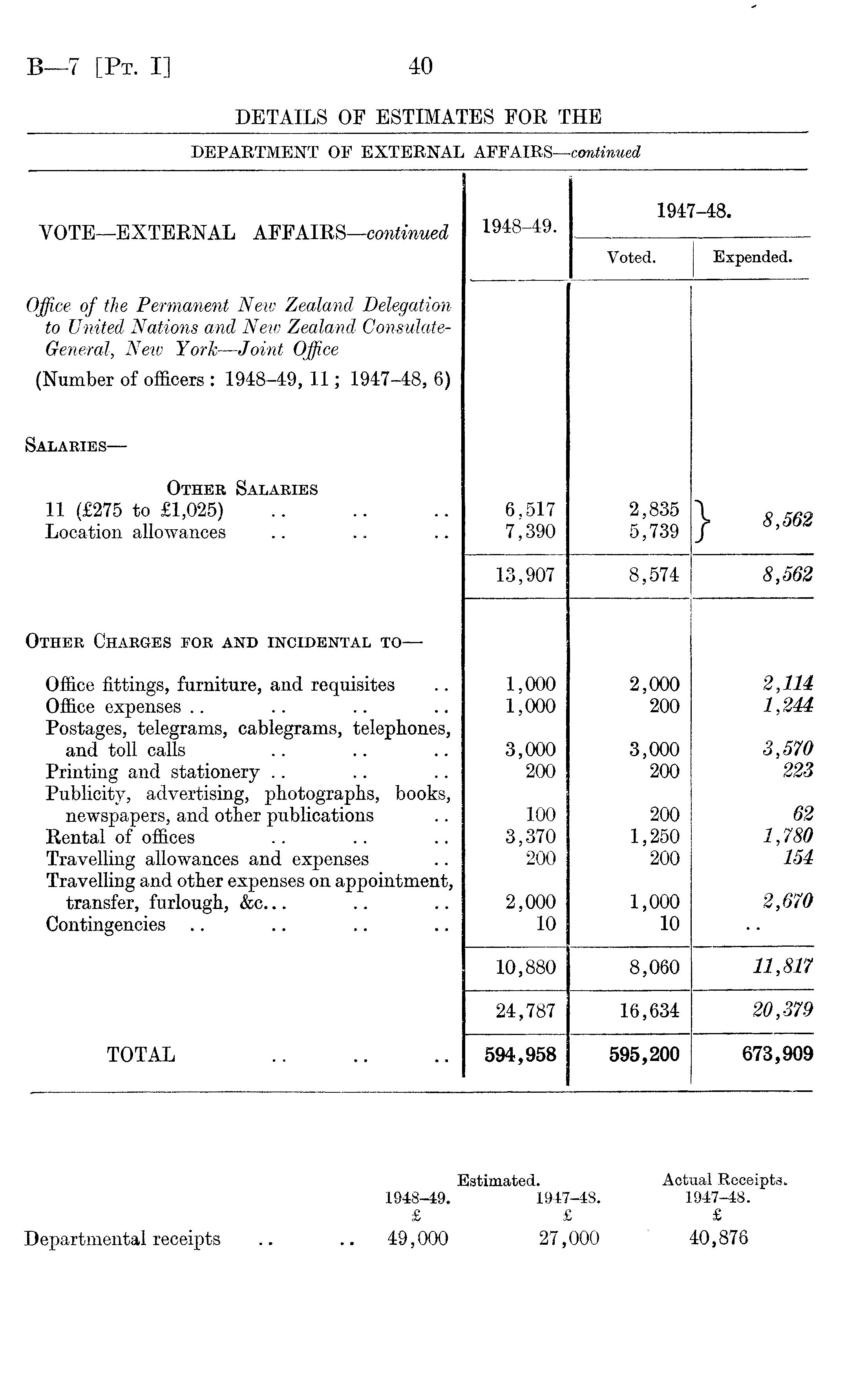 Estimated. Actual Receipts. 1948-49. 1947-48. 1947-48. £ £ £ Departmental receipts .. .. 49,000 27,000 40,876