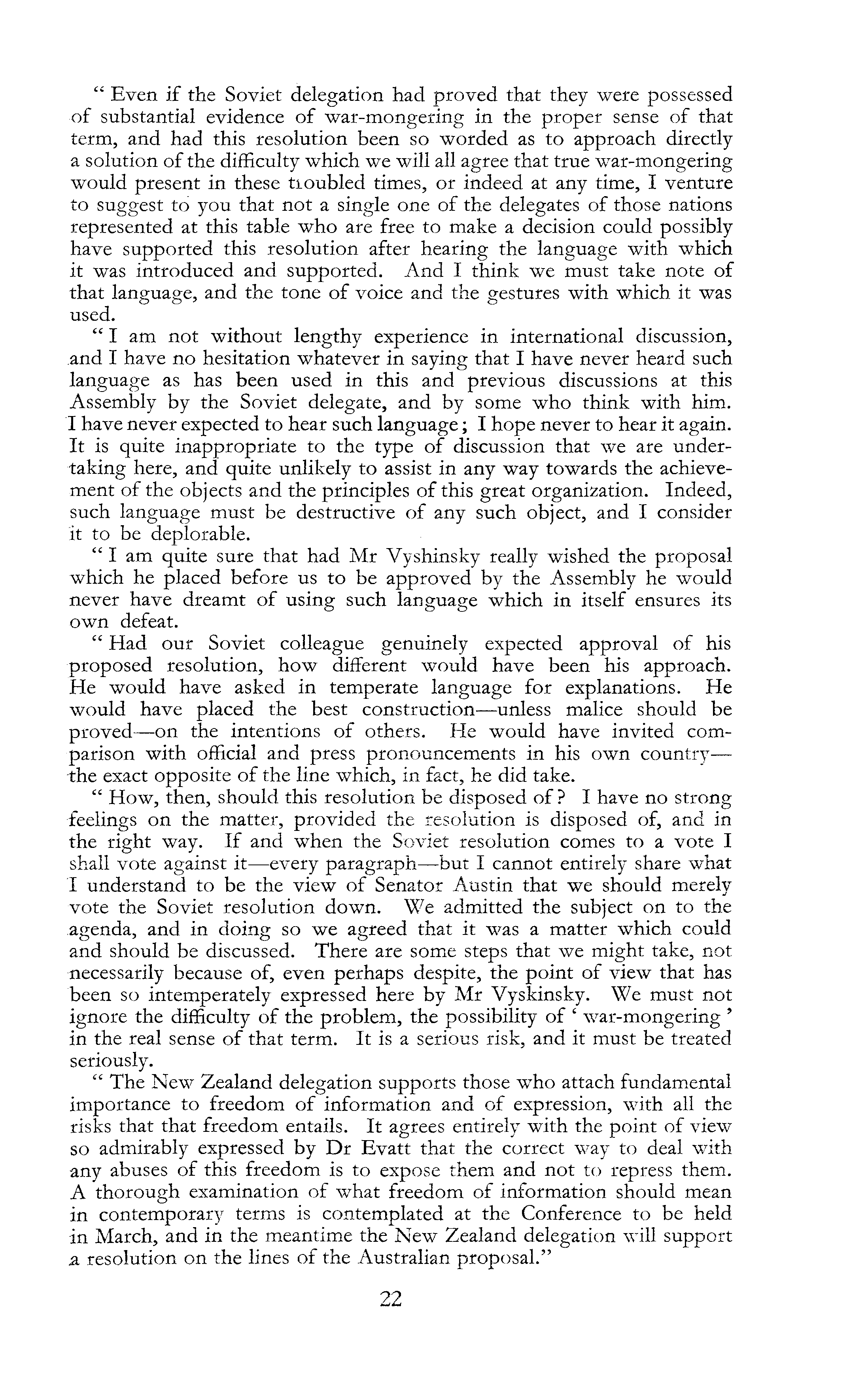 " Even if the Soviet delegation had proved that they were possessed of substantial evidence of war-mongering in the proper sense of that term, and had this resolution been so worded as to approach directly a solution of the difficulty which we will all agree that true war-mongering would present in these tioubled times, or indeed at any time, I venture to suggest to you that not a single one of the delegates of those nations represented at this table who are free to make a decision could possibly have supported this resolution after hearing the language with which it was introduced and supported. And I think we must take note of that language, and the tone of voice and the gestures with which it was used. " I am not without lengthy experience in international discussion, and I have no hesitation whatever in saying that I have never heard such language as has been used in this and previous discussions at this Assembly by the Soviet delegate, and by some who think with him. I have never expected to hear such language; I hope never to hear it again. It is quite inappropriate to the type of discussion that we are undertaking here, and quite unlikely to assist in any way towards the achievement of the objects and the principles of this great organization. Indeed, such language must be destructive of any such object, and I consider it to be deplorable. " I am quite sure that had Mr Vyshinsky really wished the proposal which he placed before us to be approved by the Assembly he would never have dreamt of using such language which in itself ensures its own defeat. " Had our Soviet colleague genuinely expected approval of his proposed resolution, how different would have been his approach. He would have asked in temperate language for explanations. He would have placed the best construction—unless malice should be proved—on the intentions of others. He would have invited comparison with official and press pronouncements in his own country — the exact opposite of the line which, in fact, he did take. " How, then, should this resolution be disposed of ? I have no strong feelings on the matter, provided the resolution is disposed of, and in the right way. If and when the Soviet resolution comes to a vote I shall vote against it—every paragraph —but I cannot entirely share what I understand to be the view of Senator Austin that we should merely vote the Soviet resolution down. We admitted the subject on to the agenda, and in doing so we agreed that it was a matter which could and should be discussed. There are some steps that we might take, not necessarily because of, even perhaps despite, the point of view that has been so intemperately expressed here by Mr Vyskinsky. We must not ignore the difficulty of the problem, the possibility of ' war-mongering ' in the real sense of that term. It is a serious risk, and it must be treated seriously. " The New Zealand delegation supports those who attach fundamental importance to freedom of information and of expression, with all the risks that that freedom entails. It agrees entirely with the point of view so admirably expressed by Dr Evatt that the correct way to deal with any abuses of this freedom is to expose them and not to repress them. A thorough examination of what freedom of information should mean in contemporary terms is contemplated at the Conference to be held in March, and in the meantime the New Zealand delegation will support a resolution on the lines of the Australian proposal."