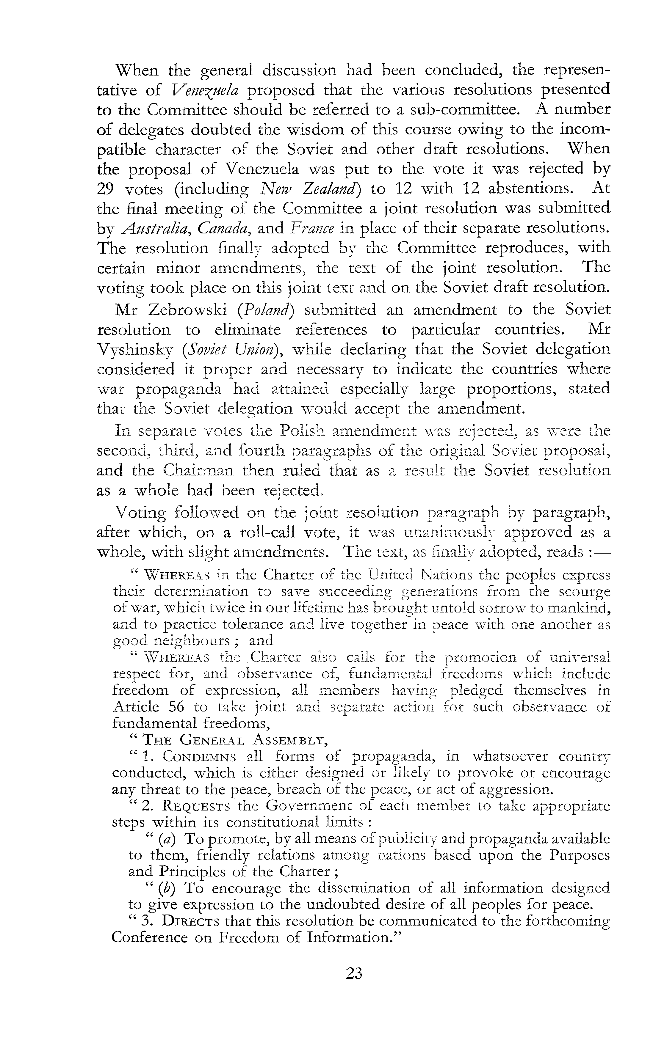 When the general discussion had been concluded, the representative of Venezuela proposed that the various resolutions presented to the Committee should be referred to a sub-committee. A number of delegates doubted the wisdom of this course owing to the incompatible character of the Soviet and other draft resolutions. When the proposal of Venezuela was put to the vote it was rejected by 29 votes (including New Zealand) to 12 with 12 abstentions. At the final meeting of the Committee a joint resolution was submitted by Australia, Canada, and France in place of their separate resolutions. The resolution finally adopted by the Committee reproduces, with certain minor amendments, the text of the joint resolution. The voting took place on this joint text and on the Soviet draft resolution. Mr Zebrowski {Poland) submitted an amendment to the Soviet resolution to eliminate references to particular countries. Mr Vyshinsky (Soviet Union), while declaring that the Soviet delegation considered it proper and necessary to indicate the countries where war propaganda had attained especially large proportions, stated that the Soviet delegation would accept the amendment. In separate votes the Polish amendment was rejected, as were the second, third, and fourth paragraphs of the original Soviet proposal, and the Chairman then ruled that as a result the Soviet resolution as a whole had been rejected. Voting followed on the joint resolution paragraph by paragraph, after which, on a roll-call vote, it was unanimously approved as a whole, with slight amendments. The text, as finally adopted, reads : " Whereas in the Charter of the United Nations the peoples express their determination to save succeeding generations from the scourge of war, which twice in our lifetime has brought untold sorrow to mankind, and to practice tolerance and live together in peace with one another as good neighbours ; and " Whereas the .Charter also calls for the promotion of universal respect for, and observance of, fundamental freedoms which include freedom of expression, all members having pledged themselves in Article 56 to take joint and separate action for such observance of fundamental freedoms, " The General Assembly, "1. Condemns all forms of propaganda, in whatsoever country conducted, which is either designed or likely to provoke or encourage any threat to the peace, breach of the peace, or act of aggression. " 2. Requests the Government of each member to take appropriate steps within its constitutional limits : " (a) To promote, by all means of publicity and propaganda available to them, friendly relations among nations based upon the Purposes and Principles of the Charter ; " (b) To encourage the dissemination of all information designed to give expression to the undoubted desire of all peoples for peace. "3. Directs that this resolution be communicated to the forthcoming Conference on Freedom of Information."