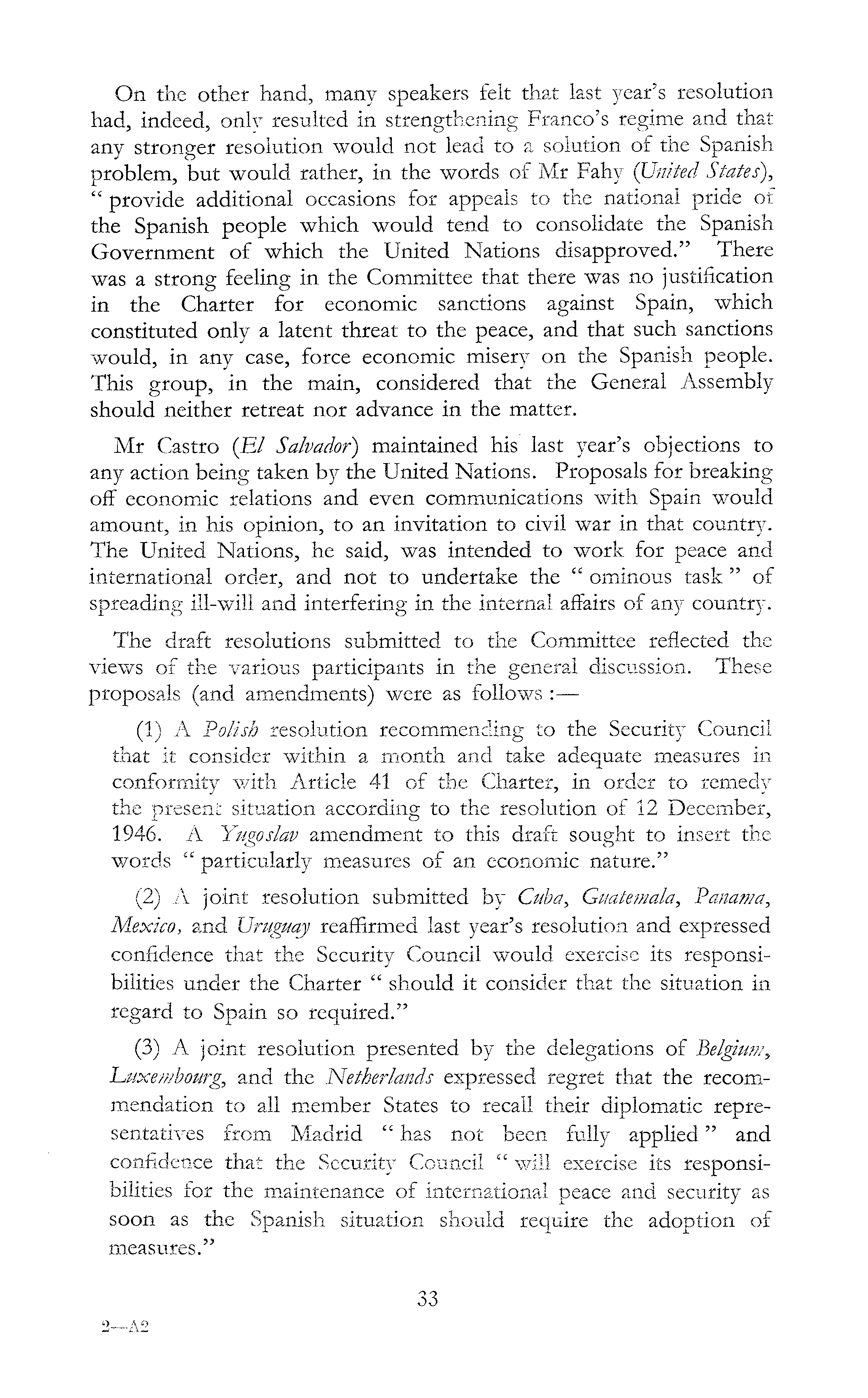 On the other hand, many speakers felt that last year's resolution had, indeed, only resulted in strengthening Franco's regime and that any stronger resolution would not lead to a solution of the Spanish problem, but would rather, in the words of Mr Fahy (United States), " provide additional occasions for appeals to the national pride of the Spanish people which would tend to consolidate the Spanish Government of which the United Nations disapproved." There was a strong feeling in the Committee that there was no justification in the Charter for economic sanctions against Spain, which constituted only a latent threat to the peace, and that such sanctions would, in any case, force economic misery on the Spanish people. This group, in the main, considered that the General Assembly should neither retreat nor advance in the matter. Mr Castro (El Salvador) maintained his last year's objections to any action being taken by the United Nations. Proposals for breaking off economic relations and even communications with Spain would amount, in his opinion, to an invitation to civil war in that country. The United Nations, he said, was intended to work for peace and international order, and not to undertake the " ominous task " of spreading ill-will and interfering in the internal affairs of any country. The draft resolutions submitted to the Committee reflected the views of the various participants in the general discussion. These proposals (and amendments) were as follows : (1) A Polish resolution recommending to the Security Council that it consider within a month and take adequate measures in conformity with Article 41 of the Charter, in order to remedy the present situation according to the resolution of 12 December, 1946. A Yugoslav amendment to this draft sought to insert the words " particularly measures of an economic nature." (2) A joint resolution submitted by Cuba, Guatemala, Panama, Mexico, and Uruguay reaffirmed last year's resolution and expressed confidence that the Security Council would exercise its responsibilities under the Charter " should it consider that the situation in regard to Spain so required." (3) A joint resolution presented by the delegations of Belgium, Luxembourg, and the Netherlands expressed regret that the recommendation to all member States to recall their diplomatic representatives from Madrid " has not been fully applied" and confidence that the Security Council " will exercise its responsibilities for the maintenance of international peace and security as soon as the Spanish situation should require the adoption of measures."