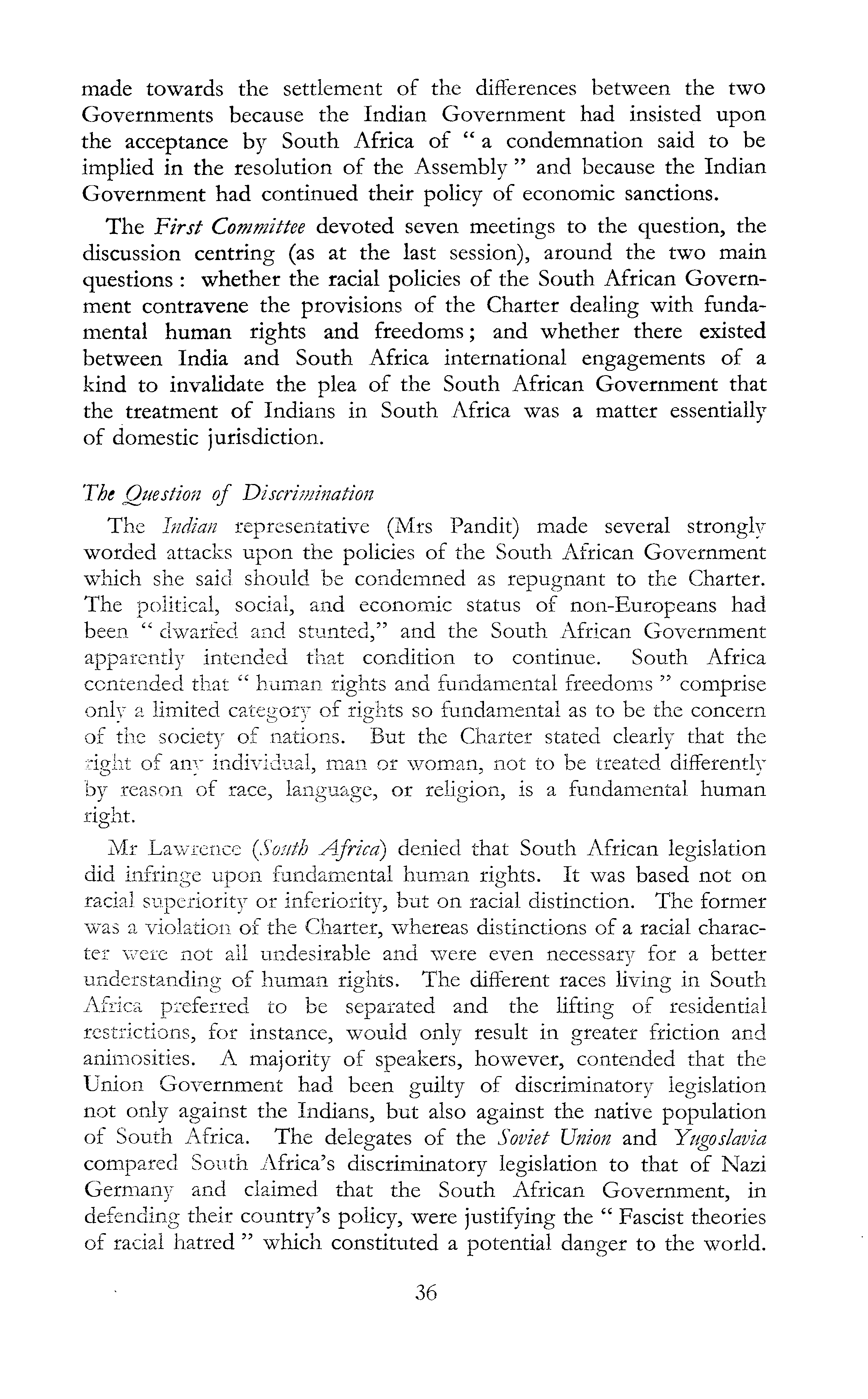 made towards the settlement of the differences between the two Governments because the Indian Government had insisted upon the acceptance by South Africa of " a condemnation said to be implied in the resolution of the Assembly " and because the Indian Government had continued their policy of economic sanctions. The First Committee devoted seven meetings to the question, the discussion centring (as at the last session), around the two main questions : whether the racial policies of the South African Government contravene the provisions of the Charter dealing with fundamental human rights and freedoms; and whether there existed between India and South Africa international engagements of a kind to invalidate the plea of the South African Government that the treatment of Indians in South Africa was a matter essentially of domestic jurisdiction. The Question of Discrimination The Indian representative (Mrs Pandit) made several strongly worded attacks upon the policies of the South African Government which she said should be condemned as repugnant to the Charter. The political, social, and economic status of non-Europeans had been " dwarfed and stunted," and the South African Government apparently intended that condition to continue. South Africa contended that " human rights and fundamental freedoms " comprise only a limited category of rights so fundamental as to be the concern of the society of nations. But the Charter stated clearly that the right of any individual, man or woman, not to be treated differently by reason of race, language, or religion, is a fundamental human right. Mr Lawrence (South Africa) denied that South African legislation did infringe upon fundamental human rights. It was based not on racial superiority or inferiority, but on racial distinction. The former was a yiolation of the Charter, whereas distinctions of a racial character were not all undesirable and were even necessary for a better understanding of human rights. The different races living in South Africa preferred to be separated and the lifting of residential restrictions, for instance, would only result in greater friction and animosities. A majority of speakers, however, contended that the Union Government had been guilty of discriminatory legislation not only against the Indians, but also against the native population of South Africa. The delegates of the Soviet Union and Yugoslavia compared South Africa's discriminatory legislation to that of Nazi Germany and claimed that the South African Government, in defending their country's policy, were justifying the " Fascist theories of racial hatred " which constituted a potential danger to the world.