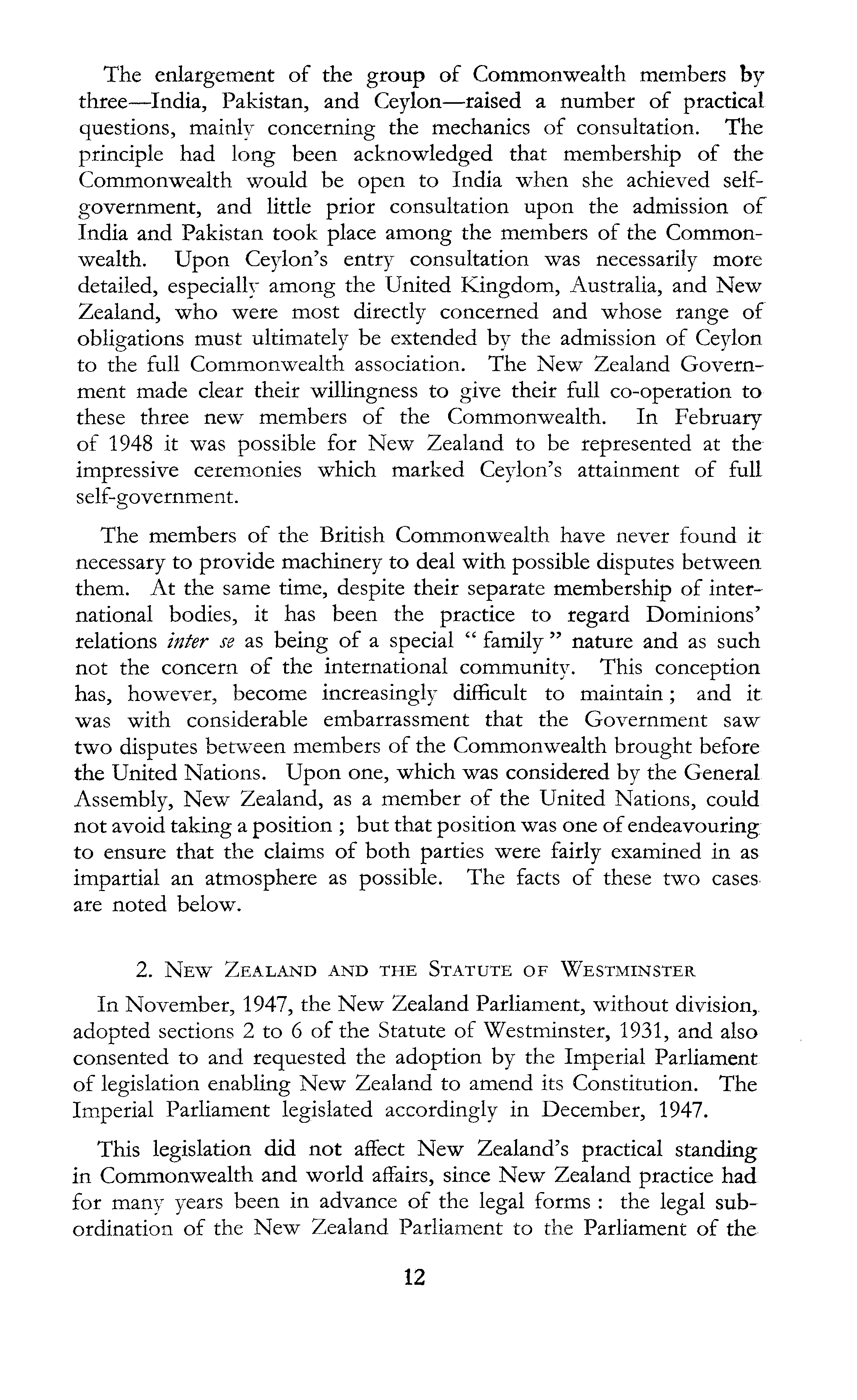 The enlargement of the group of Commonwealth members by three—lndia, Pakistan, and Ceylon—raised a number of practical questions, mainly concerning the mechanics of consultation. The principle had long been acknowledged that membership of the Commonwealth would be open to India when she achieved selfgovernment, and little prior consultation, upon the admission of India and Pakistan took place among the members of the Commonwealth. Upon Ceylon's entry consultation was necessarily more detailed, especially among the United Kingdom, Australia, and New Zealand, who were most directly concerned and whose range of obligations must ultimately be extended by the admission of Ceylon to the full Commonwealth association. The New Zealand Government made clear their willingness to give their full co-operation to these three new members of the Commonwealth. In February of 1948 it was possible for New Zealand to be represented at the impressive ceremonies which marked Ceylon's attainment of full self-government. The members of the British Commonwealth have never found it necessary to provide machinery to deal with possible disputes between them. At the same time, despite their separate membership of international bodies, it has been the practice to regard Dominions' relations inter se as being of a special " family " nature and as such not the concern of the international community. This conception has, however, become increasingly difficult to maintain; and it was with considerable embarrassment that the Government saw two disputes between members of the Commonwealth brought before the United Nations. Upon one, which was considered by the General Assembly, New Zealand, as a member of the United Nations, could not avoid taking a position ; but that position was one of endeavouring to ensure that the claims of both parties were fairly examined in as impartial an atmosphere as possible. The facts of these two casesare noted below. 2. New Zealand and the Statute of Westminster In November, 1947, the New Zealand Parliament, without division,, adopted sections 2 to 6 of the Statute of Westminster, 1931, and also consented to and requested the adoption by the Imperial Parliament of legislation enabling New Zealand to amend its Constitution. The Imperial Parliament legislated accordingly in December, 1947. This legislation did not affect New Zealand's practical standing in Commonwealth and world affairs, since New Zealand practice had for many years been in advance of the legal forms : the legal subordination of the New Zealand Parliament to the Parliament of the