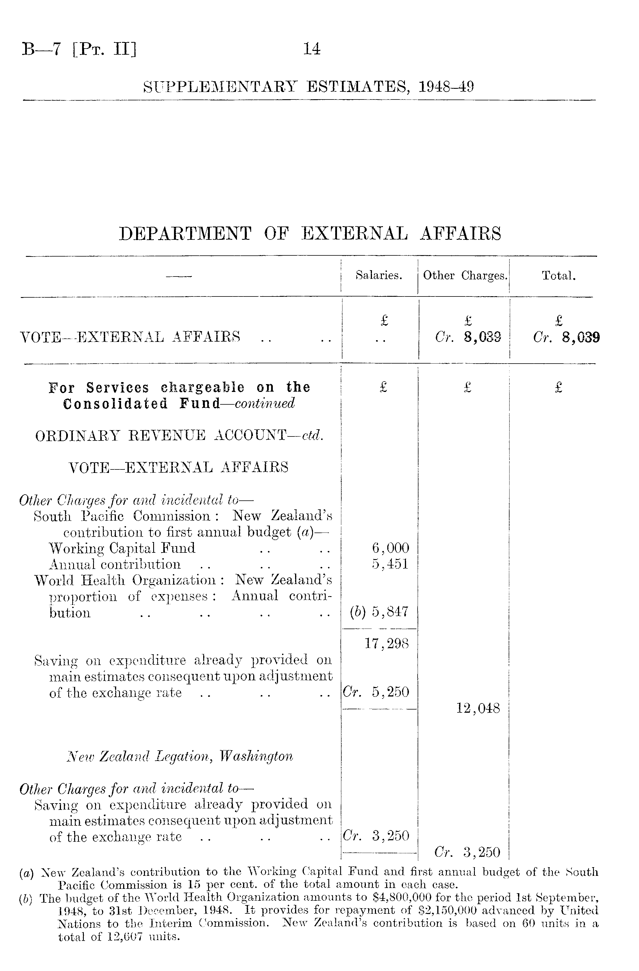 — Salaries. Other Charges. Total. VOTE—EXTERNAL AFFAIRS £ Cr. £ 8,039 £ Cr. 8,039 For Services chargeable on the Consolidated Fund —continued £ £ £ ORDINARY REVENUE ACCOUNT —ctd. VOTE—EXTERNAL AFFAIRS. Other Charges for and incidental to — South Pacific Commission : New Zealand's contribution to first annual budget (a) — Working Capital Fund Annual contribution World Health Organization : New Zealand's proportion of expenses : Annual contribution 6,000 5,451 (6) 5,847 Saving on expenditure already provided on main estimates consequent upon adjustment of the exchange rate 17,298 Cr. 5,250 12,048 New Zealand Legation, Washington • Other Charges for and incidental to — Saving on expenditure already provided on main estimates consequent upon adjustment of the exchange rate Cr. 3,250 Cr. 3,250