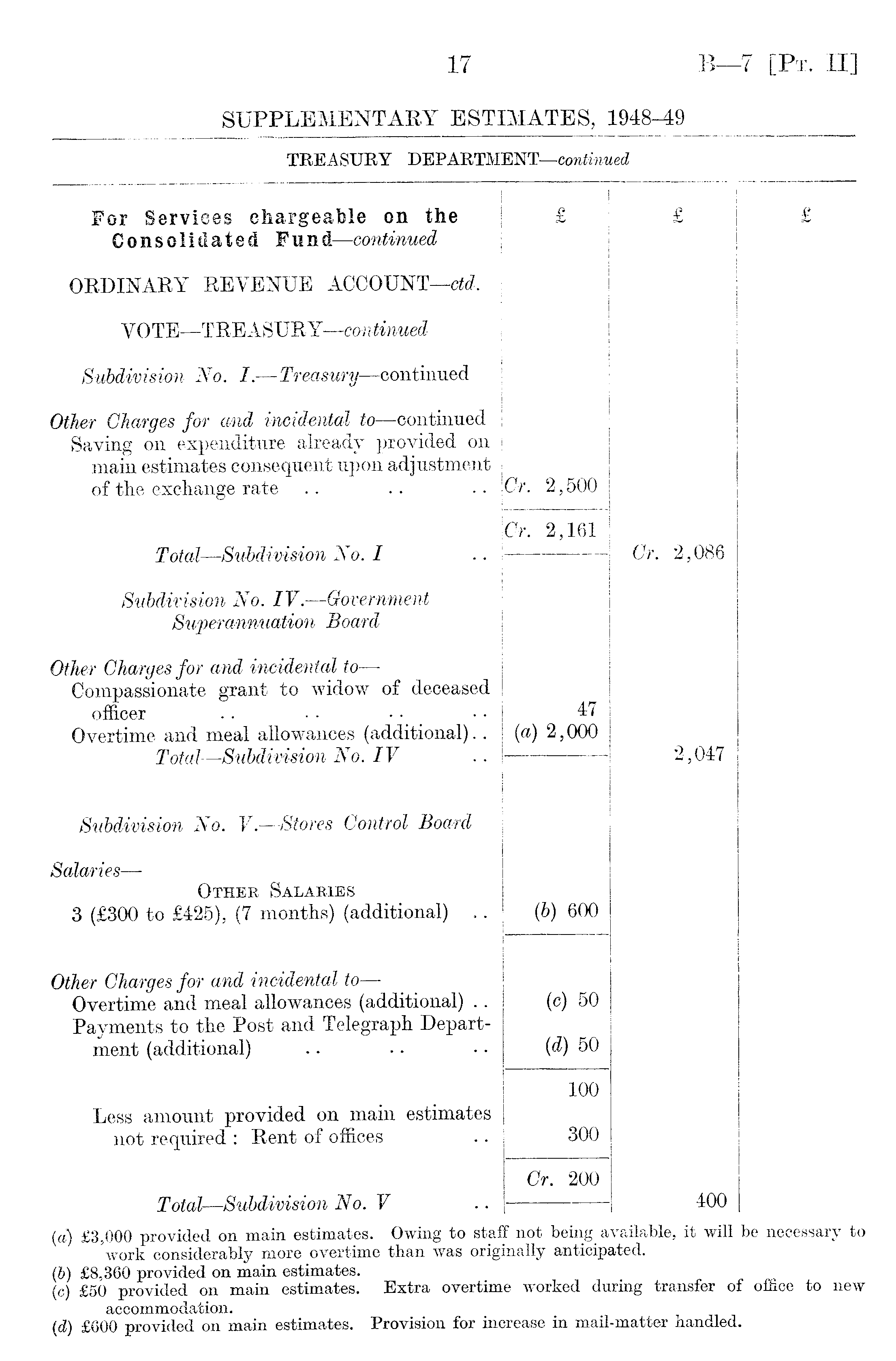 . For Serviees ehargeable on the Consolidated Fund —continued £ £ £ ORDINARY REVENUE ACCOUNT—ctd. YOTE —TRE ASUR Y —continued Subdivision No. I.—Treasury—continued Other Chargés for and incidental to —continued Saving on expenditure already provided on main estimates consequent upon adjustment of the exchange rate Cr. 2,500 Total —Subdivision No. I Cr. 2,161 Cr. 2,086 Subdivision No. IV. —Government Superannuation Board Other Chargés for and incidental to — Compassionate grant to widow of deceased officer Overtime and meal allowances (additional).. Total —Subdivision Ao. IV 47 (a) 2,000 2,047 Subdivision No. V. —Stores Control Board Salaries — Other Salaries 3 (£300 to £425), (7 months) (additional) .. (b) 600 Other Chargés for and incidental to — Overtime and meal allowances (additional) .. Payments to the Post and Telegraph Department (additional) (c) 50 (d) 50 1 Less amount provided on main estimates not required : Rent of offices 100 300 Total—Subdivision No. V Cr. 200 400