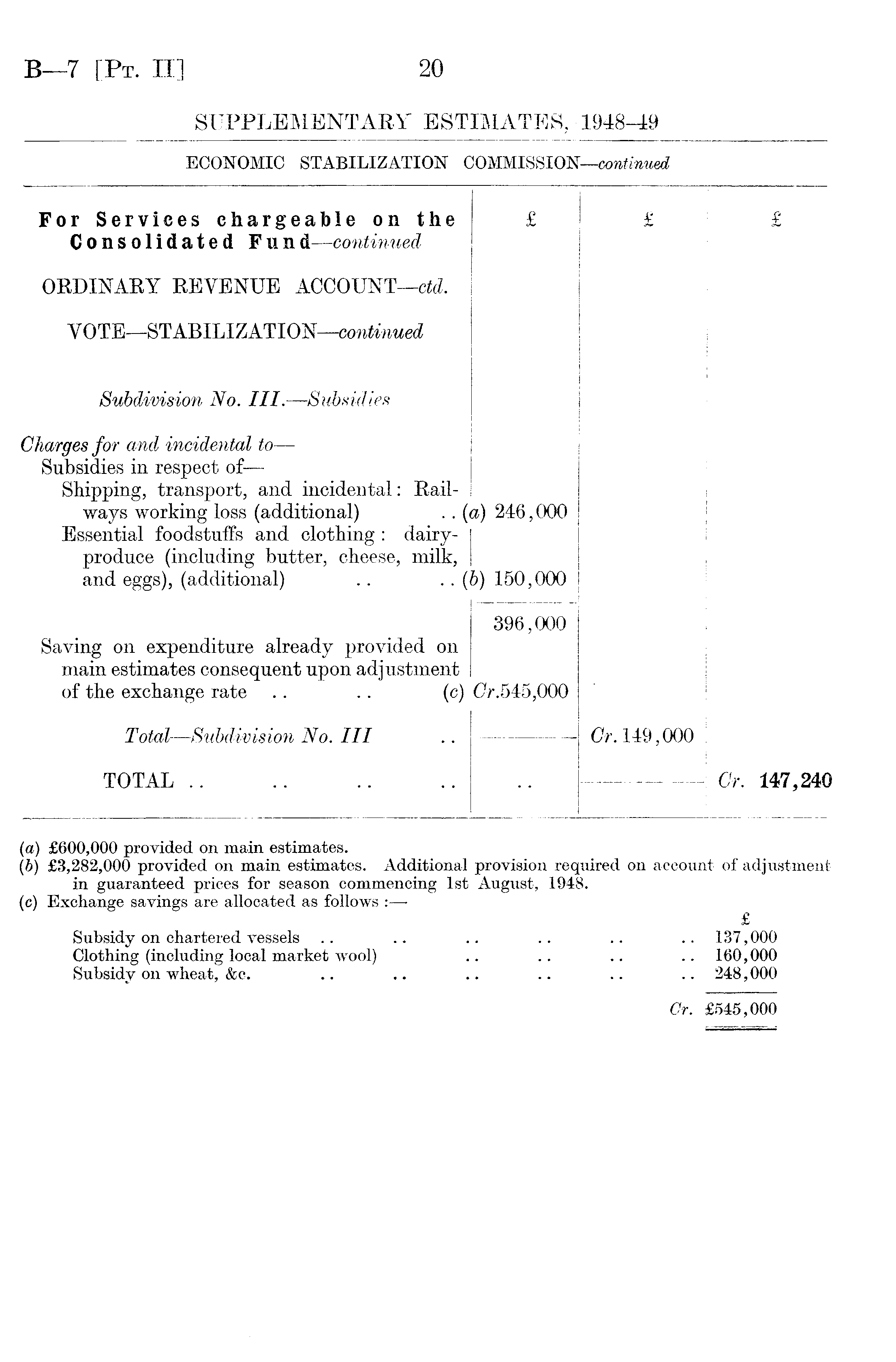 (а) £600,000 provided on main estimates. (б) £3,282,000 provided on main estimates. Additional provision required on account of adjustment in guaranteed prices for season commencing Ist August, 1948. (c) Exchange savings are allocated as follows : £ Subsidy on chartered vessels .. .. .. .. .. .. 137,000 Clothing (including local market wool) .. .. .. .. 160,000 Subsidy on wheat, &c. .. .. .. .. .. .. 248,000 Or. £545,000