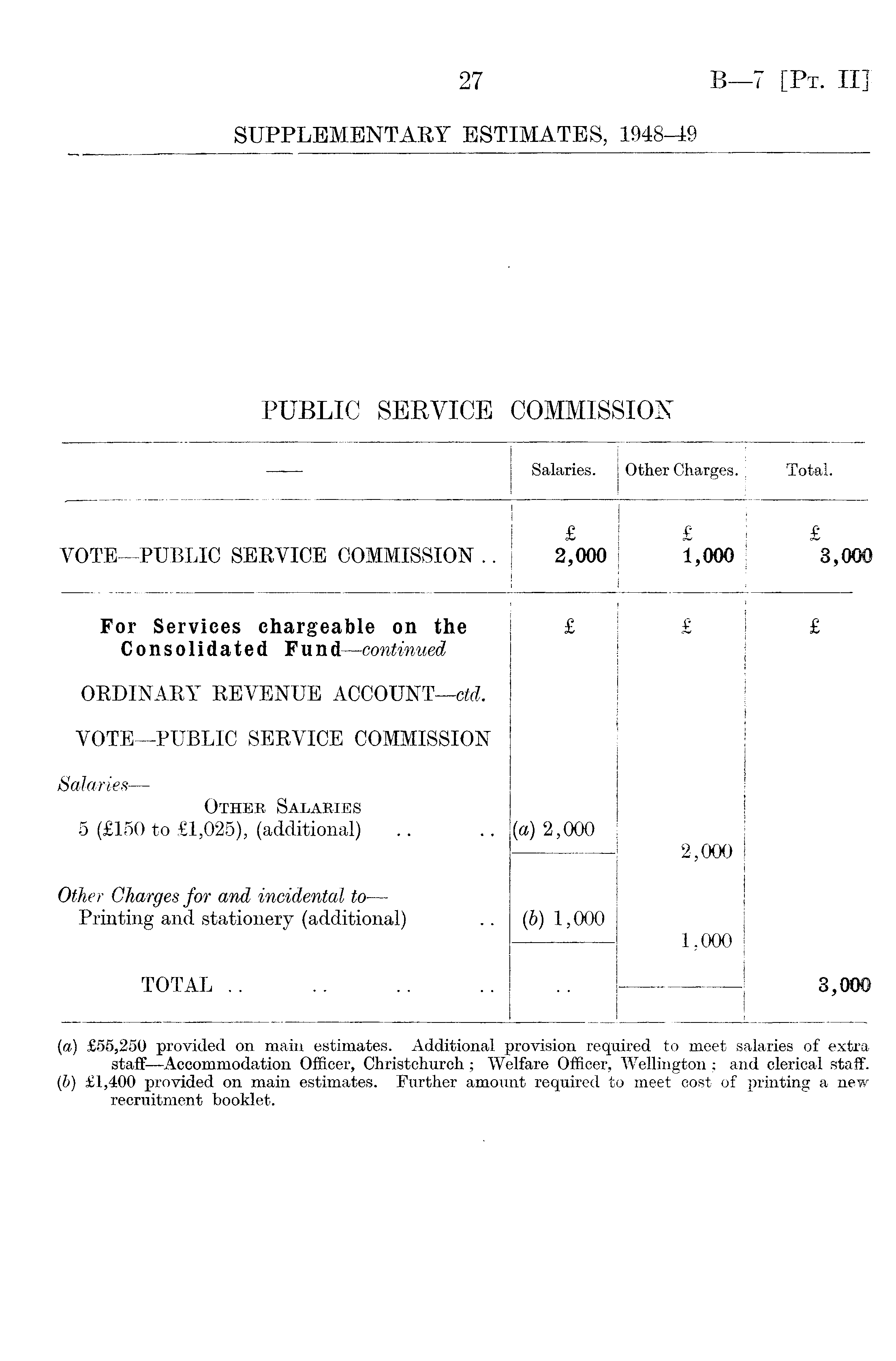 — Salaries. Other Chargés. Total. VOTE—PUBLIC SERVICE COMMISSION .. £ 2,000 £ 1,000 £ 3,000 For Services chargeable on the Consolidated Fund —continued £ £ £ ORDINARY REVENUE ACCOUNT—ctd. VOTE—PUBLIC SERVICE COMMISSION Salaries— Other Salaries 5 (£150 to £1,025), (additional) (a) 2,000 2,000 Other Chargés for and incidental to — Printing and stationery (additional) (b) 1,000 1,000 TOTAL 3,000