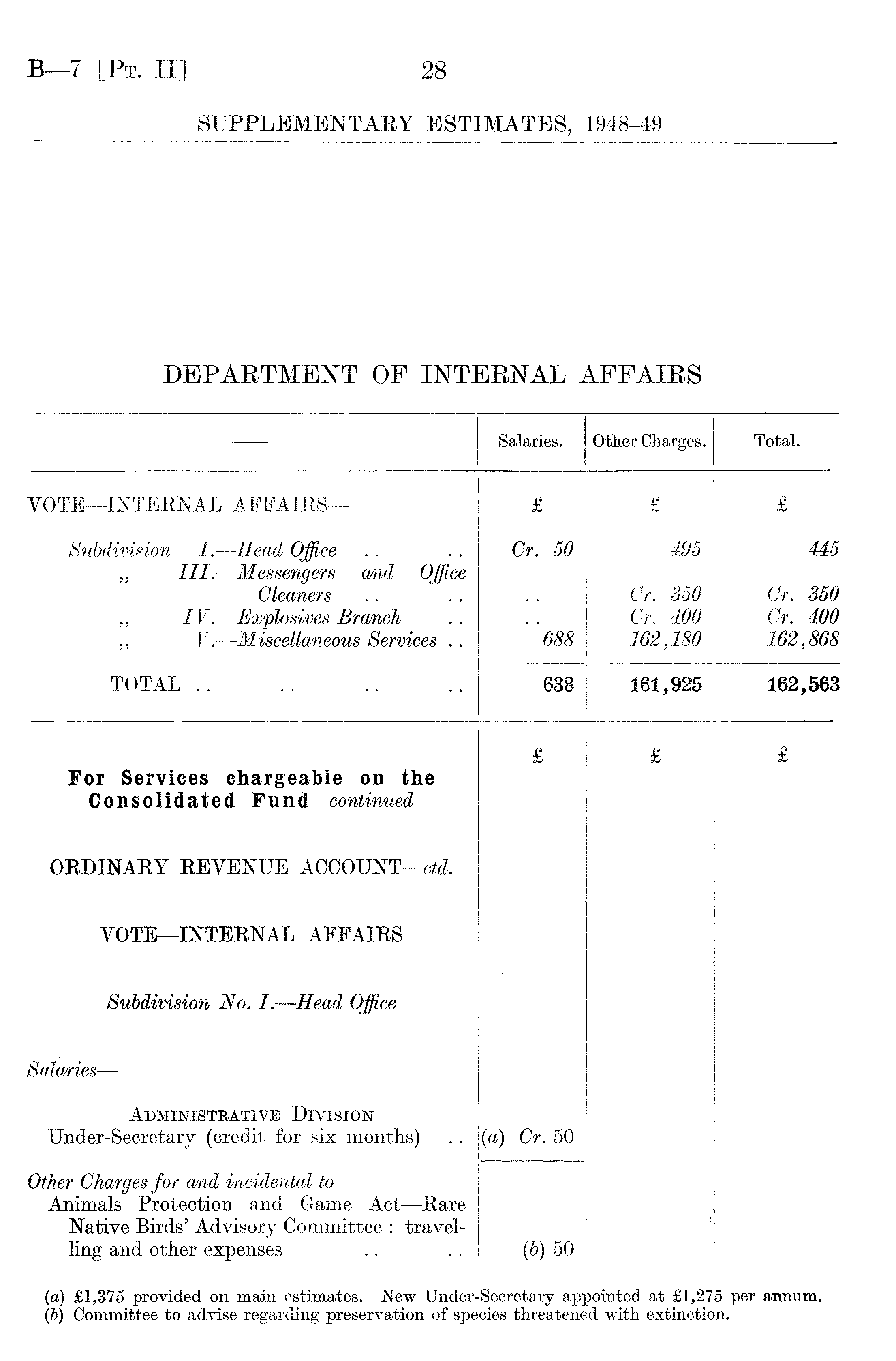 — Salaries. Other Chargés. Total. YOTE—INTERNAL AFFAIRS — £ £ £ Subdivision I.—Head Office „ III. —Messengers and Office Gleaners „ I V. —Explosives Branch „ V. —Miscellaneous Services .. Cr. 50 "688 495 Cr. 350 Cr. 400 162,180 445 Cr. 350 Cr. 400 162,868 TOTAL .. 638 161,925 162,563 For Services chargeable 011 the Consolidated Fund—continued £ £ £ ORDINARY REYENUE ACCOUNT —ctd. VOTE—INTERNAL AFFAIRS Subdivision No. I. —Head Office • Salaries — Administrative Division Under-Secretary (credit for six months) (a) Cr. 50 Other Chargés for and incidental to — Animals Protection and Game Act —Rare Native Birds' Advisory Committee : travelling and other expenses .. {b) 50 (a) £1,375 provided on main estimates. New Under-Secretary appointed at £1,275 per annum. (b) Committee to advise regarding preservation of speeies threatened with extinction.