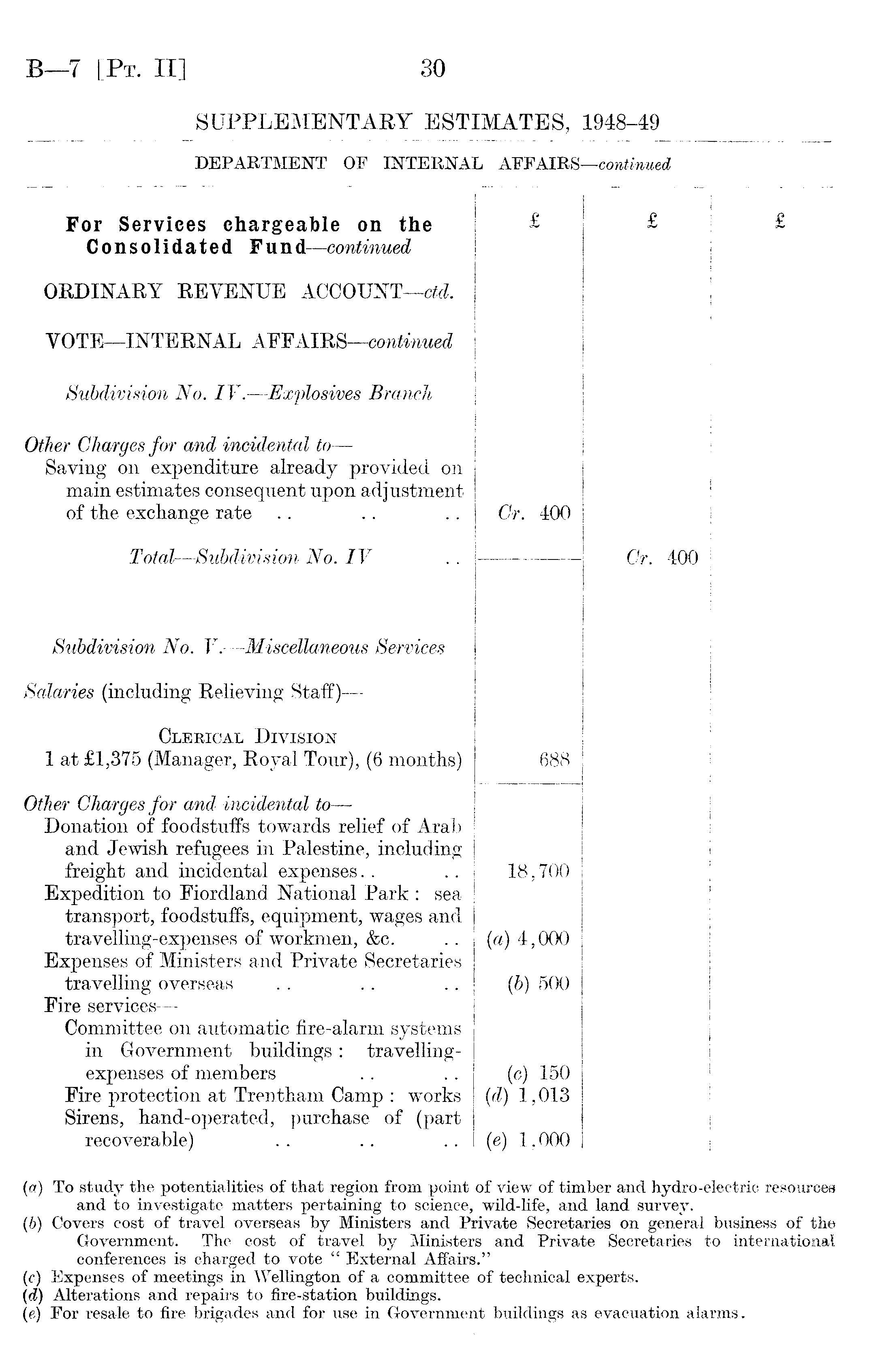 For Services chargeable on the Consolidated Fund—continued £ £ £ ORDINARY REVENUE ACCOUNT —ctd. YOTE—INTERNAL AEFAIRS —continued Subdivision No. IV. —Explosives Branch Other Chargés for and incidental to — Saving on expenditure already provided on main estimates consequent upon adjustment of the exchange rate Cr. 400 Total—Subdivision No. IV Cr. 400 Subdivision No. V. —Miscellaneous Services Salaries (ineluding Relieving Staff) — Clerical Division 1 at £1,375 (Manager, Royal Tour), (6 months) 688 Other Chargés for and incidental to — Donation of foodstuffs towards relief of Arab and Jewish refugees in Palestine, ineluding freight and incidental expenses Expedition to Fiordland National Park : sea transport, foodstuffs, equipment, wages and travelling-expenses of workmen, &c. Expenses of Ministers and Private Secretaries travelling overseas Fire services— Committee on automatic fire-alarm systems in Government buildings: travellingexpenses of members Fire protection at Trentham Camp : works Sirens, hand-operated, purchase of (part recoverable) | 18,700 (a) 4,000 (6) 500 (c) 150 {å) 1,013 (e) 1,000