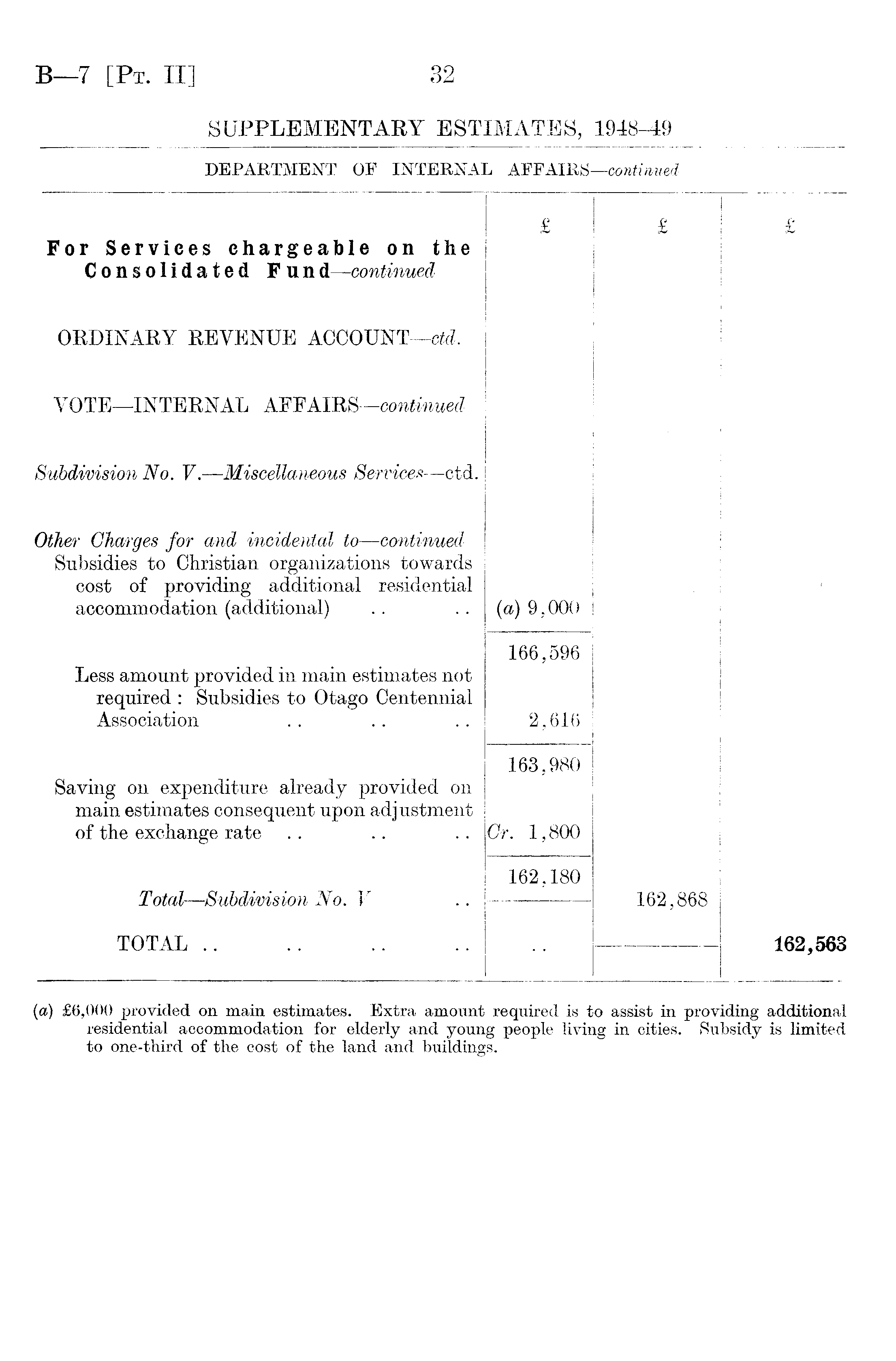 For Services chargeable on the Consolidated Fund—continued £ £ £ ORDINARY REVENUE ACCOUNT —ctd. VOTE—INTERNAL AFFAIRS —continued Subdivision No. V. —Miscellaneous Services—ctd. l Other Chargés for and incidental to —continued Subsidies to Christian organizations towards cost of providing additional residential accommodation (additional) (a) 9,000 Less amount provided in main estimates not required : Subsidies to Otago Centennial Association 166,596 2,616 Saving on expenditure already provided on main estimates consequent upon adjustment of the exchange rate 163,980 Gr. 1,800 Total —Subdivision No. V 162,180 162,868 TOTAL .. 162,563