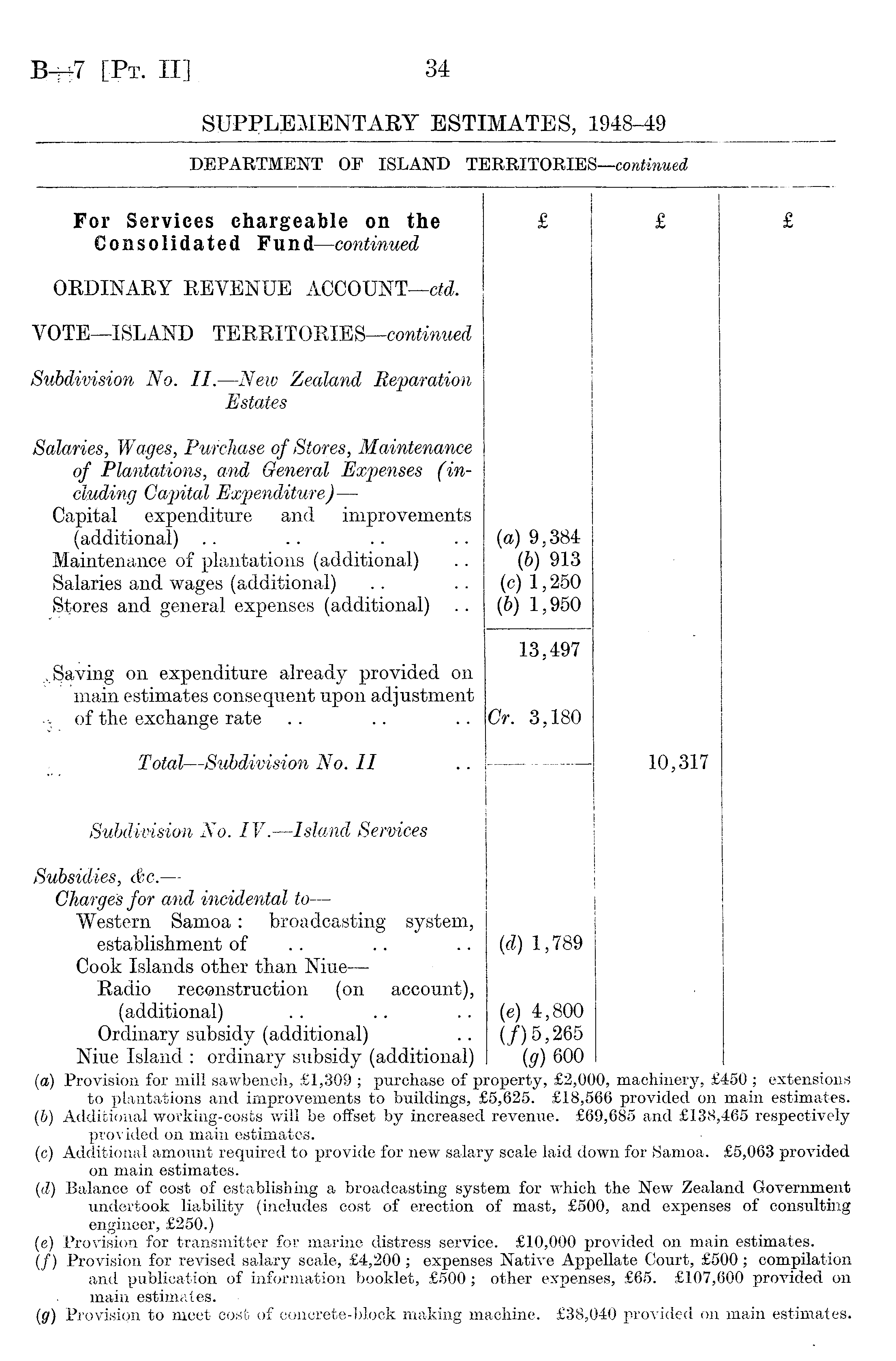 For Services ehargeable on the Consolidated Fund —continued £ £ £ ORDINARY REVENUE ACCOUNT—eid. VOTE—ISLAND TERRITGRIES —continued Subdivision No. II. —Neiv Zealand R¶tion Estates Salaries, W ages, Purchase of Stores, Maintenance of Plantations, and General Éxpenses (including Capital Expenditure)— Capital expenditure and improvements (additional) Maintenance of plantations (additional) Salaries and wages (additional) Stores and general expenses (additional) {a) 9,384 (6) 913 (c) 1,250 (6) 1,950 ...Saving on expenditure already provided on main estimates eonsequent upon adjustment •- of the exchange rate 13,497 Cr. 3,180 Total—Subdivision No. 11 Subdivision No. IV. —Island Services 10,317 1 Subsidies, &c.— Chargés for and incidental to — Western Samoa: broadcasting system, establishment of Cook Islands other tban Niue — Radio reconstruction (on account), (additional) Ordinary subsidy (additional) Niue Island : ordinary subsidy (additional) (d) 1,789 (e) 4,800 (/)5,265 (g) 600
