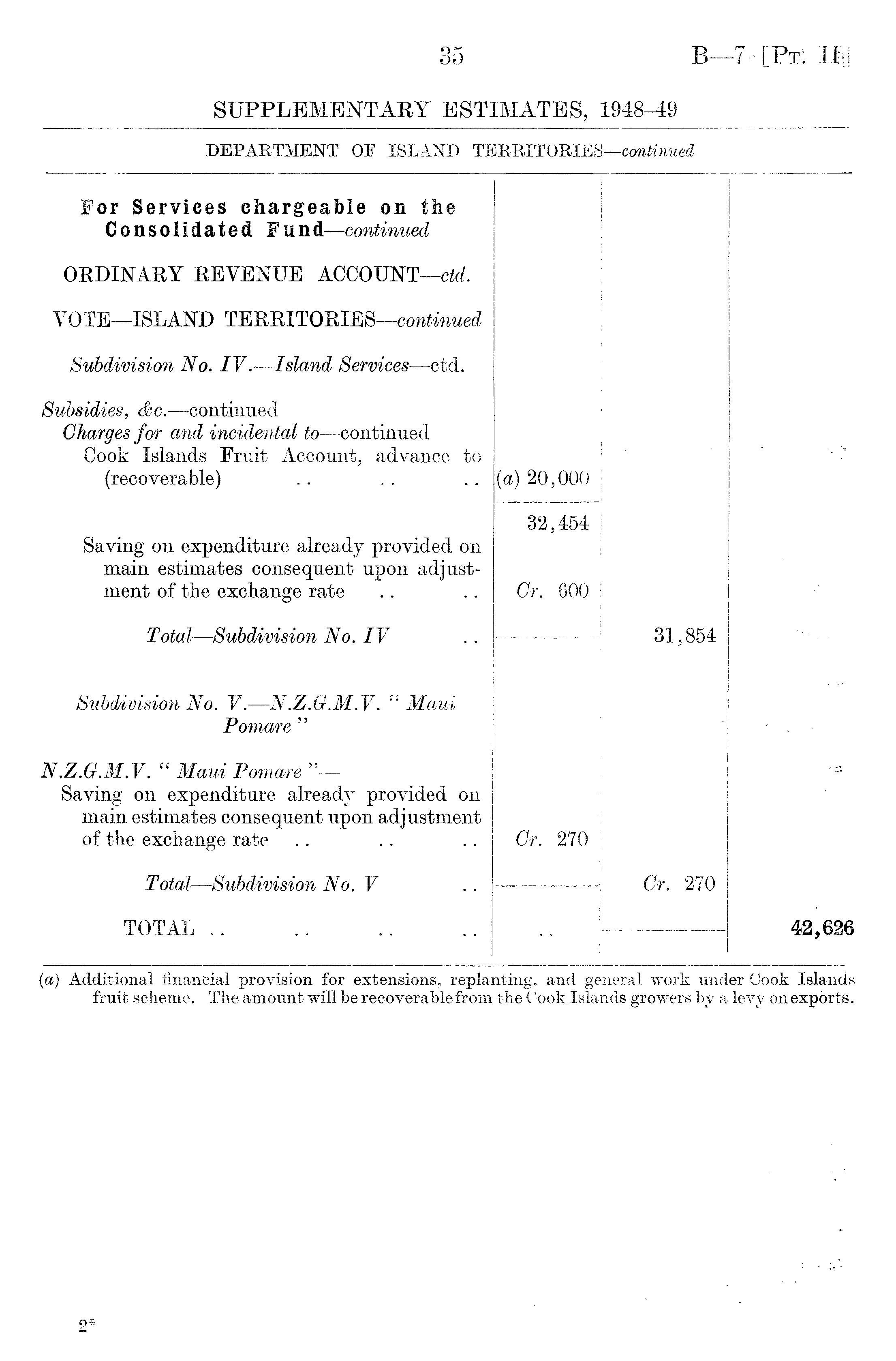 For Services chargeable on the Consolidated Fund —continued I ORDINARY REVENUE ACCOUNT—eld. VOTE—ISLAND TERRITORIES—continued Subdivision No. IV.—Island Services —ctd. Subsidies, &c. —continued Charges for and incidental to —continued Cook Islands Fruit Account, advance to (recoverable) (a) 20,000 Saving on expenditure already provided on main estimates consequent upon adjustment of the exchange rate 32,454 Cr. 600 - Total—Subdivision No. IV 31,854 Subdivision No. V.—N.Z.G.M.V. "Maui Pomare " ■ N.Z.G.M.V. " Maui Pomare Saving on expenditure already provided on main estimates consequent upon adjustment of the exchange rate Cr. 270 1 Total —Subdivision No. V Cr. 270 TOTAL .. 42,626 1 (a) Additional financial provision for extensions, replanting, and general work under Cook Islands fruit scheme. The amount will be recoverable from the Cook Islands growers by a levy on exports.