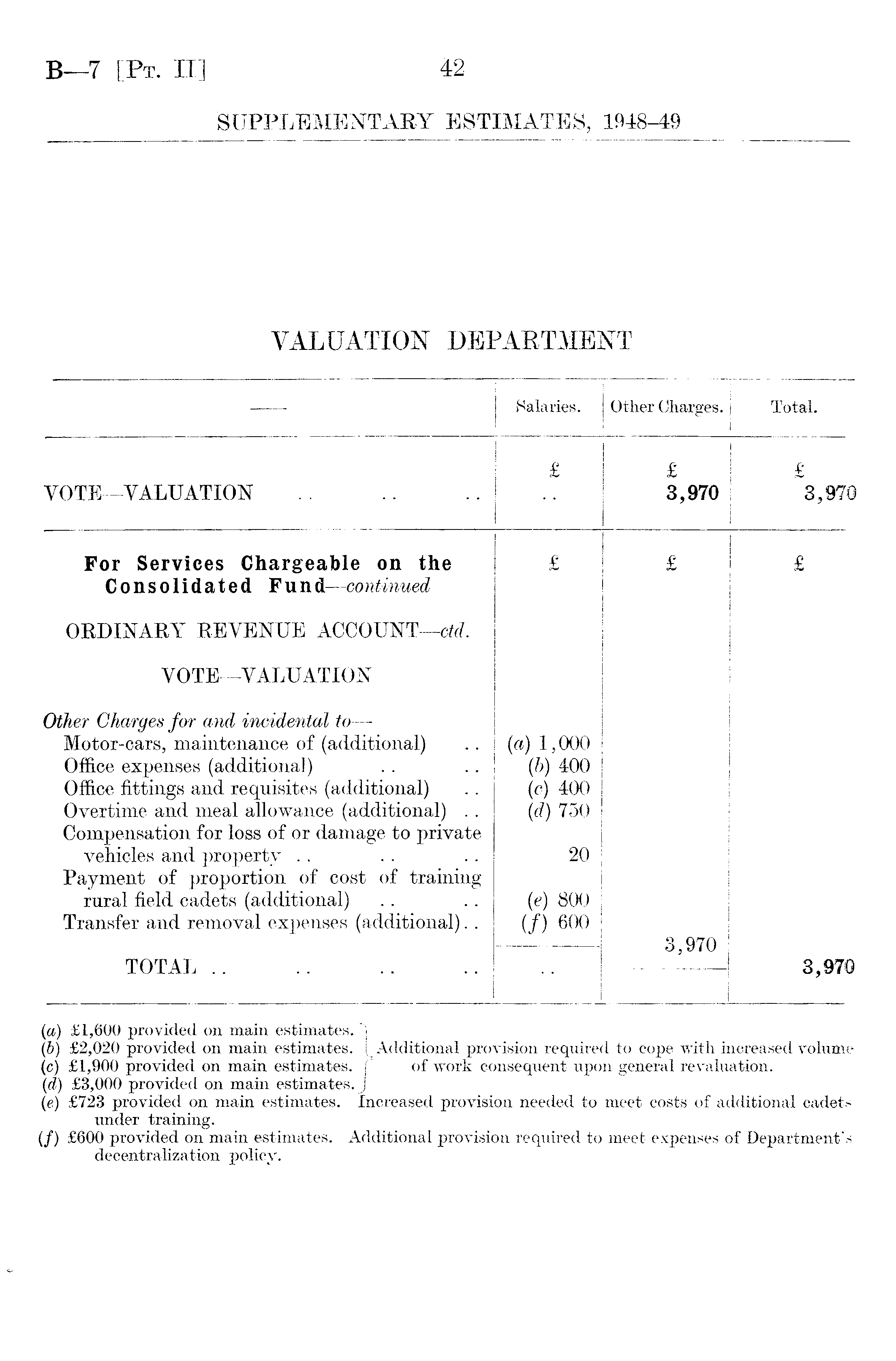 — Salaries. Other Chargés. Total. VOTE—VALUATION £ £ 3,970 £ ~3,970 For Services Chargeable on the Consolidated Fund—continued £ £ £ ORDINAKY REYENUE ACCOUNT—ctd. VOTE—YALUATION Other Chargés for and incidental to — Motor-cars, maintenance of (additional) Office expenses (additional) Office fittings and réquisites (additional) Overtime and meal allowance (additional) .. Compensation for loss of or damage to private vehicles and property Payment of proportion of cost of training rural field cadets (additional) Transfer and removal expenses (additional).. (a) 1,000 (b) 400 (c) 400 (d) 750 20 (e) 800 (/) 600 3,970 TOTAL .. 3,970