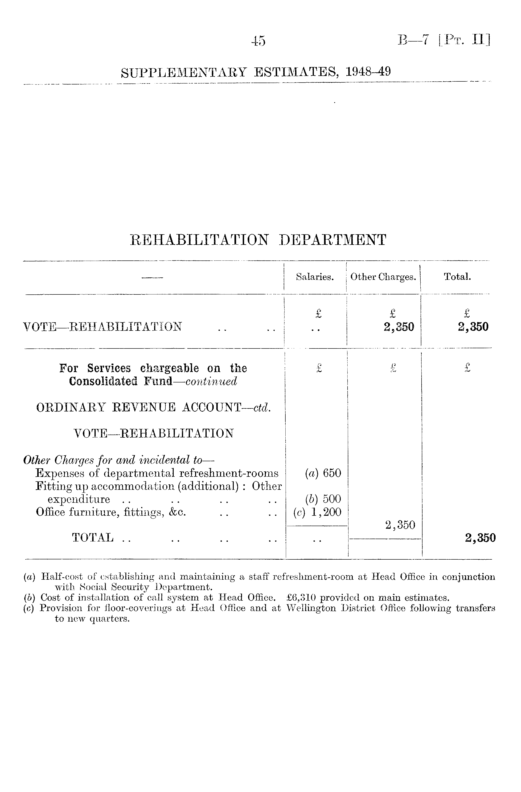 1 Salaries. | Other Chargés. Total. VOTE—REHABILITATION £ £ 2,350 £ 2,350 For Services chargeable on the Consolidated Fund—continued £ £ £ ORDINARY REVENUE ACCOUNT—ctd. YOTE—REHABILITATION Other Chargés for and incidental to — Expenses of departmental refreshment-rooms Fitting up accommodation (additional) : Other expenditure Office furniture, fittings, &c. (a) 650 (b) 500 (c) 1,200 2,350 TOTAL .. 2,350