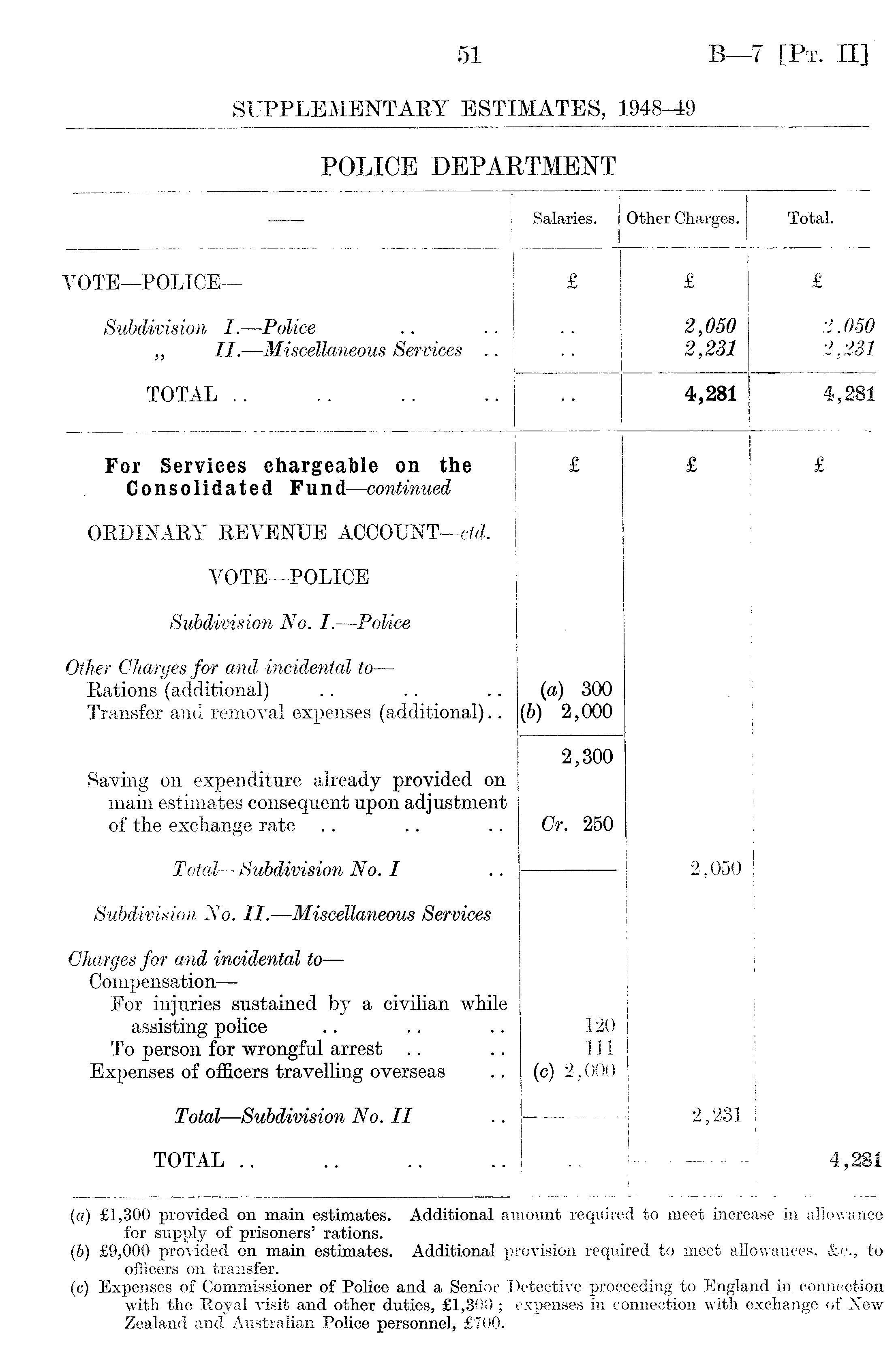: Salaries. Other Chargés. Total. VOTE—POLICE— £ 1 £ £ Subdivision I.—Police „ II.—Miscellaneous Services .. 2,050 2,231 2,050 2,231 TOTAL .. 4,281 4,281 For Services chargeable on the Consolidated Fund —continued £ £ £ ORDINARY REVENUE ACCOUNT—ctd. VOTE—POLICE Subdivision No. I. —Police Other Chargés for and incidental to — Rations (additional) Transfer and removal expenses (additional).. (a) 300 (6) 2,000 Saving on expenditure already provided on main estimates consequent upon adjustment of the exchange rate 2,300 Cr. 250 Total —Subdivision No. I 2,050 Subdivision No. II. —Miscellaneous Services Chargés for and incidental to — Compensation — For injuries sustained by a civilian while assisting police To person for wrongful arrest Expenses of officers travelling overseas 120 111 (c) 2,000 Total —Subdivision No. II 2,231 TOTAL .. 1 4 2&1 j