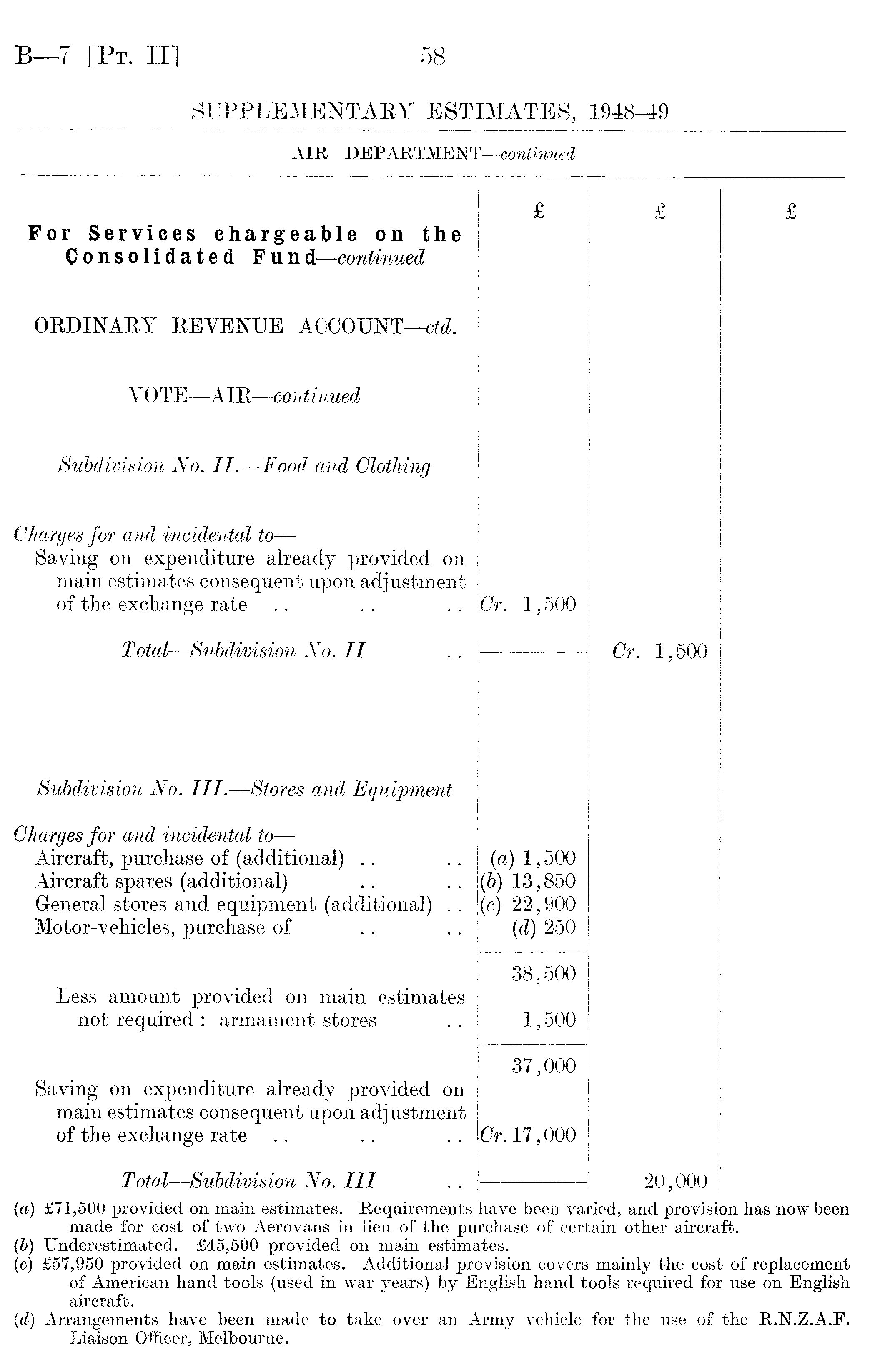 (а) £71,500 provided on main estimates. Requirements have been varied, and provision has nowbeen made for cost of two Aerovans in lieu of the purchase of certain other aircraffc. (б) Underestimated. £45,500 provided on main estimates. (c) £57,950 provided on main estimates. Additional provision covers mainly the cost of replacement of American hand tools (used in war years) by English hand tools required for use on English aircraft. (d) Arrangements have been made to take over an Army vehicle for the use of the R.N.Z.A.F. Liaison Officer, Melbourne.