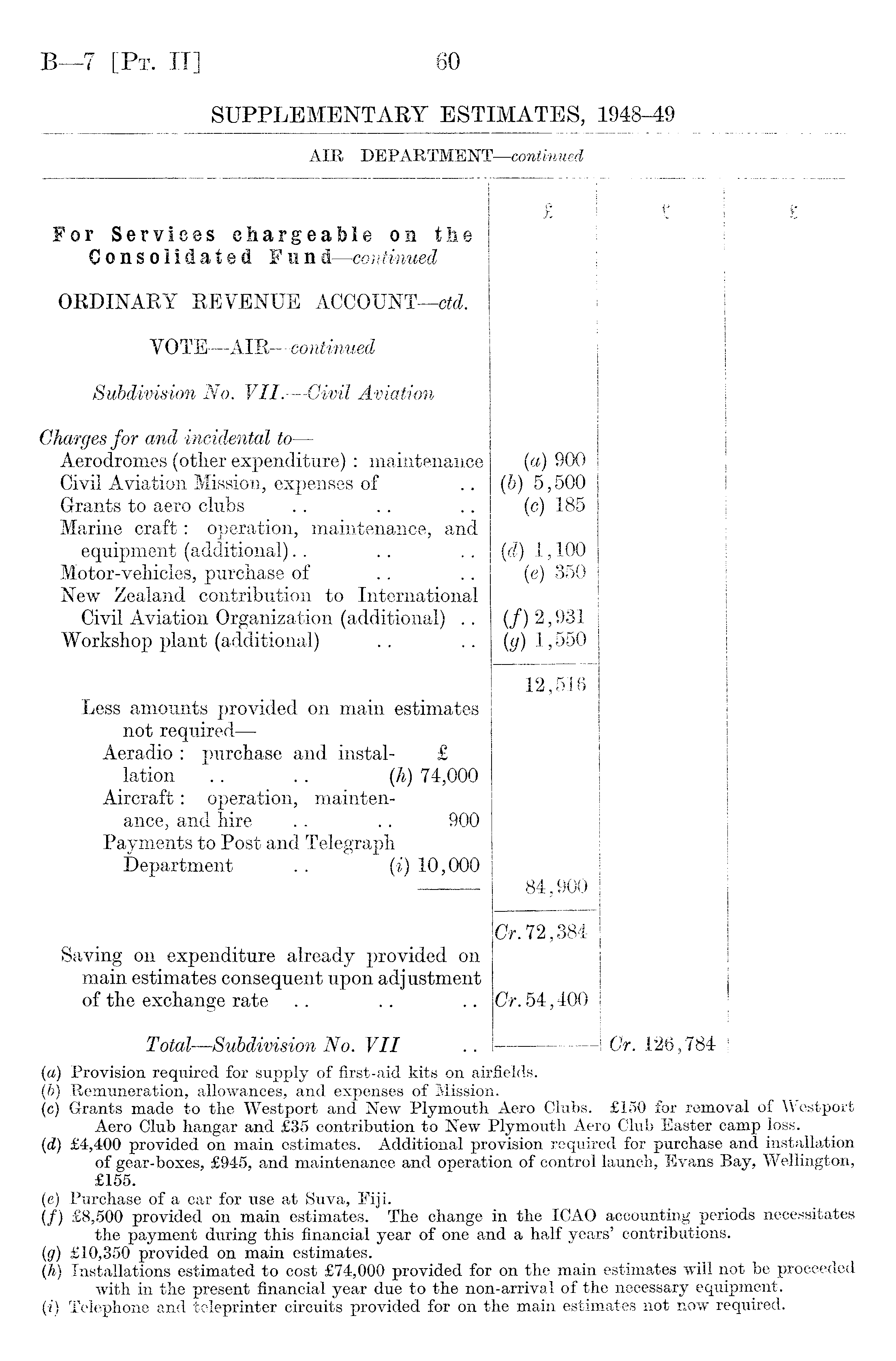 For Services ehargeaMe on the Consolidated Fund—continued £ j £ i £ ORDINARY REVENUE ACCOUNT —ctd. V 0 TE—AIR —continued Subdivision No. VII. —Civil Aviation Chargés for and incidental to — Aerodromes (other expenditure) : maintenance Civil Aviation Mission, expenses of Grants to aero clubs Marine craft: operation, maintenance, and equipment (additional) Motor-vehicles, purchase of New Zealand contribution to International Civil Aviation Organization (additional) .. Workshop plant (additional) {a) 900 (b) 5,500 (c) 185 (d) 1,100 (e) 350 (/) 2,931 (fir) 1,550 i Less amounts provided on main estimates not required — Aeradio : purchase and instal- £ lation .. .. (h) 74,000 Aircraft: operation, maintenance, and hire .. .. 900 Payments to Post and Telegraph Department .. (i) 10,000 12,516 84,900 Saving on expenditure already provided on main estimates consequent upon adjustment of the exchange rate Cr. 72,384Cr. 54,400 Total —Subdivision No. VII Gr. 126,784