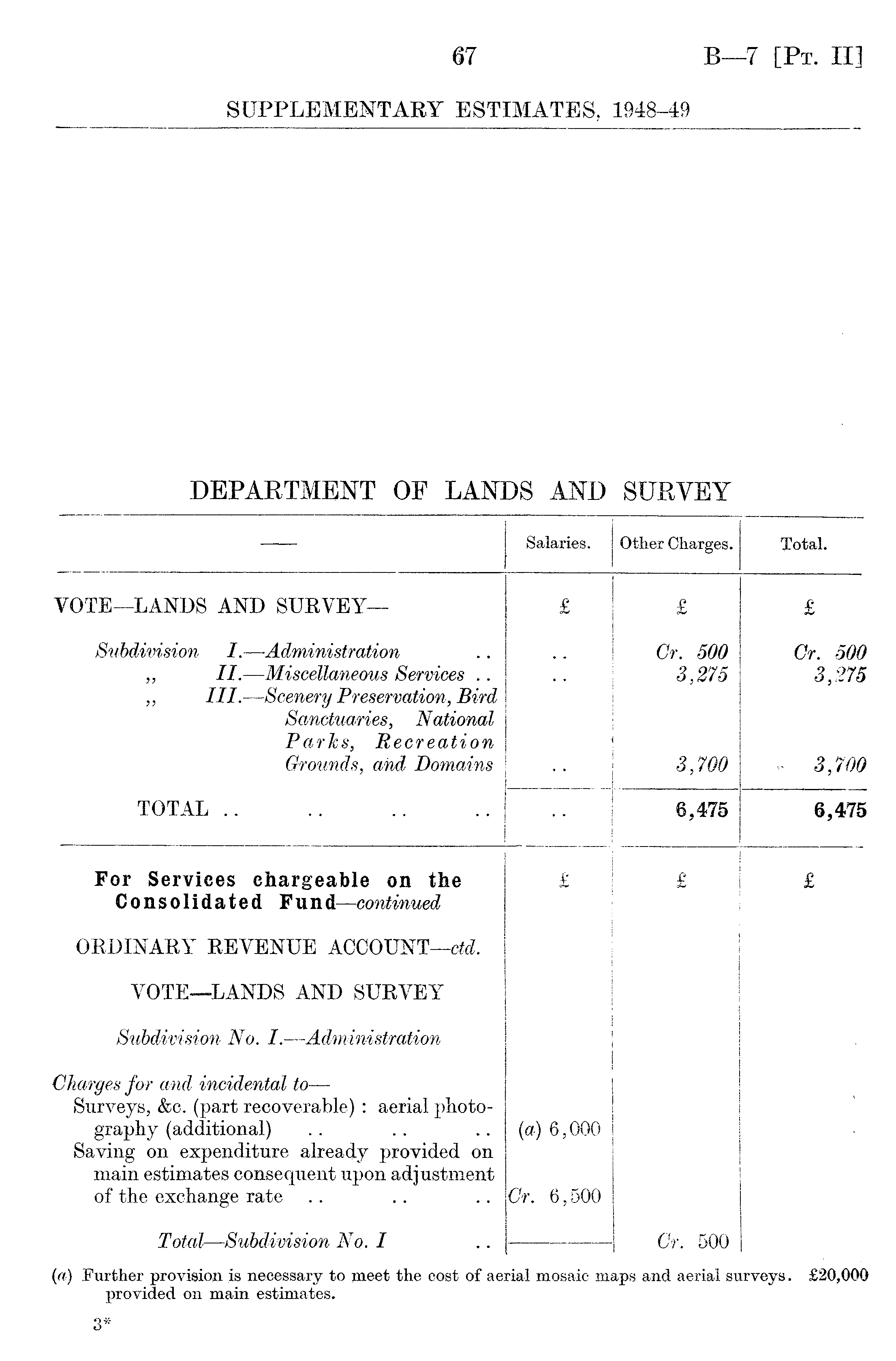 — Salaries. Other Chargés. Total. VOTE—LANDS AND SURVEY— £ £ £ Subdivision I. —Administration „ II.—Miscellaneous Services .. „ III.—Scenery Preservation, Bird Sanctuaries, National Parks, Recreation Grounds, and Domains Cr. 500 3,275 3,700 Cr. 500 3,275 - 3,700 TOTAL .. 6,475 @,475 For Services chargeable on the Consolidated Fund—continued £ i? oU 1 ! ! £ ORDINARY REVENUE ACCOUNT—dd. VOTE—LANDS AND SURYEY 1 Subdivision No. I. —Administration 1 j 1 Chargés for and incidental to — Surveys, &c. (part recoverable) : aerial photography (additional) Saving on expenditure already provided on main estimates consequent upon adjustment of the exchange rate (a) 6,000 Cr. 6,500 Total —Subdivision No. I Cr. 500 (a) Furtber provision is neeessary to meet the cost of aerial mosaic maps and aerial surveys ■ £20,000 provided on main estimates.