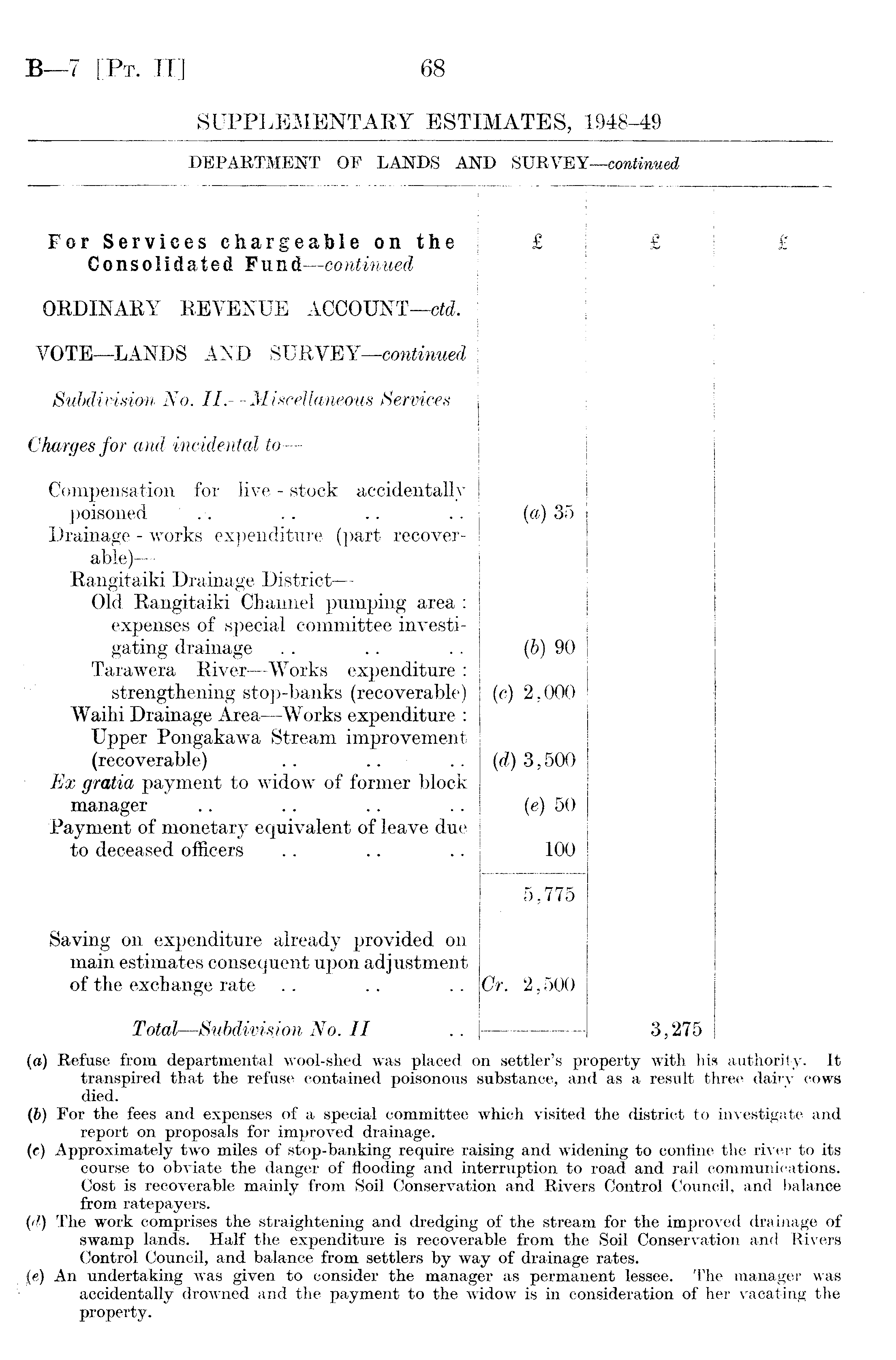 j For Services chargeable on the Consolidated Fund—continued £ £ £ ORDINARY REVENUE ACCOUNT—ctd. YOTE—LANDS AND SURVEY—continued Subdivision No. II. —Miscellaneous Services Chargés for and incidental to — Compensation for live - stock aecidentally poisoned .. .. Drainage - works expenditure (part recoverable) —- Rangitaiki Drainage District — Old Rangitaiki Channel pumping area : expenses of special committee investigating drainage Tarawera River —Works expenditure : strengthening stop-banks (recoverable) Waihi Drainage Area —Works expenditure : Upper Pongakawa Stream improvement (recoverable) . . Ex gratia payment to widow of former block manager Payment of monetary equivalent of lea ve due to deceased officers (а) 35 (б) 90 (c) 2,000 (d) 3,500 (e) 50 100 5,775 Saving on expenditure already provided on main estimates consequent upon adjustment of the exchange rate Cr. 2,500 Total —Subdivision No. II 3,275