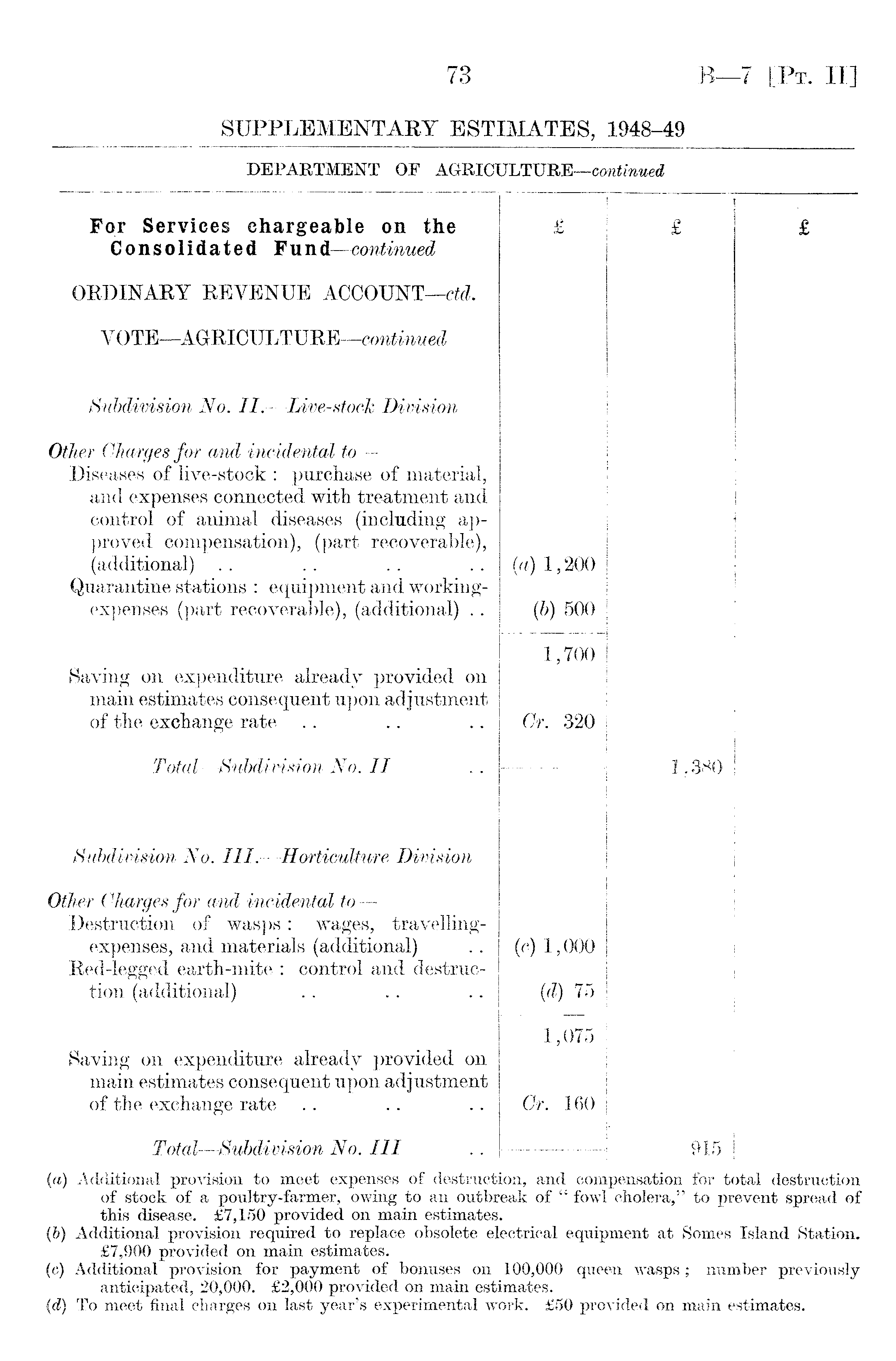 For Services ehargeable on the Consolidated Fund —continued £ £ £ ORDINARY REVENUE ACCOUNT —ctd. Y OTE —AGrRICULTURE—continued Subdivision No. II.—Live-stock Division Other Chargés f or and incidental to — Diseases of live-stock purchase of material, and expenses coimected with treatraent and control of animal diseases (including approved compensation), (part recoverable), (additional) Quarantine stations : equipment and workingexpenses (part recoverable), (additional) .. («) 1,200 (6) 500 Saving on expenditnre already provided on main estimates consequent upon adjustment of the exchange rate 1,700 Cr. 320 Total —Subdivision No. II 1,380 Subdivision No. III.—Horticulture Division Other Chargés for and incidental to — Destruction of wasps: wages, travellingexpenses, and materials (additional) Red-legged earth-mite : control and destruction (additional) (c) 1,000 (d) 75 Saving on expenditure already provided on main estimates consequent upon adjustment of the exchange rate 1,075 Cr. 160 Total —Subdivision No. III 1 915