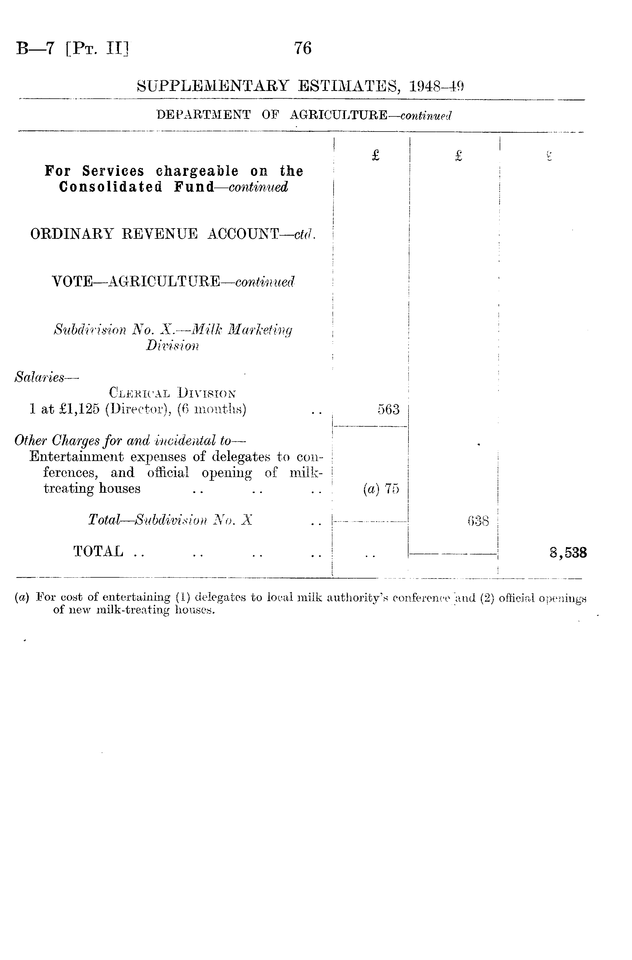For Services chargeable on the Consolidated Fund—continued £ 1 £ £ ORDINARY REVENUE ACCOUNT—ctd. f VOTE —AGRICULTURE —continued | 1 1 i Subdivision No. X.—Milk Marketing Division ■ Salaries — Clerical Division 1 at £1,125 (Director), (6 months) .. j ' 563 Other Charges for and incidental to — Entertainment expenses of delegates to conferences, and official opening of milktreating houses (a) 75 Total—Subdivision No. X 638 TOTAL .. 8,538 (a) For coat of entertaining (1) delegates to local milk authority's conference "and (2) official openings of new milk-treating houses.
