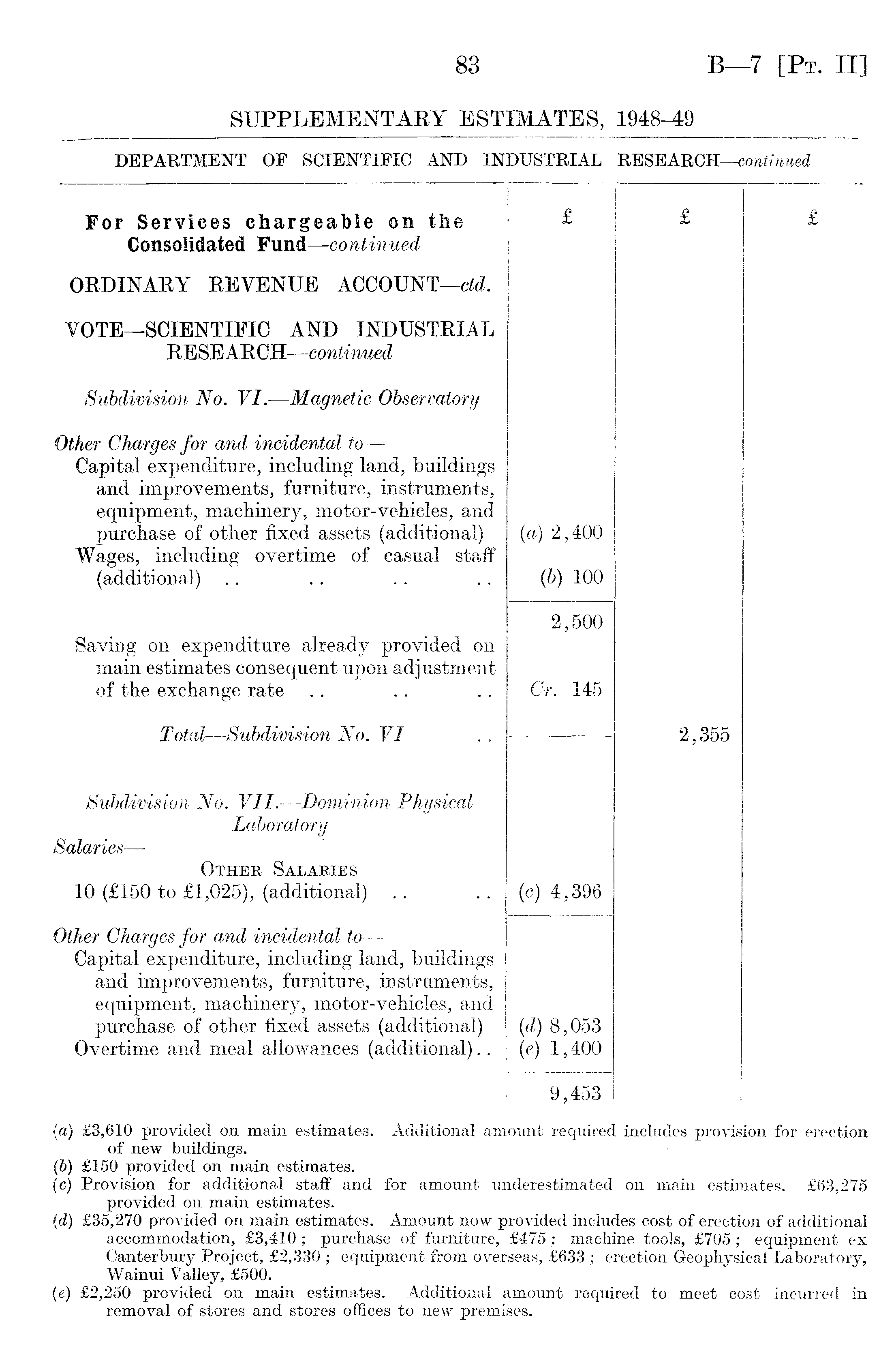 For Services chargeable gei the Consolidated Fund —continued i £ £ £ ORDINARY REVENUE ACCOUNT —eld. VOTE—SCIENTIFIC AND INDUSTRIAL RESEARCH —continued Subdivision No. VI. —Magnetic Observatory Other Chargés for and incidental to— Capital expenditure, including land, buildings and improvements, furniture, instruments, equipment, machinery, motor-veliicles, and purchase of other fixed assets (additional) Wages, including overtime of casual staff (additional) {a) 2,400 (b) 100 Saving on expenditure already provided on main estimates consequent upon adjustment of the exchange rate 2,500 Cr. 145 Total —Subdivision No. VI 2,355 Subdivision No. VII. —Dominion Physical Laboratory Salaries— Other Salaries 10 (£150 to £1,025), (additional) (c) 4,396 Other Chargés for and incidental to— Capital expenditure, including land, buildings and improvements, furniture, instruments, equipment, machinery, motor-vehicles, and purchase of other fixed assets (additional) Overtime and meal allowances (additional).. | (d) 8,053 (e) 1,400 9,453
