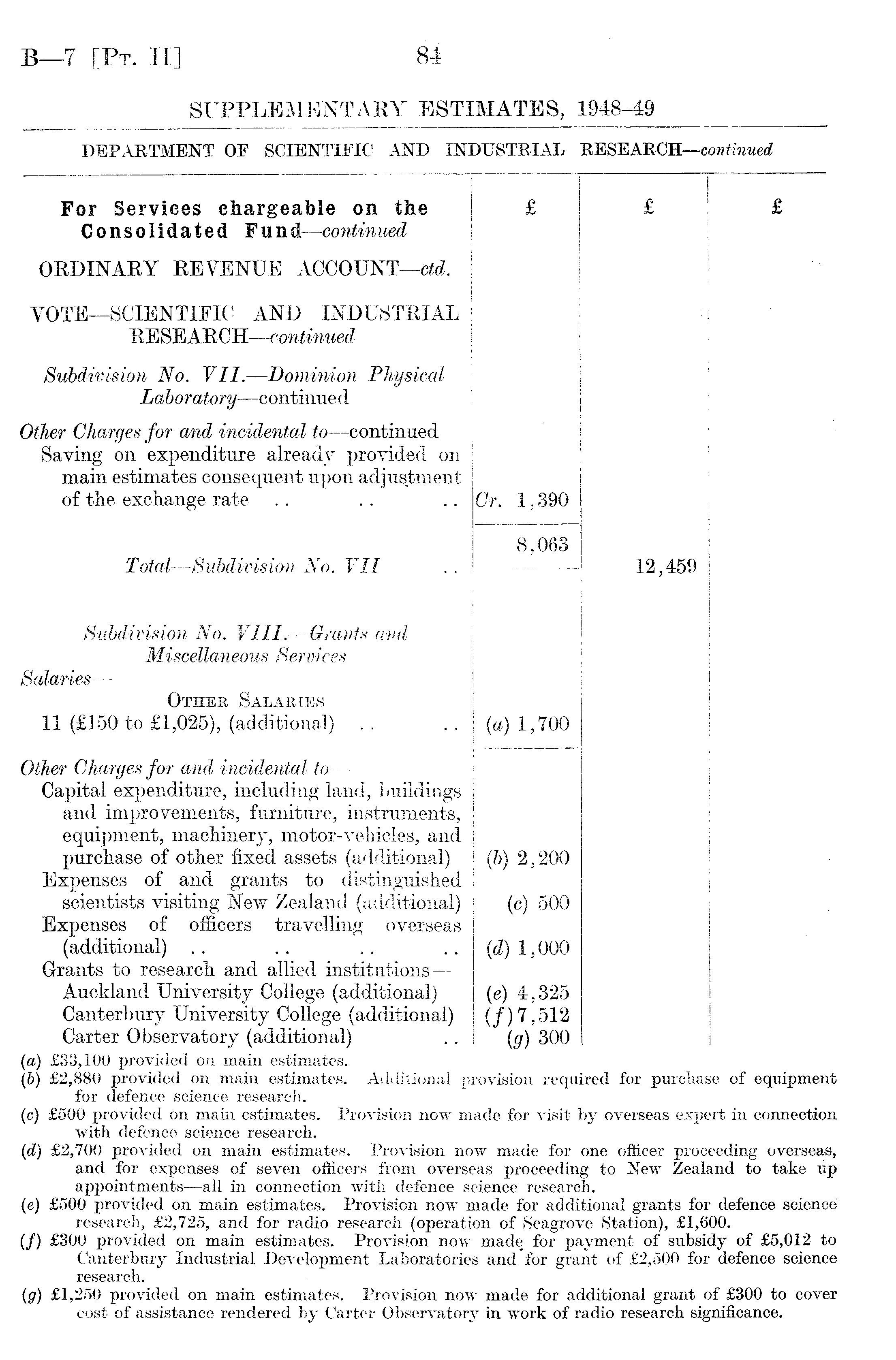(bj £2,880 provided on main estimates. Additional provision required for purchase of equipment for defence science research. (c) £5OO provided on main estimates. Provision novv made for visit by overseas expert in connection with defence science research. (d) £2,700 provided on main estimates. Provision now made for one officer proceeding overseas, and for expenses of seven officers from overseas proceeding to New Zealand to take up appointments—all in connection with defence science research. (e) £5OO provided on main estimates. Provision now made for additional grants for defence science' research, £2,725, and for radio research (operation of Seagrove Station), £1,600. (/) £3OO provided on main estimates. Provision now made for payment of subsidy of £5,012 to Canterbury Industrial Development Laboratories and for grant of £2,500 for defence science research. (g) £1,250 provided on main estimates. Provision now made for additional grant of £3OO to cover cost of assistance rendered by Carter Observatory in work of radio research significance.