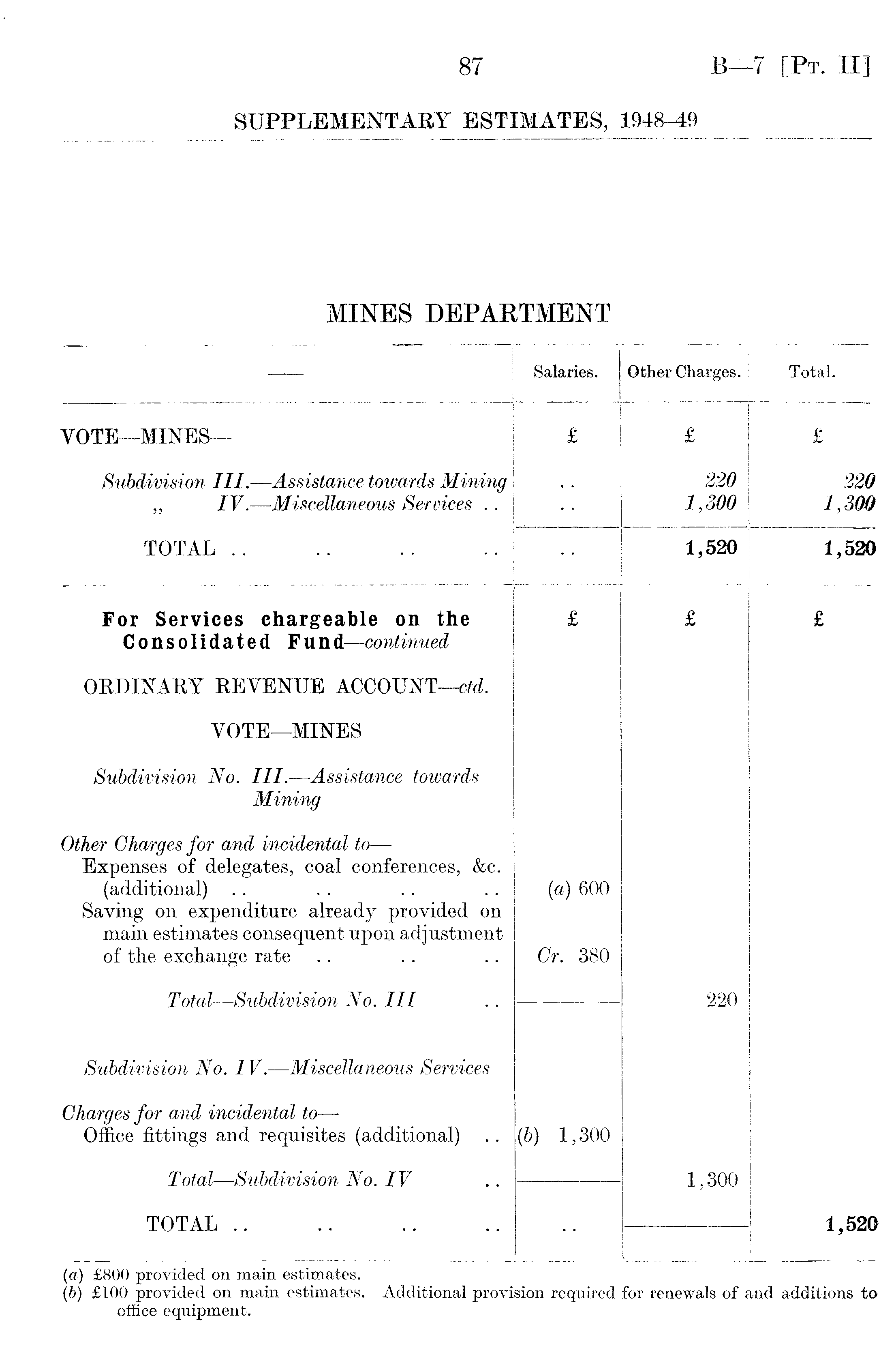 — Salaries. Other Chargés. Total. VOTE—MINES— £ £ £ Subdivision III. —Assistance towards Mining „ IV.—Miscellaneous Services .. 220 1,300 220 1,300 TOTAL .. 1,520 1,520 For Services chargeable on the Consolidated Fund—continued £ £ £ ORDINARY REVENUE ACCOUNT—ctd. VOTE—MINES Subdivision No. III. —Assistance towards Mining - Other Chargés for and incidental to — Expenses of delegates, coal conferences, &c. (additional) Saving on expenditure already provided on main estimates consequent upon adjustment of the exchange rate (a) 600 Cr. 380 Total —Subdivision No. III 220 Subdivision No. IV. —Miscellaneous Services Chargés for and incidental to — Office fittings and requisites (additional) (b) 1,300 Total—Subdivision No. IV 1,300 TOTAL .. 1,520 (а) £800 provided on main estimates. (б) £100 provided on main estimates. Additional provision required for renewals of and additions to office equipment.