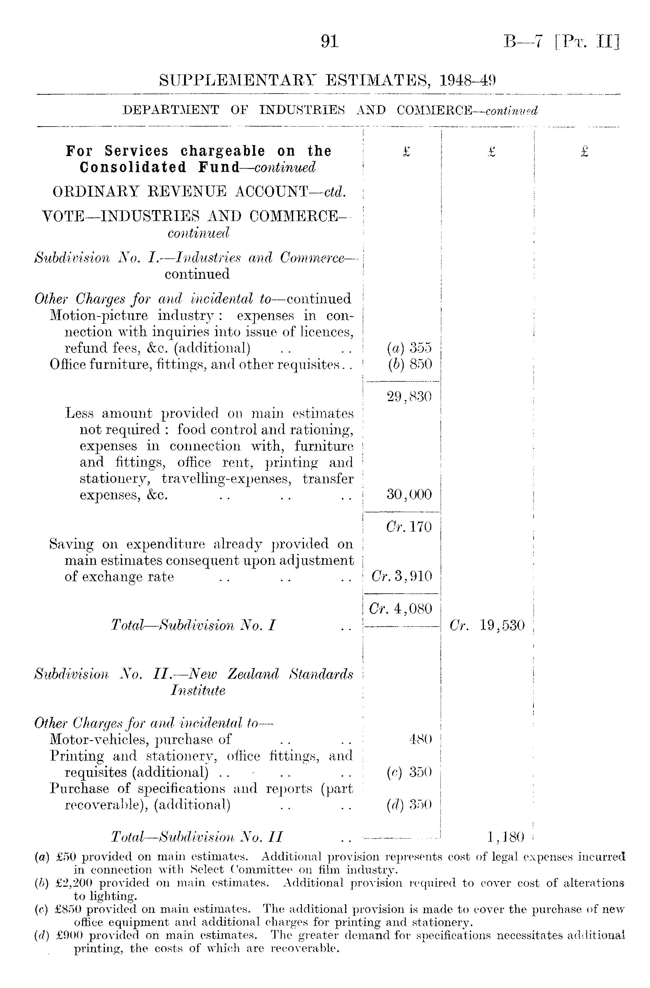 For Services chargeable on the Consolidated Fund —continued £ £ £ ORDINARY REVENUE ACCOUNT—ctd. VOTE—INDUSTRIES AND COMMERCE— continued Subdivision No. I. —Industries and Commerce— continued Other Chargés for and incidental to—continued Motion-picture industry: expenses in connection with inquiries into issue of licences, refund fees, &e. (additional) Office furniture, fittings, and other requisites.. (a) 355 (b) 850 Less amount provided on main estimates not required : food control and rationing, expenses in connection with, furniture and fittings, office rent, printing and stationery, travelling-expenses, transfer expenses, &c. ... .. 29,830 30,000 Saving on expenditure already provided on main estimates consequent upon adjustment of exchange rate .. .. Cr. 170 Cr. 3,910 Total—Subdivision No. I Cr. 4,080 Cr. 19,530 Subdivision No. II.—New Zealand Standards Institute Other Chargés for and incidental to — Motor-vehicles, purchase of Printing and stationery, office fittings, and requisites (additional) Purchase of specifications and reports (part recoverable), (additional) 480 (c) 350 (d) 350 Total —Subdivision No. II 1.180