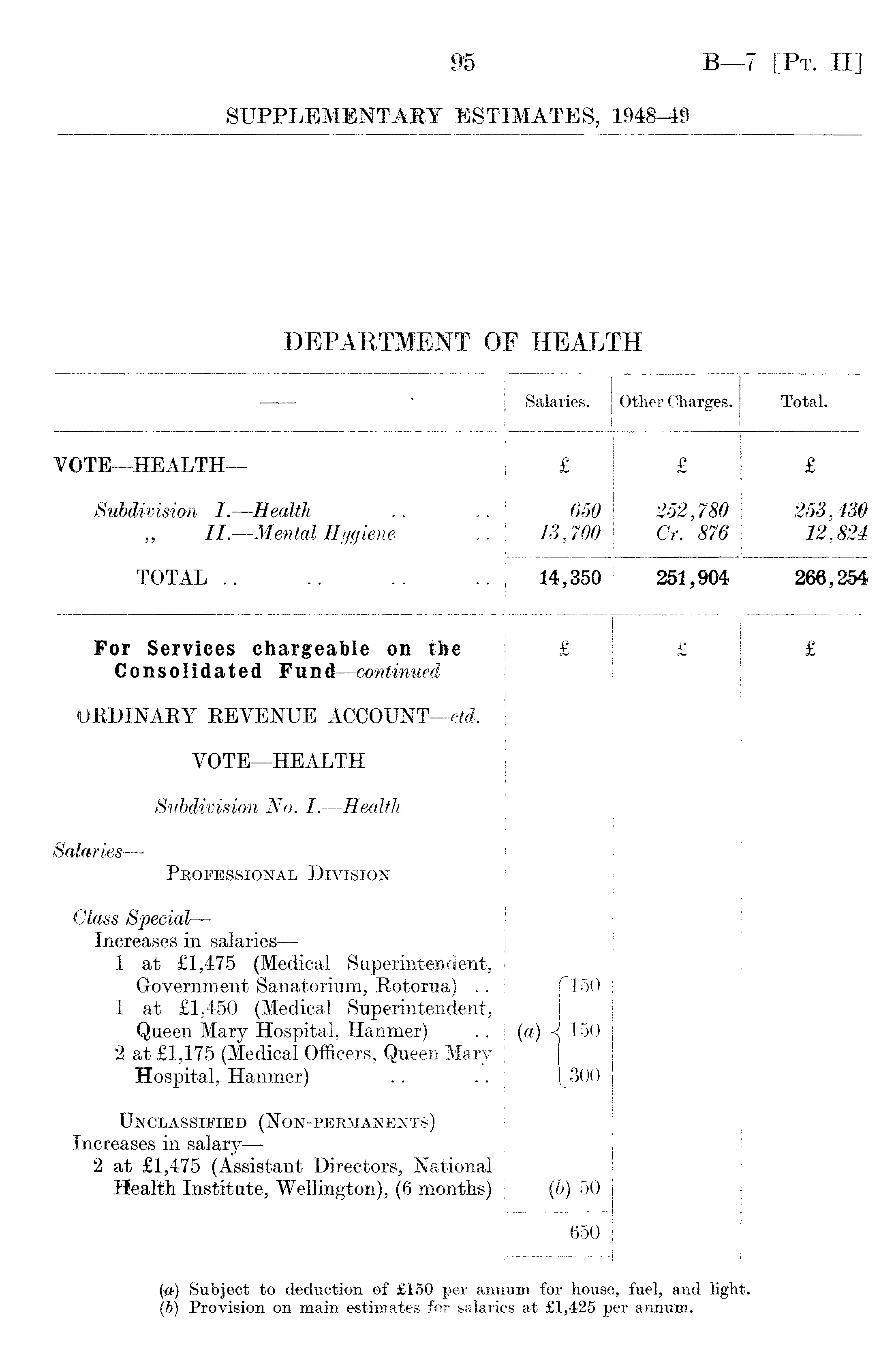 -—- i Salaries. Other Chargés. Total. VOTE—HEALTH— £ £ £ Subdivision I.—Health „ II.—Mental Hygiene 650 13,700 252,780 Cr. 876 253,430 12,824 TOTAL .. i 14,350 1 251,904 266,254 For Services ehargeable on the Consolidated Fvtnå—eontinued £ £ £ ORDINARY REVENUE ACCOUNT —ctd. VOTE—HEALTH Subdivision No. I. —Health Salaries— Professional Division i Class Special— Increases in salaries — 1 at £1,475 (Medical Superintendent. Government Sanatorium, Rotorua) .. 1 at £1,450 (Medical Superintendent, Queen Mary Hospital, Hanmer) 2 at £1,175 (Medical Officers, Queen Mary Hospital, Hanmer) («) <j 1 f 150 ; 150 1^300 | i i Unclassified (Non-permanents) Increases in salary— 2 at £1,475 (Assistant Directors, National Health Institttte, Wellington), (6 months) (6)50 650 (iø) Sufojéet to deduction of £150 per annum for house (b) Provision on main estimates for salaries at £1,425 p s, fuel, and Eght. er annum.