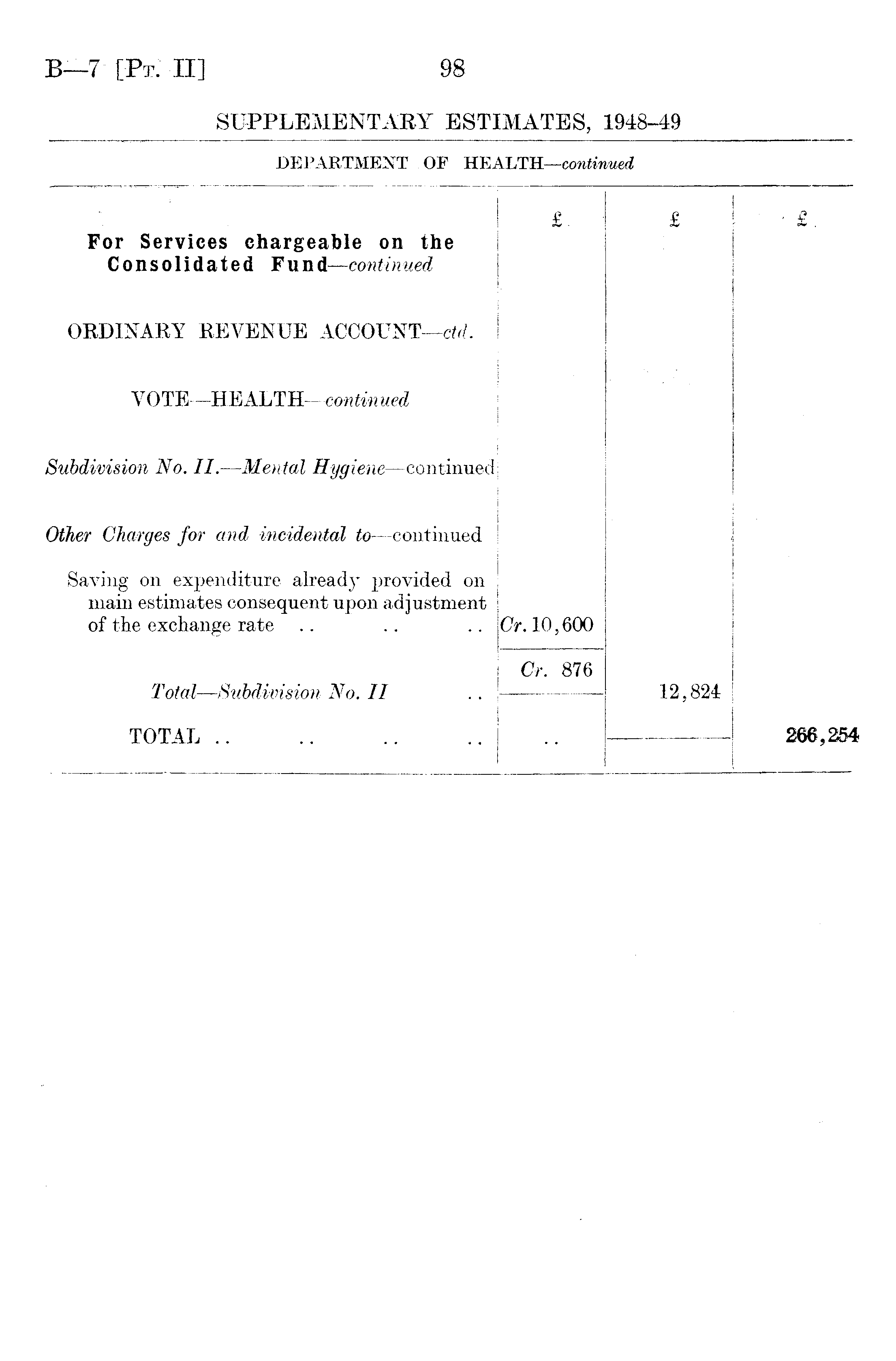 For Services chargeable on the Consolidated Fund—continued £. . £ - £ ORDINARY REVENUE ACCOUNT —ctd. V OTE—HE ALTH—continued Subdivision No. II.—Mental Hygiene —continued j Other Charges for and incidental to —continued Saving on expenditure already provided on main estimates consequent upon adjustment of the exchange rate Cr. 10,600 Total —Subdivision No. II TOTAL Cr. 876 12,824 266,254
