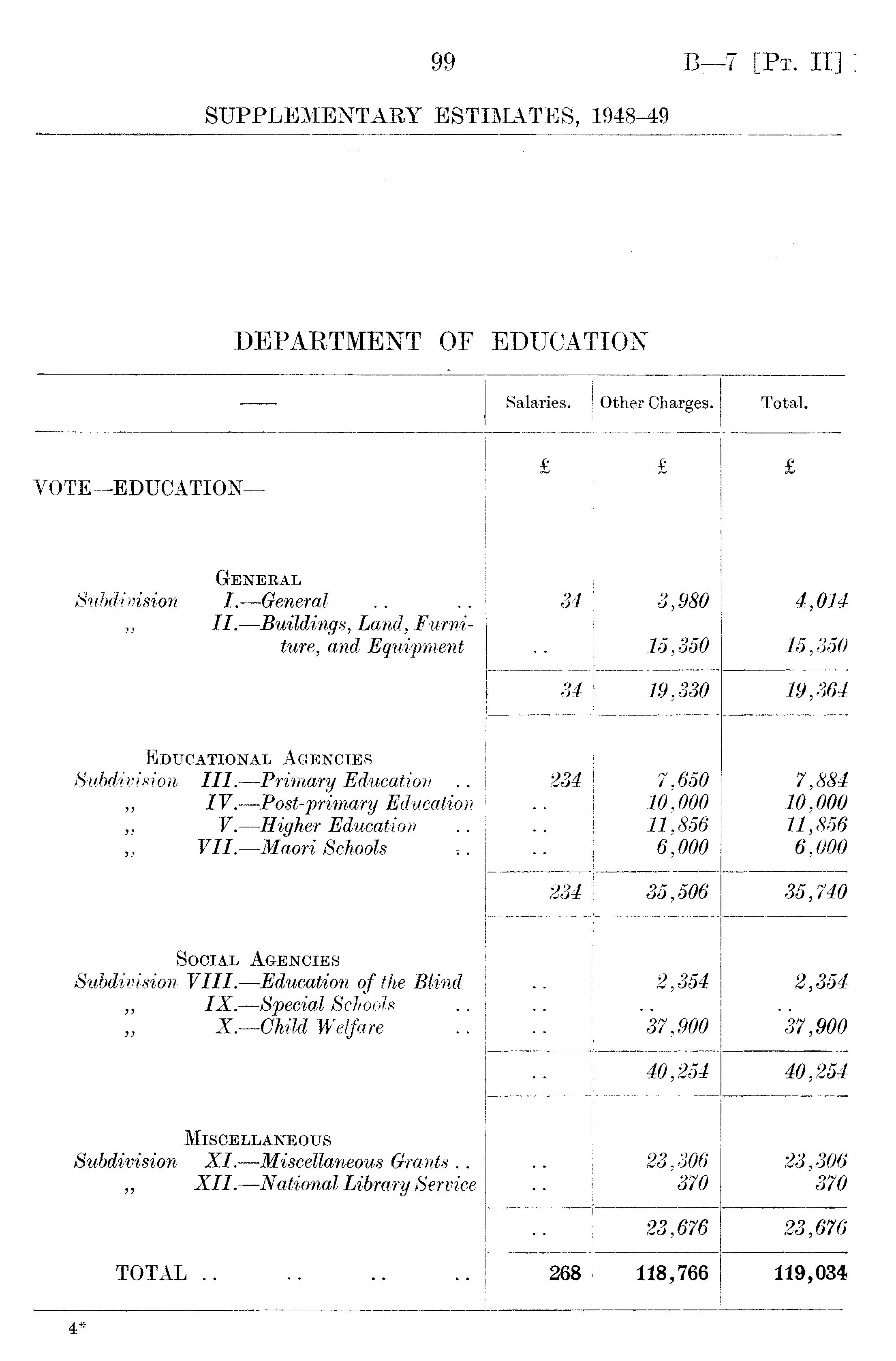 — I Salaries. Other Chargés. Total. Y OTE —EDUCATION— £ £ £ General Subdivision I.—General „ II.—Buildings, Land, Furniture, and Equipment 34 3,980 15,350 4,014 15,350 34 19,330 19,364 Educational Agencies Subdivision III.—Primary Education ,, IV.—Post-primary Education ,, V. —Higher Education „ VII. —Maori Schools •.. 234 7,650 10,000 11,856 6,000 7,884 10,000 11,856 6,000 234 35,506 35,740 Sooial Agencies Subdivision VIII. —-Education of the Blind „ IX.—Special Schools „ X.—Child Welfare 2,354 37,900 2,354 37,900 40,254 40,254 Miscellaneous Subdivision XI.—Miscellaneous Grants .. ,, XII.—National Library Service 23,306 370 23,306 370 23,676 23,676 TOTAL .. 268 1 118,766 119,034 4*