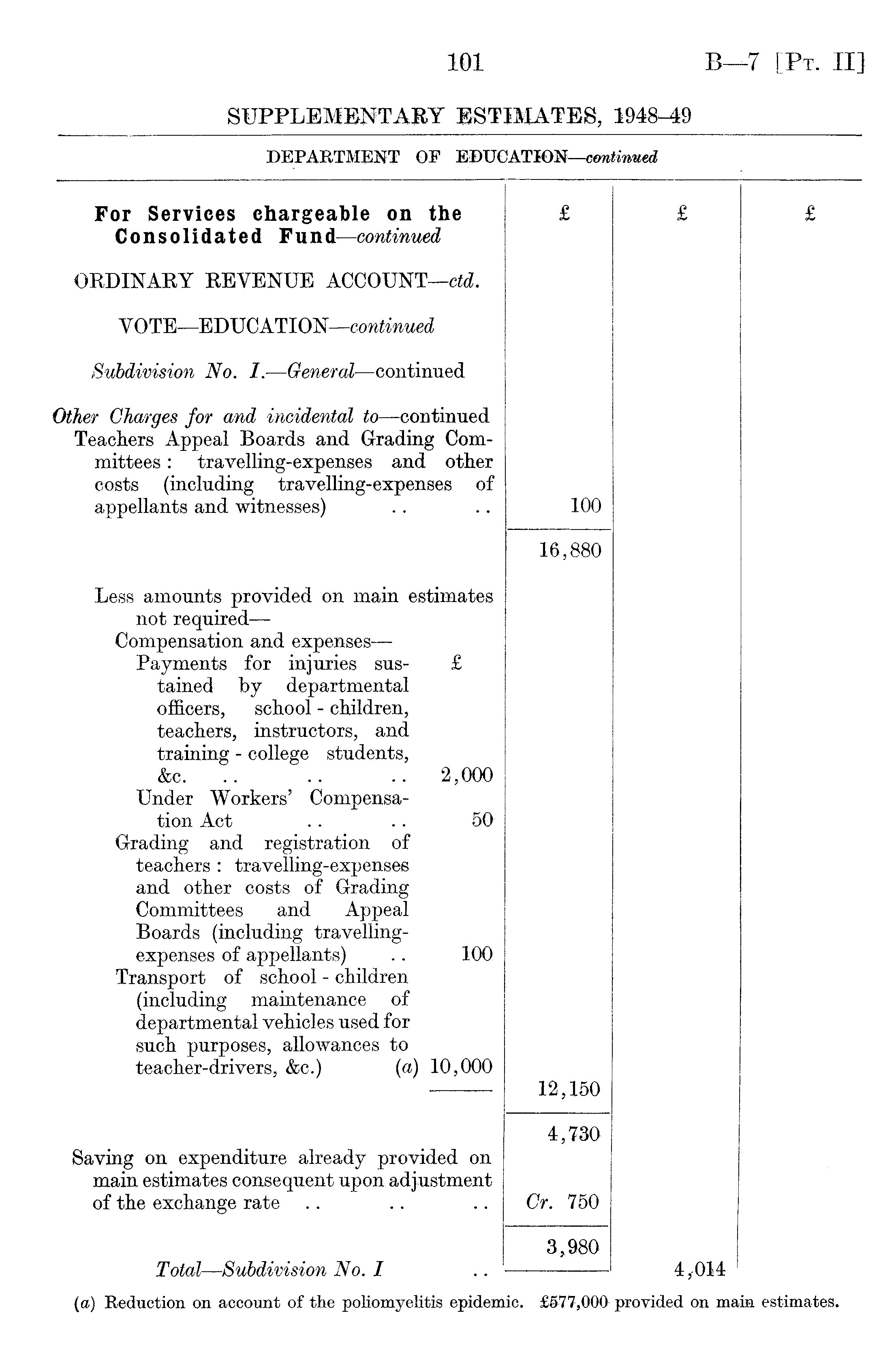 For Services chargeable on the Consolidated Fund—continued £ £ £ ORDINARY REVENUE ACCOUNT —ctd. YOTE —EDUCATION —continued Subdivision No. I. —General—continued Other Charges for and incidental to—continued Teachers Appeal Boards and Grading Committees : travelling-expenses and other costs (including travelling-expenses of appellants and witnesses) 100 Less amounts provided on main estimates not required — Compensation and expenses — Payments for injuries sus- £ tained by departmental officers, school - children, teachers, instructors, and training - college students, &c. .. .. .. 2,000 Under Workers' Compensation Act .. .. 50 Grading and registration of teachers : travelling-expenses and other costs of Grading Committees and Appeal Boards (including travellingexpenses of appellants) .. 100 Transport of school - children (including maintenance of departmental vehicles used for such purposes, allowances to teacher-drivers, &c.) (a) 10,000 16,880 12,150 Saving on expenditure already provided on main estimates consequent upon adjustment of the exchange rate 4,730 Cr. 750 Total—Subdivision No. I 3,980 4,0 14 (a) Reduction on account of the poliomyelitis epidemic. £577,000 provided on main estimates.