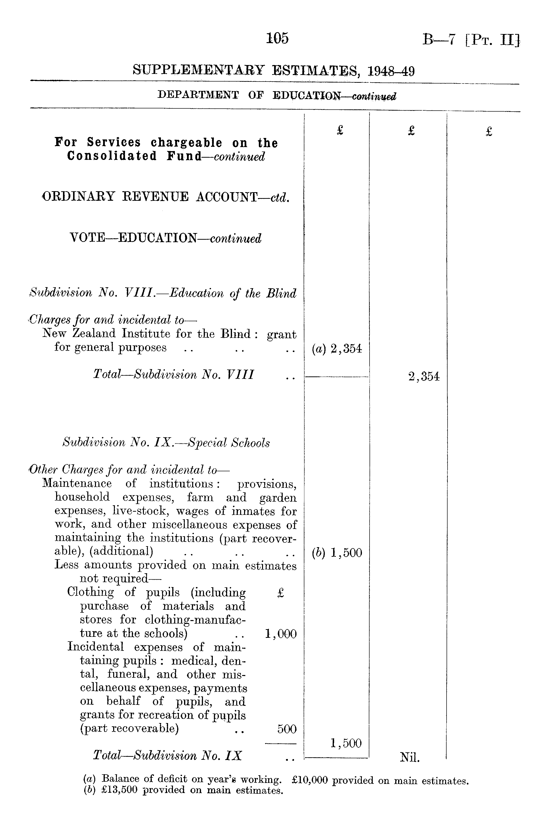 For Services chargeable on the Consolidated Fund—continued 1 £ £ ORDINARY REVENUE ACCOUNT—ctd. VOTE —EDUCATION—continued Subdivision No. VIII.—Education of the Blind Charges for and incidental to— New Zealand Institute for the Blind : grant for general purposes (a) 2,354 Total—Subdivision No. VIII 2,354 Subdivision No. IX.—Special Schools Other Charges for and incidental to— Maintenance of institutions: provisions, household expenses, farm and garden expenses, live-stock, wages of inmates for work, and other miscellaneous expenses of maintaining the institutions (part recoverable), (additional) Less amounts provided on main estimates not required— Clothing of pupils (including £ purchase of materials and stores for clothing-manufac-ture at the schools) .. 1,000 Incidental expenses of maintaining pupils : medical, dental, funeral, and other miscellaneous expenses, payments on behalf of pupils, and grants for recreation of pupils (part recoverable) ,. 500 Total—Subdivision No. IX (6> 1,500 1,500 Nil. (a) Balance of deficit on year's working. £10,000 provided on main estimates. (b) £13,500 provided on main estimates.