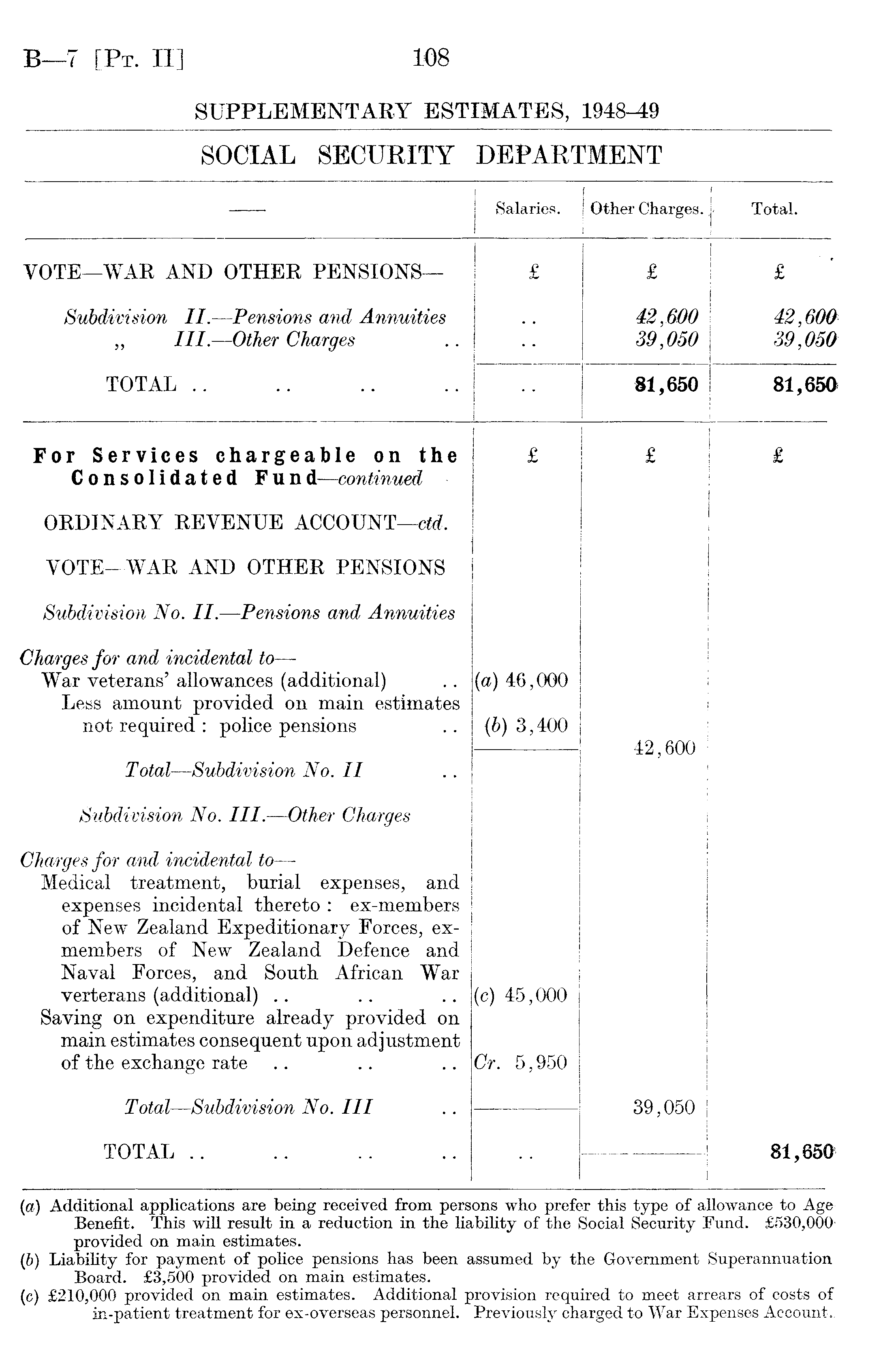 — Salaries. [ Other Chargés. i | Total. VOTE—WAR AND OTHER PENSIONS— £ £ £ Subdivision II. —Pensions and Annuities „ III.—Other Chargés 42,600 39,050 42,600 39,050 TOTAL .. 81,650 81,650 For Services chargeable on the Consolidated Fund—continued i £ £ £ ORDINARY REVENUE ACCOUNT—etø. YOTE —W AR AND OTHER PENSIONS Subdivision No. II.—Pensions and Annuities Chargés for and incidental to — War veterans' allowances (additional) Less amount provided on main estimates not required : police pensions (a) 46,000 (b) 3,400 42,600 Total —Subdivision No. II Subdivision No. III. —Other Chargés Chargés for and incidental to — Medical treatment, burial expenses, and expenses incidental thereto : ex-members of New Zealand Expeditionafy Forces, exmembers of New Zealand Defence and Naval Forces, and South. African War verterans (additional) Saving on expenditure already provided on main estimates consequent npon adjustment of the exchange rate (c) 45,000 Cr. 5,950 Total —Subdivision No. III 39,050 TOTAL .. 81,65» 1