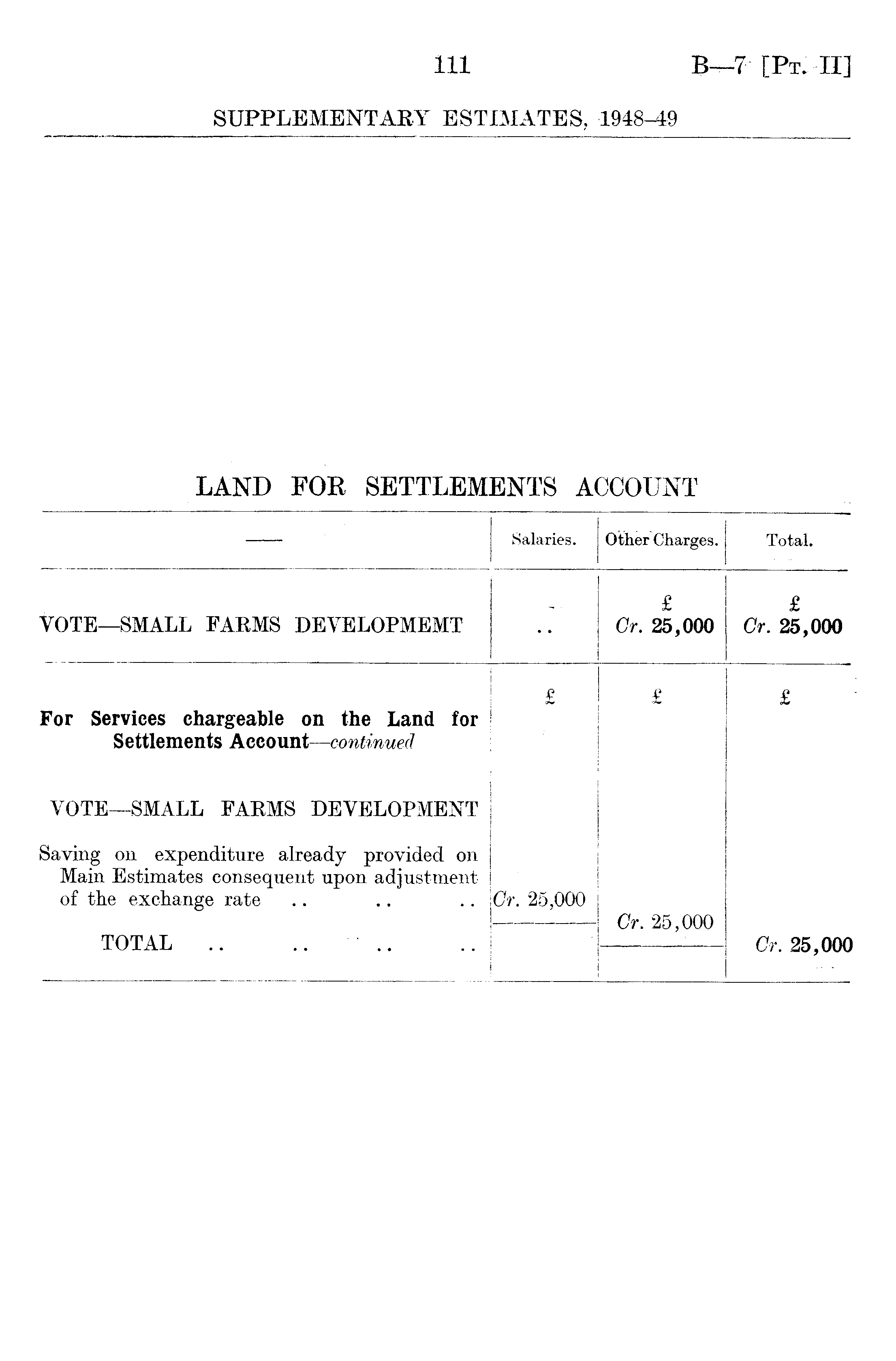 — Salaries. Other Chargés. Total. VOTE—SMALL FARMS DEYELOPMEMT £ Cr. 25,000 £ Cr. 25,000 For Services chargeable on the Land for Settlements Account—continued £ < £ £ YOTE—SMALL FARMS DEVELOPMENT Saving on expenditure already provided on Main Estimates conseqnent upon adjustment of the exchange rate Cr. 25,000 Cr. 25,000 TOTAL .. .. .. Cr. 25,000