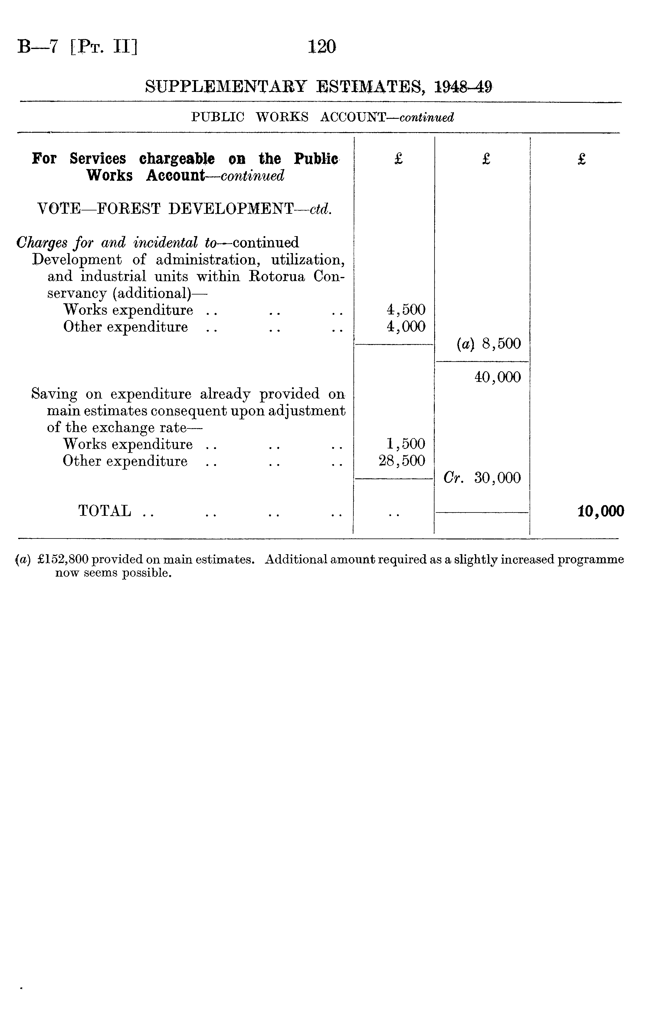 For Services chargeable on the Public Works Account—continued £ £ £ VOTE—FOREST DEVELOPMENT —ctd. Charges for and incidental to—continued Development of administration, utilization, and industrial units within Rotorua Conservancy (additional) — Works expenditure Other expenditure 4,500 4,000 (a) 8,500 Saving on expenditure already provided on main estimates consequent upon adjustment of the exchange rate — Works expenditure Other expenditure 1,500 28,500 40,000 Or. 30,000 TOTAL .. 10,000 (a) £152,800 provided on main estimates. Additional amount required a now seems possible. ts a slightly increased programme