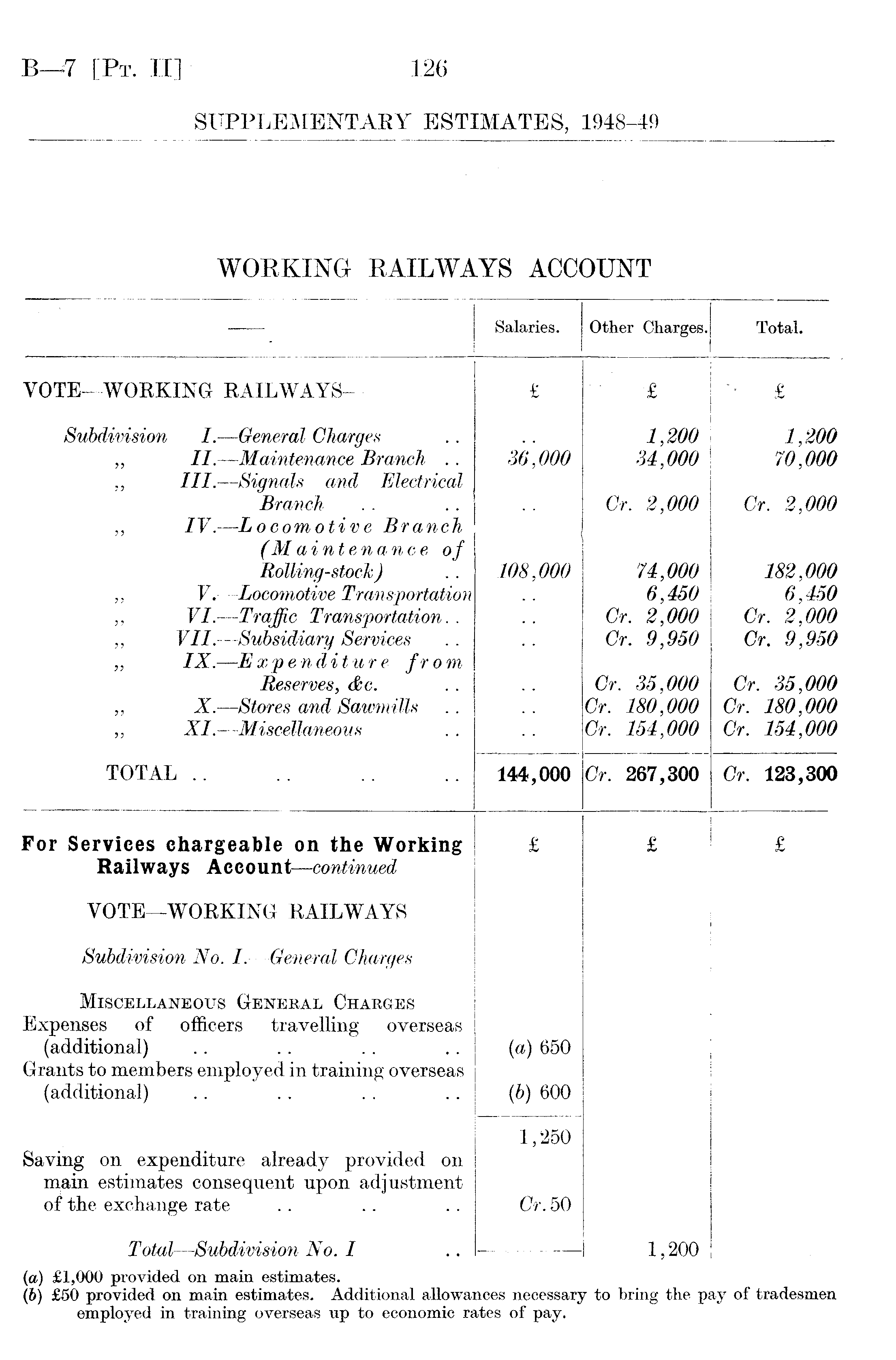 — Salaries. Other Chargés. Total. V OTE —W ORKIN G RAILWAYS — £ -- ' £ Subdivision 1. —General Chargés „ II.—Maintenance Branch .. „ III. —Signals and Electrical Branch „ IV.—Locomotive Branch (Maintenance of Rolling-stock ) „ V. —Locomotive Transportation „ VI. —Trqffic Transportation.. „ VU. —Subsidiary Services „ IX.—-E x pen di tur e from Reserves, &c. „ X.—Stores and Sawmills „ XI.—Miscellaneous 36,000 108,000 1,200 34,000 Cr. 2,000 74,000 6,450 Cr. 2,000 Cr. 9,950 Cr. 35,000 Cr. 180,000 Cr. 154,000 1,200 70,000 Cr. 2,000 182,000 6,450 Cr. 2,000 Cr. 9,950 Cr. 35,000 Cr. 180,000 Cr. 154,000 TOTAL .. 144,000 Cr. 267,300 Cr. 123,300 For Services chargeable on the Working Railways Account —continued £ £ 1 £ VOTE—WORKING RAILWAYS Subdivision No. I. —General Chargés Miscellaneous General Chargés Expenses of officers travelling overseas (additional) Grants to members employed in training overseas (additional) (a) 650 (b) 600 i Saving on expenditure already provided on main estimates consequent upon adjustment of the exchange rate 1,250 Cr. 50 Total —Subdivision No. I 1,200 (a) £1,000 provided on main estimates. (b) £50 provided on main estimates. Additional allowances necessary to bring the pay of tradesmen employed in training overseas up to economic rates of pay.