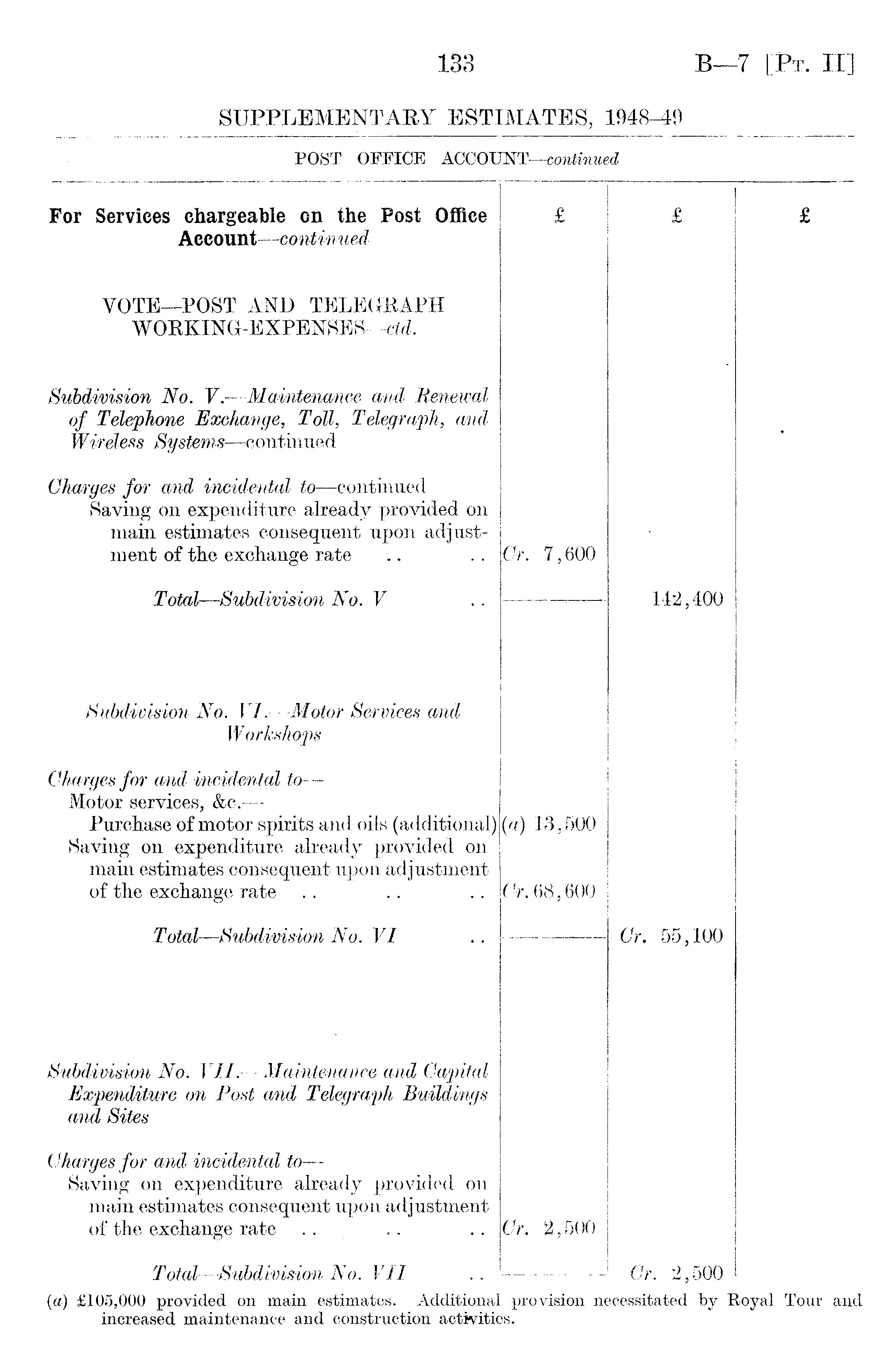 For Serviees chargeable on the Post Office Account —continued £ £ £ YOTE—POST AND TELEGRAPH W ORKIN G-EXPEN BES—eld. Subdivision No. V.—Maintenance and Renewal of Télephone Exchange, Toll, Telegraph, and Wireless Systems—continued • Chargés for and incidental to —continued Saving on expenditure already provided on main estimates consequent upon adjustment of the exchange rate Cr. 7,600 Total —Subdivision No. V 142,400 Subdivision No. VI. —Motor Services and Workshops Chargés for and incidental to— Motor services, &c.— Purchase of motor spirits and oils (additional) Saving on expenditure already provided 011 main estimates consequent upon adjustment of the exchange rate (a) 13,500 Cr. 68,600 Total —Subdivision No. VI Cr. 55,100 Subdivision No. VII. —Maintenance and Capital Expenditure on Post and Telegraph Buildings and Sites Chargés for and incidental to — Saving on expenditure already provided 011 main estimates consequent upon adjustment of the exchange rate Cr. 2,500 Total —Subdivision No. VII Cr. 2,500 (a) £105,000 provided on main estimates. Additional provision necessitated by Royal Tour and increased maintenance and construction aetmties.