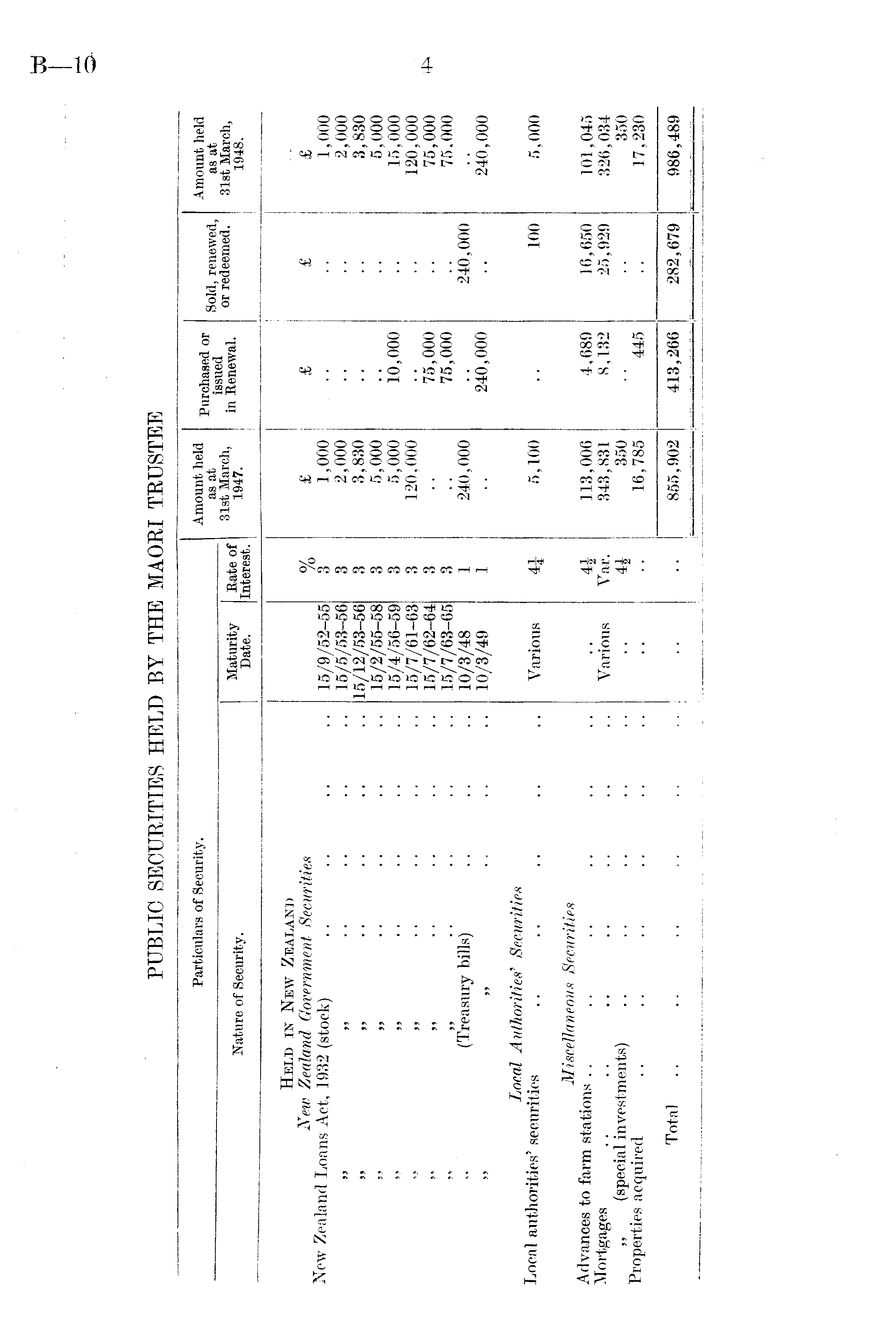 Particulars of Security. Amount held as at Purchased or issued in Renewal. Sold, renewed, or redeemed. Amount held as at Nature of Security. Maturity Date. Rate of Interest. 31st March, 1947. 31st March, 1948. Held in New Zealand New Zealand Government Securities New Zealand Loans Act, 1932 (stock) 99 99 99 99' 99 99 99 99 99 99 • • 99 99 „ (Treasury bilis) 15/9/52-55 15/5/53-56 15/12/53-56 15/2/55-58 15/4/56-59 15/7/61-63 15/7/62-64 15/7/63-65 10/3/48 10/3/49 0/ /o 3 3 3 3 3 3 3 3 1 1 £ 1,000 .2,000 3,830 5,000 5,000 120,000 240,000 £ io,ooo 75,000 75,000 240,000 £ 240,000 & 1,000 2,000 3,830 5,000 15,000 120,000 75,000 75,000 240,000 Local Authorities' Securities Local authorities' securities Various 4i 5,100 100 5,000 Miscellaneous Securities Advances to farm stations Mortgages „ (speeial investments) Properties acquired Various 4£ Var. 4i 113,006 343,831 350 16,785 4,689 8,132 445 16,650 25,929 101,045 326,034 350 17,230 Total 855,902 413,266 1====== 282,679 986,489