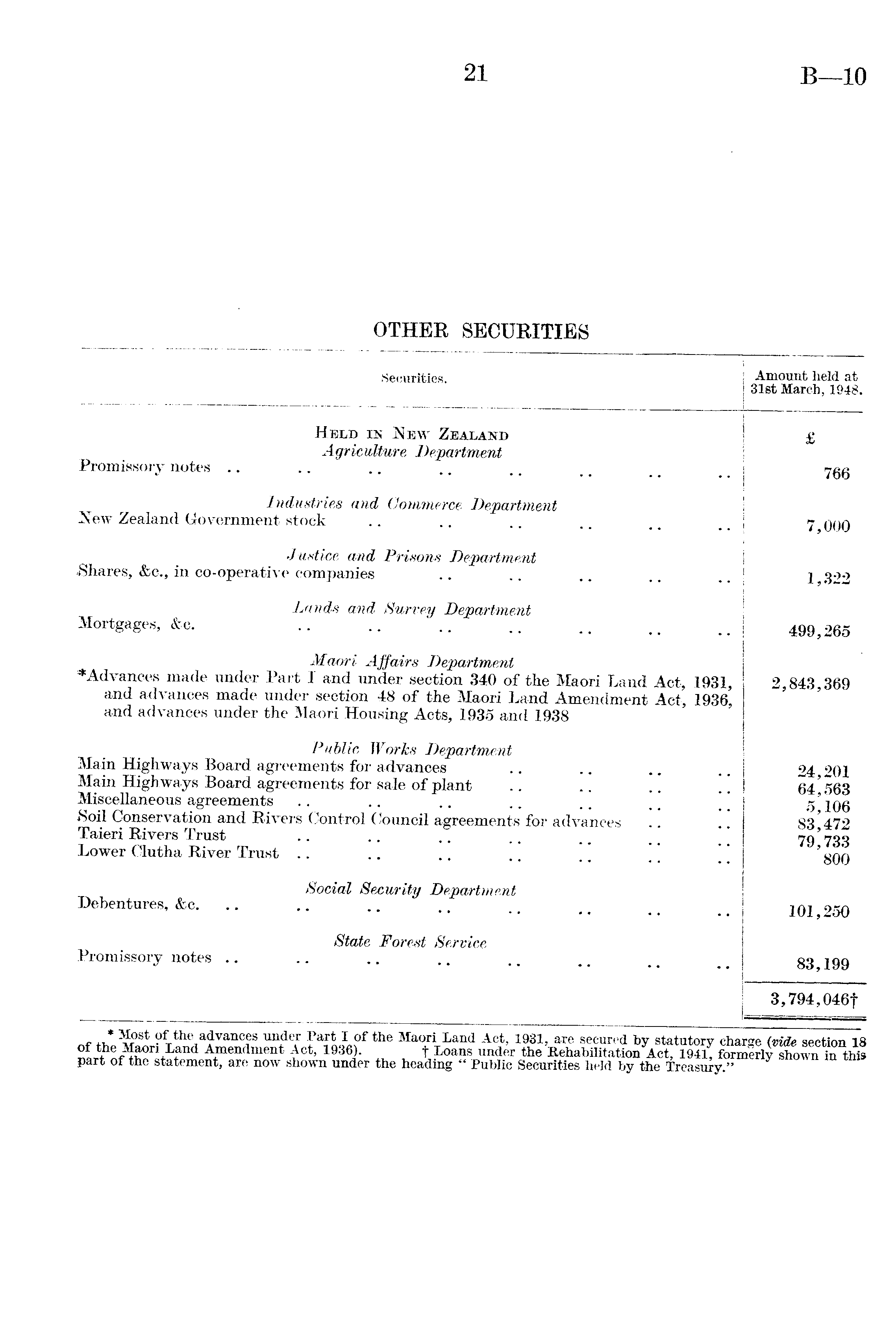 Securities. Amount held at 31st March, 1948. Held in New Zealand Agriculture Department Promissory notes £ 766 Industries and Commerce Department New Zealand Government stock 7,000 Justice and Prisons Department Shares, &c., in co-operative companies 1,322 Lands and Survey Department Mortgages, &c. 499,265 Maori Affairs Department ♦Advances made under Part 1 and under section 340 of the Maori Land Act, 1931, and advances made under section 48 of the Maori Land Amendment Act, 1936' and advances under the Maori Housing Acts, 1935 and 1938 2,843,369 Public Works Department Main Highways Board agreements for advances Main Highways Board agreements for sale of plant .. .. .. Miscellaneous agreements Soil Conservation and Rivers Control Council agreements for advances .. .. Taieri Rivers Trust Lower Clutha River Trust 24,201 64,563 5,106 83,472 79,733 800 Social Security Department Debentures, &c. 101,250 State Forest Service Promissory notes 83,199 3,794,046f