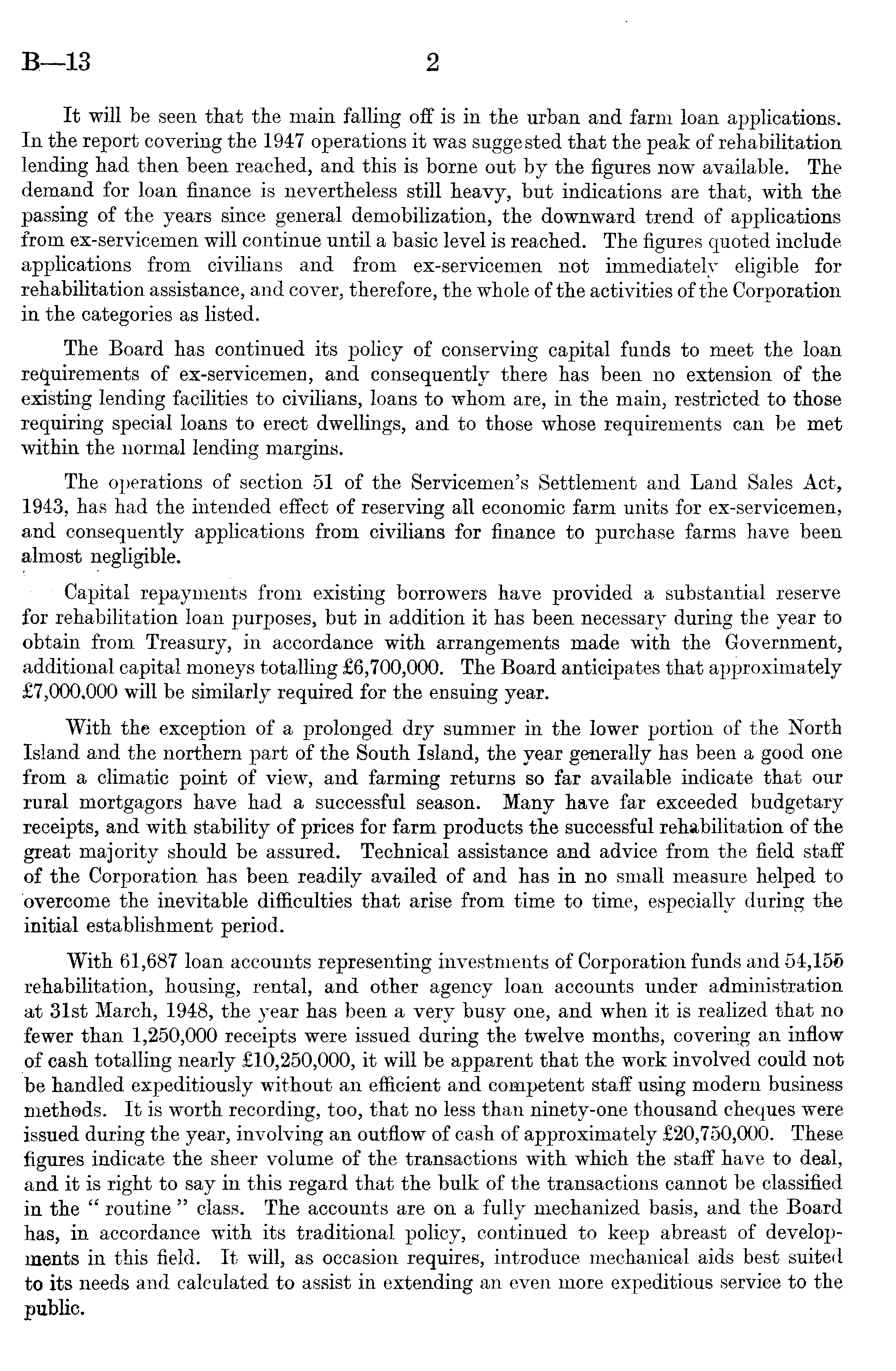 It will be seen that the main falling off is in the urban and farm loan applications. In the report covering the 1947 operations it was suggested that the peak of rehabilitation lending had then been reached, and this is borne out by the figures now available. The demand for loan finance is nevertheless still heavy, but indications are that, with the passing of the years since general demobilization, the downward trend of applications from ex-servicemen will continue until a basic level is reached. The figures quoted include applications from civilians and from ex-servicemen not immediately eligible for rehabilitation assistance, and cover, therefore, the whole of the activities of the Corporation in the categories as listed. The Board has continued its policy of conserving capital funds to meet the loan requirements of ex-servicemen, and consequently there has been no extension of the existing lending facilities to civilians, loans to whom are, in the main, restricted to those requiring special loans to erect dwellings, and to those whose requirements can be met within the normal lending margins. The operations of section 51 of the Servicemen's Settlement and Land Sales Act, 1943, has had the intended effect of reserving all economic farm units for ex-servicemen, and consequently applications from civilians for finance to purchase farms have been almost negligible. Capital repayments from existing borrowers have provided a substantial reserve for rehabilitation loan purposes, but in addition it has been necessary during the year to obtain from Treasury, in accordance with arrangements made with the Government, additional capital moneys totalling £6,700,000. The Board anticipates that approximately £7,000,000 will be similarly required for the ensuing year. With the exception of a prolonged dry summer in the lower portion of the North Island and the northern part of the South Island, the year generally has been a good one from a climatic point of view, and farming returns so far available indicate that our rural mortgagors have had a successful season. Many have far exceeded budgetary receipts, and with stability of prices for farm products the successful rehabilitation of the great majority should be assured. Technical assistance and advice from the field staff of the Corporation has been readily availed of and has in no small measure helped to overcome the inevitable difficulties that arise from time to time, especially during the initial establishment period. With 61,687 loan accounts representing investments of Corporation funds and 54,156 rehabilitation, housing, rental, and other agency loan accounts under administration at 31st March, 1948, the year has been a very busy one, and when it is realized that no fewer than 1,250,000 receipts were issued during the twelve months, covering an inflow of cash totalling nearly £10,250,000, it will be apparent that the work involved could not be handled expeditiously without an efficient and competent staff using modern business methods. It is worth recording, too, that no less than ninety-one thousand cheques were issued during the year, involving an outflow of cash of approximately £20,750,000. These figures indicate the sheer volume of the transactions with which the staff have to deal, and it is right to say in this regard that the bulk of the transactions cannot be classified in the " routine " class. The accounts are on a fully mechanized basis, and the Board has, in accordance with its traditional policy, continued to keep abreast of developments in this field. It will, as occasion requires, introduce mechanical aids best suited to its needs and calculated to assist in extending an even more expeditious service to the public.