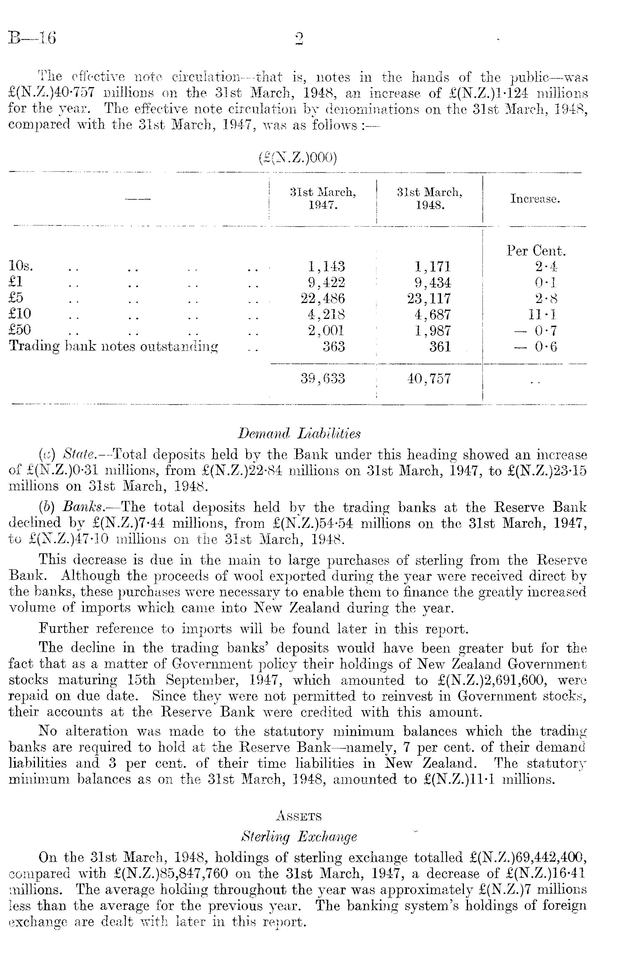 The effective note circulation —that is, notes in the hands of the public—was £(N.Z.)4O-757 millions on the 31st March, 1948, an increase of £(N.Z.)M24 millions for the year. The effective note circulation by denominations on the 31st March, 1948, compared with the 31st March, 1947, was as follows :
